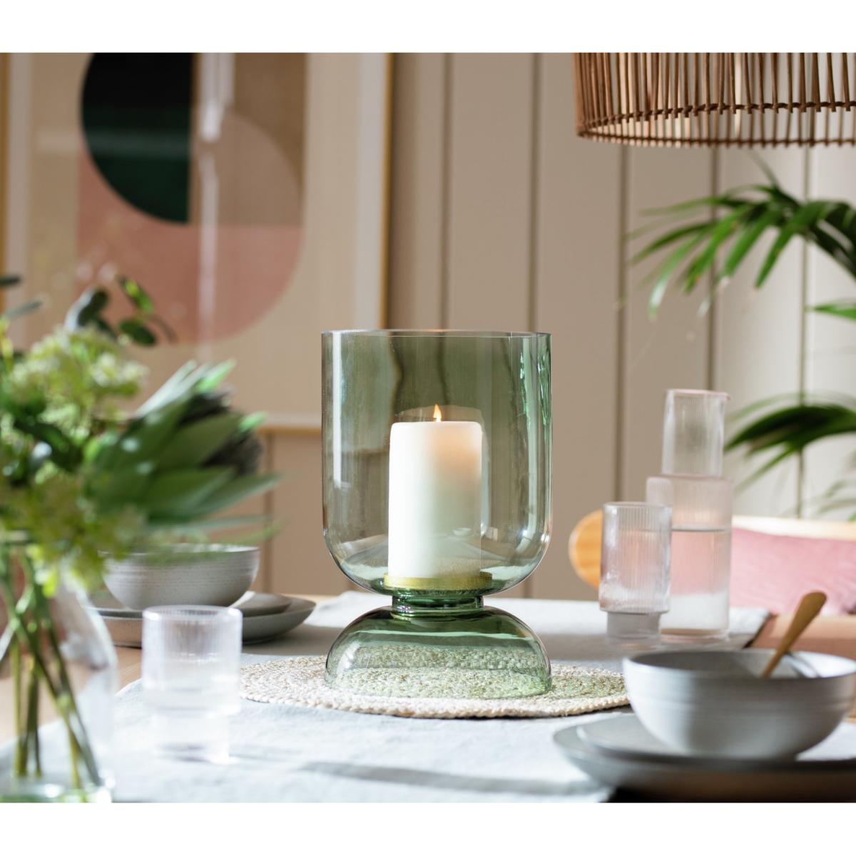 I love this glass hurricane lantern because of its clean, minimalist design which makes it incredibly versatile. It works well in both modern and rustic interiors, adding a subtle touch of sophistication without overpowering the space. I would recommend using it as a centrepiece on dining tables or sideboards, filled with candles or decorative stones, to create cosy ambient lighting. For a more practical approach, it’s perfect for outdoor settings too, providing a safe enclosure for candles against the wind. When styling, consider pairing it with other textured materials like wood or linen to add dimension, and ensure the candle size fits neatly inside without overhanging for a sleek look.