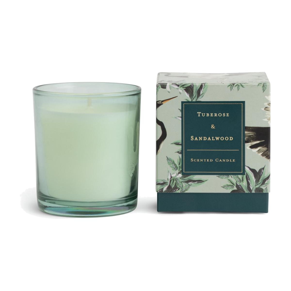 Tuberose and Sandalwood. A match made in heaven. Our scented candle has a rich, deep and decadently sweet aroma. Simply light and let yourself rejuvenate. Comes packaged in a botanical patterned box, the perfect gift. Tuberose & Sandalwood scent. Burn time of 20 hours. Size H8, W7, D7cm. Diameter 7cm.