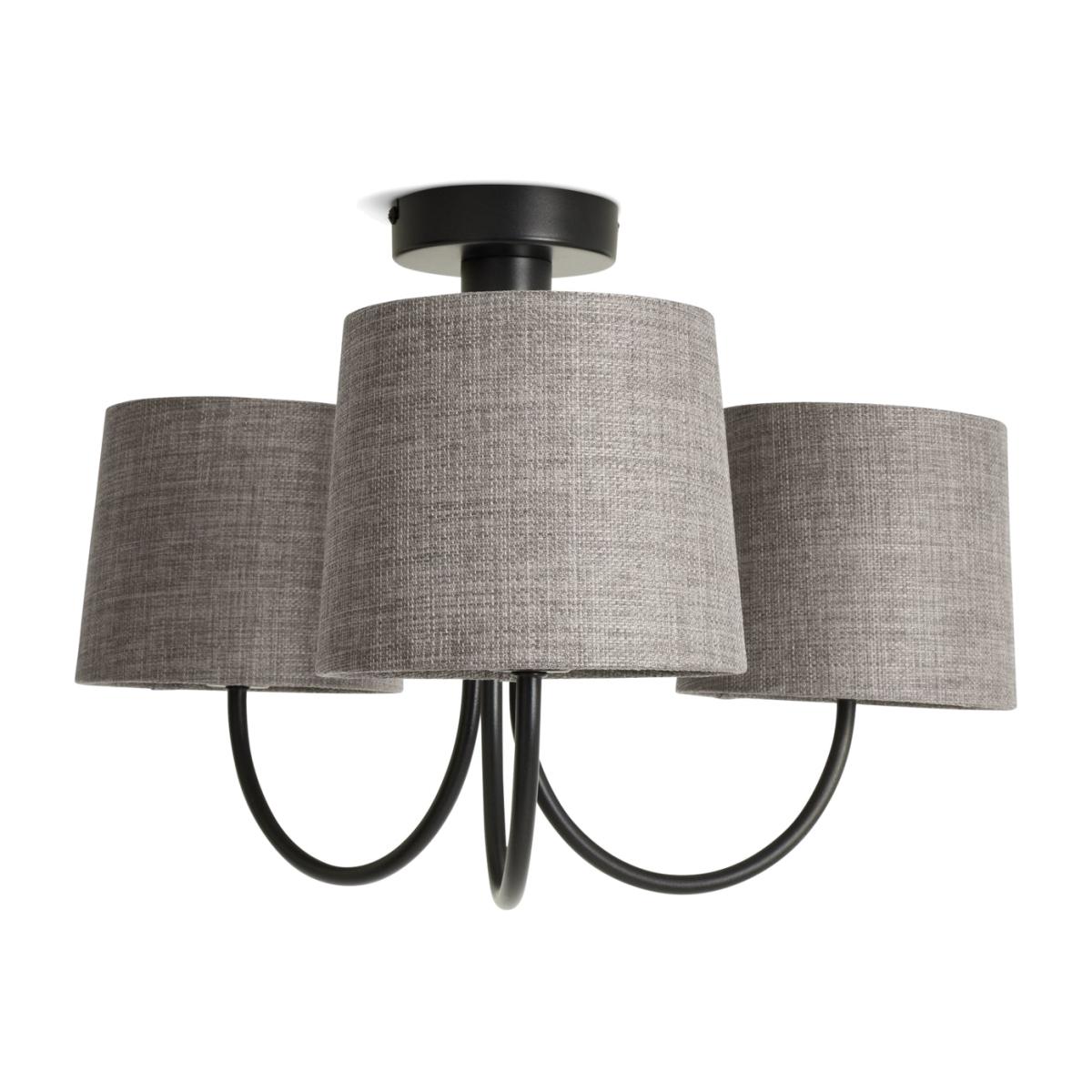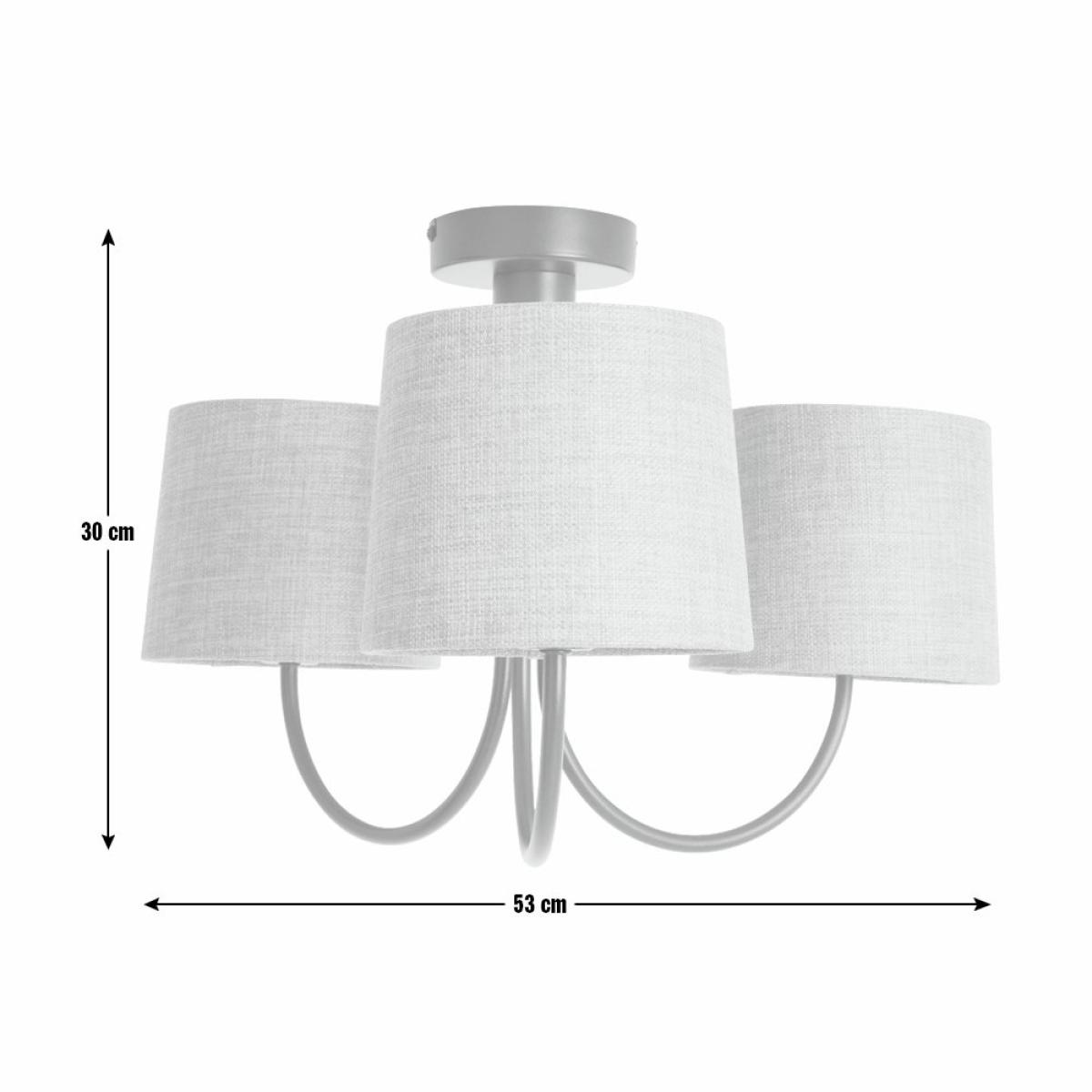 Simple lines, refined elegance. When you want a ceiling light with understated grandeur, our 3-way light delivers. Modern yet comfortably timeless. The slender black curves are forged from metal and topped with linen-like grey fabric shades. A shining example of contemporary country style. Dimensions: Size H30, W53, Diameter 53cm. Bulb Information: Bulbs required 3 x globe E14 small edison screw LED (not included). Recommended maximum wattage: 10 watts. Can not be used with a dimmer switch. General Information: Material: Metal & Fabric. IP rating 20. Weight: 0.95kg. Minimal assembly. Product is hard-wired into electrics. This lighting product is a class 2 fitting. Manufacturer's 1 year guarantee.
