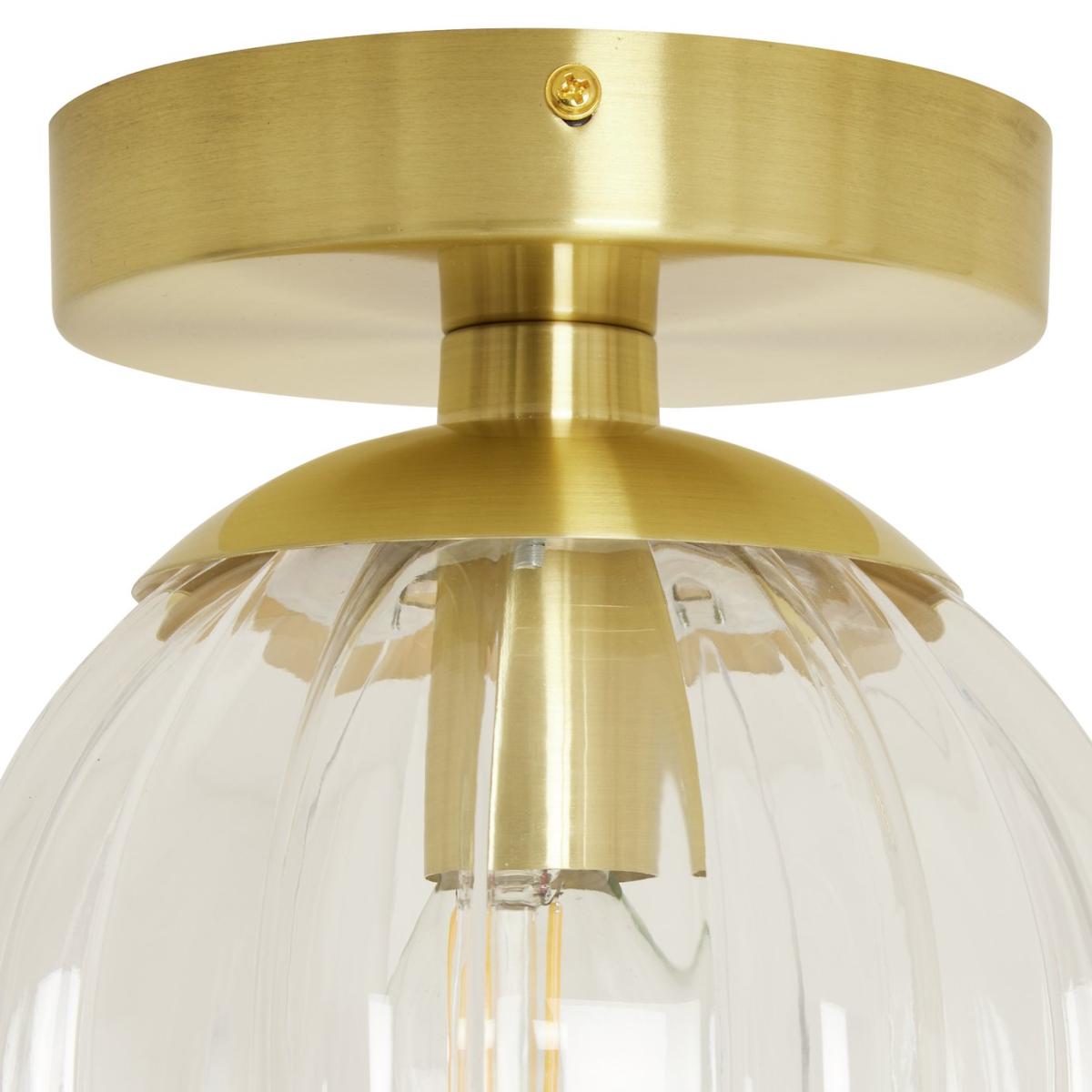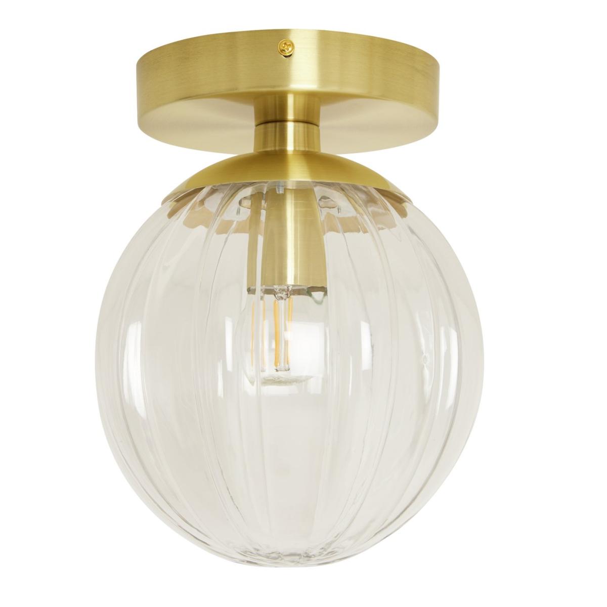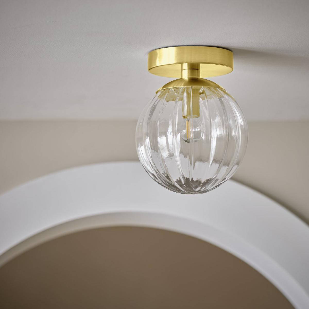 Ready to jazz things up? Bring a dash of vintage glamour to your bathroom with this brushed brass flush ceiling light. The ribbed glass shade adds texture and character, casting a warm, flattering glow that's both timeless and on trend. It's got that effortlessly eclectic feel, think Art Deco meets modern mood lighting. A little luxe for your wash space. Always a good idea. Dimensions: Size H25, W20, D20cm. Diameter 20cm. Non-adjustable drop. Bulb Information: Bulbs required 1 x candle E14 small edison screw LED (not included). Recommended maximum wattage: 10 watts. Can not be used with a dimmer switch. LED bulb only. General Information: Material: 50% Iron, 45% Glass, 5% Plastic. Bathroom Lighting area use: ceiling. IP rating 44 - suitable for use in the bathroom in Zone 2 and outside zones. Weight: 1.33kg. Self-assembly. Product is hard-wired into electrics. This lighting product is a class 2 fitting. Manufacturer's 1 year guarantee.