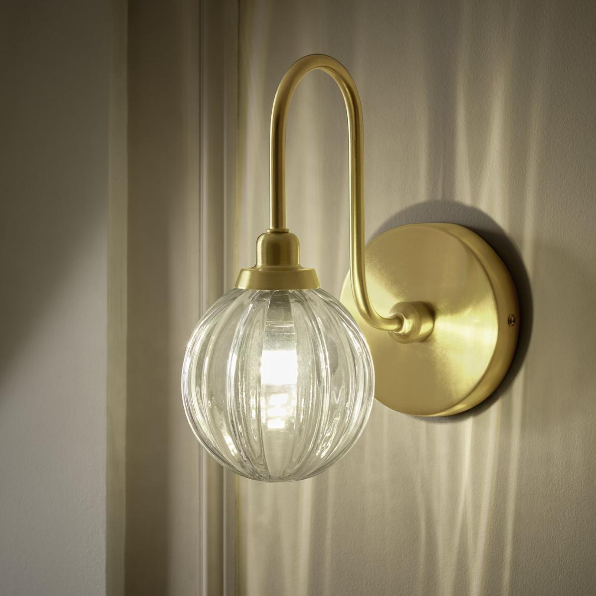 Ready to jazz things up? Bring a dash of vintage glamour to your bathroom with this brushed brass wall light. The ribbed glass shade adds texture and character, casting a warm, flattering glow that's both timeless and on trend. It's got that effortlessly eclectic feel, think Art Deco meets modern mood lighting. A little luxe for your wash space. Always a good idea. Dimensions: Size H25, W12, D22.5cm. Diameter 12cm. Non-adjustable drop. Bulb Information: Bulbs required 1 x classic capsule G9 LED (not included). Recommended maximum wattage: 5 watts. Can not be used with a dimmer switch. LED bulb only. General Information: Material: 50% Iron, 45% Glass, 5% Plastic. Bathroom Lighting area use: wall. IP rating 44 - suitable for use in the bathroom in Zone 2 and outside zones. Weight: 0.74kg. Self-assembly. Product is hard-wired into electrics. This lighting product is a class 2 fitting. Manufacturer's 1 year guarantee.