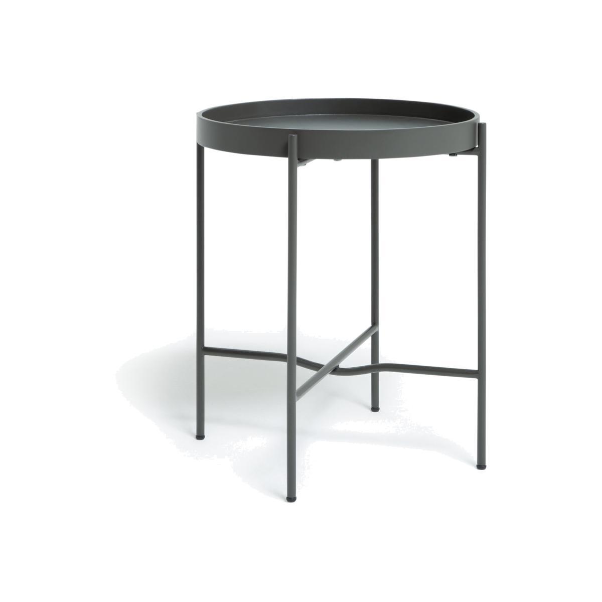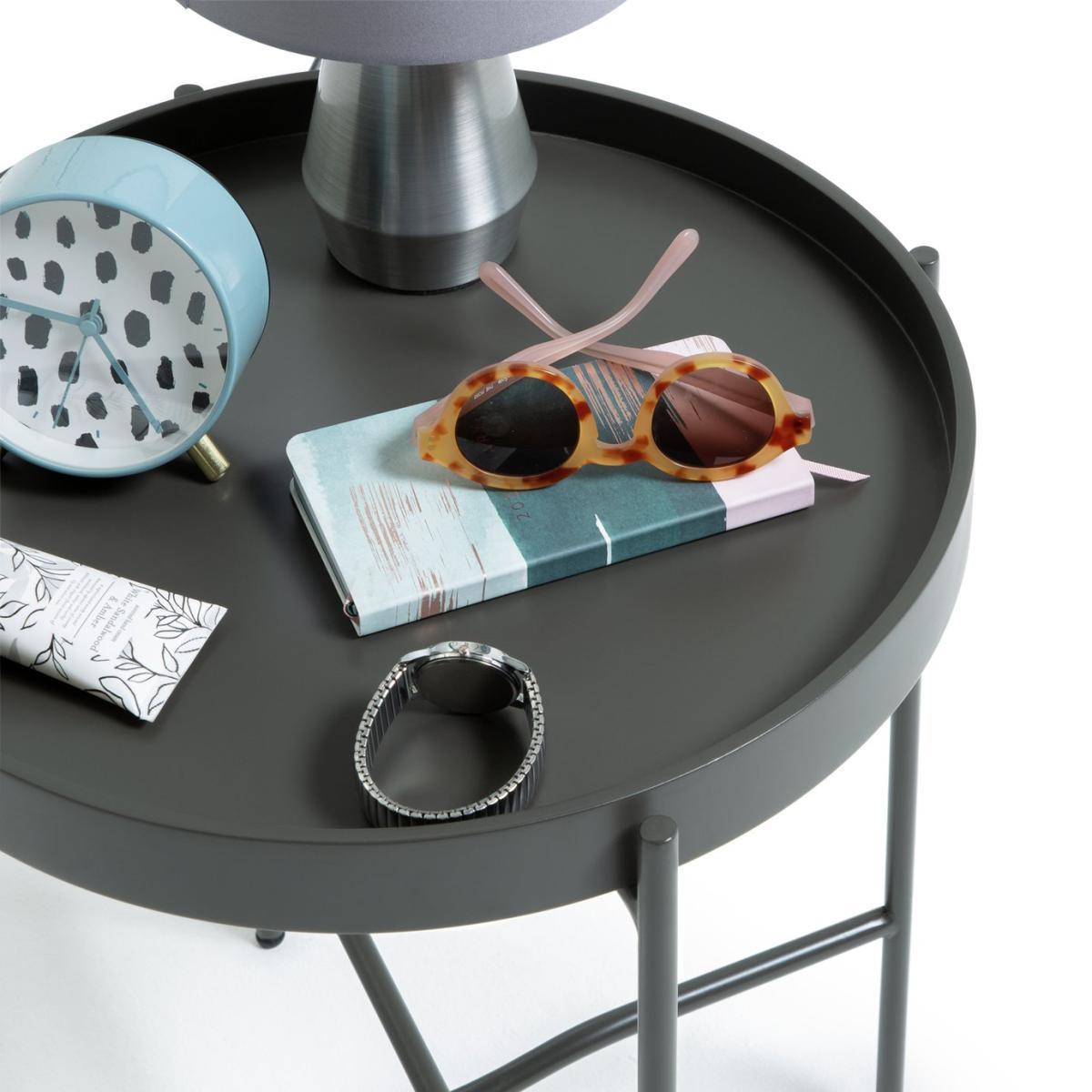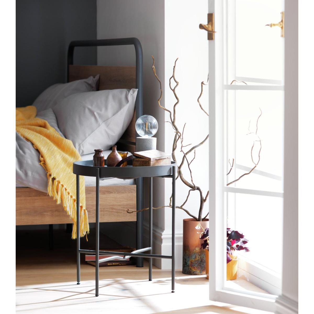 I really like this metal circular table for its sleek, contemporary look and versatile dark grey finish, which works well in both modern and industrial-inspired interiors. It’s a practical choice for those who prefer a minimalist aesthetic, but it also provides a subtle texture that can complement softer fabrics or colourful bedding. I’d suggest styling it with simple, understated accessories like a small lamp, a book, or a plant to keep the surface clutter-free and maximise its clean design. It works particularly well in bedrooms with a monochrome or grey palette, but it can also serve as a striking contrast in warmer-toned spaces, adding a touch of modern sophistication.