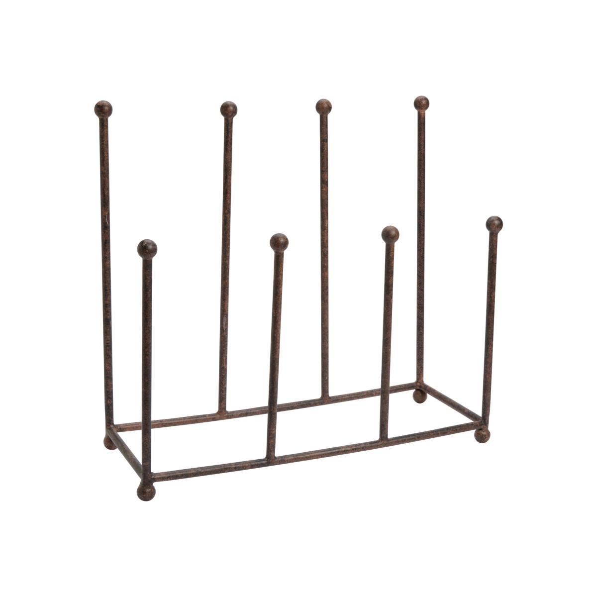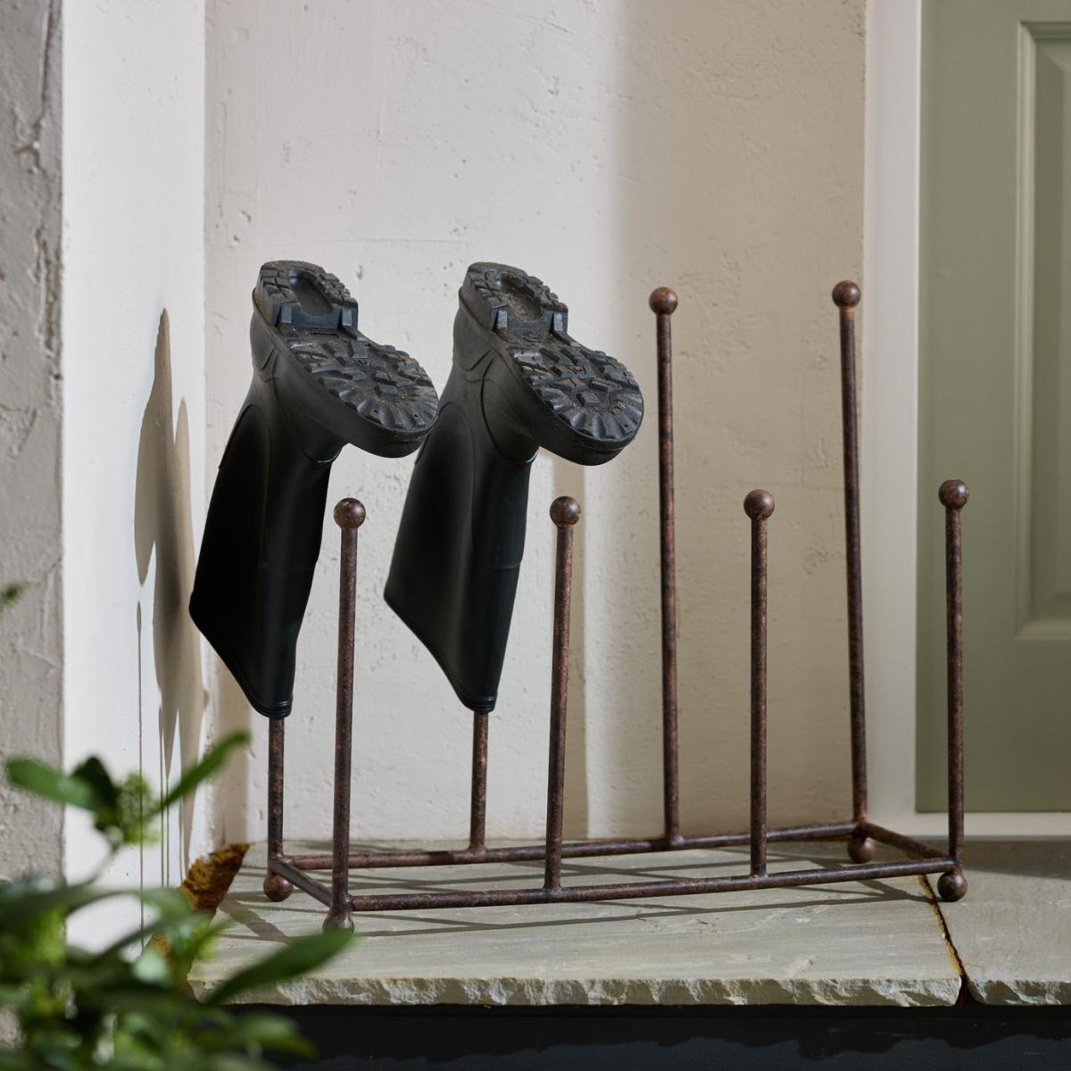 A 4-pair metal boot rack with rounded spoke ends, that will keep your footwear in tip top condition. Designed to help stop creasing and slouchy boot shafts. A must-have for gardeners, walkers and anyone who enjoys the outdoor life. Metal. Size H52, W45, D21cm. Weight 2.3kg.