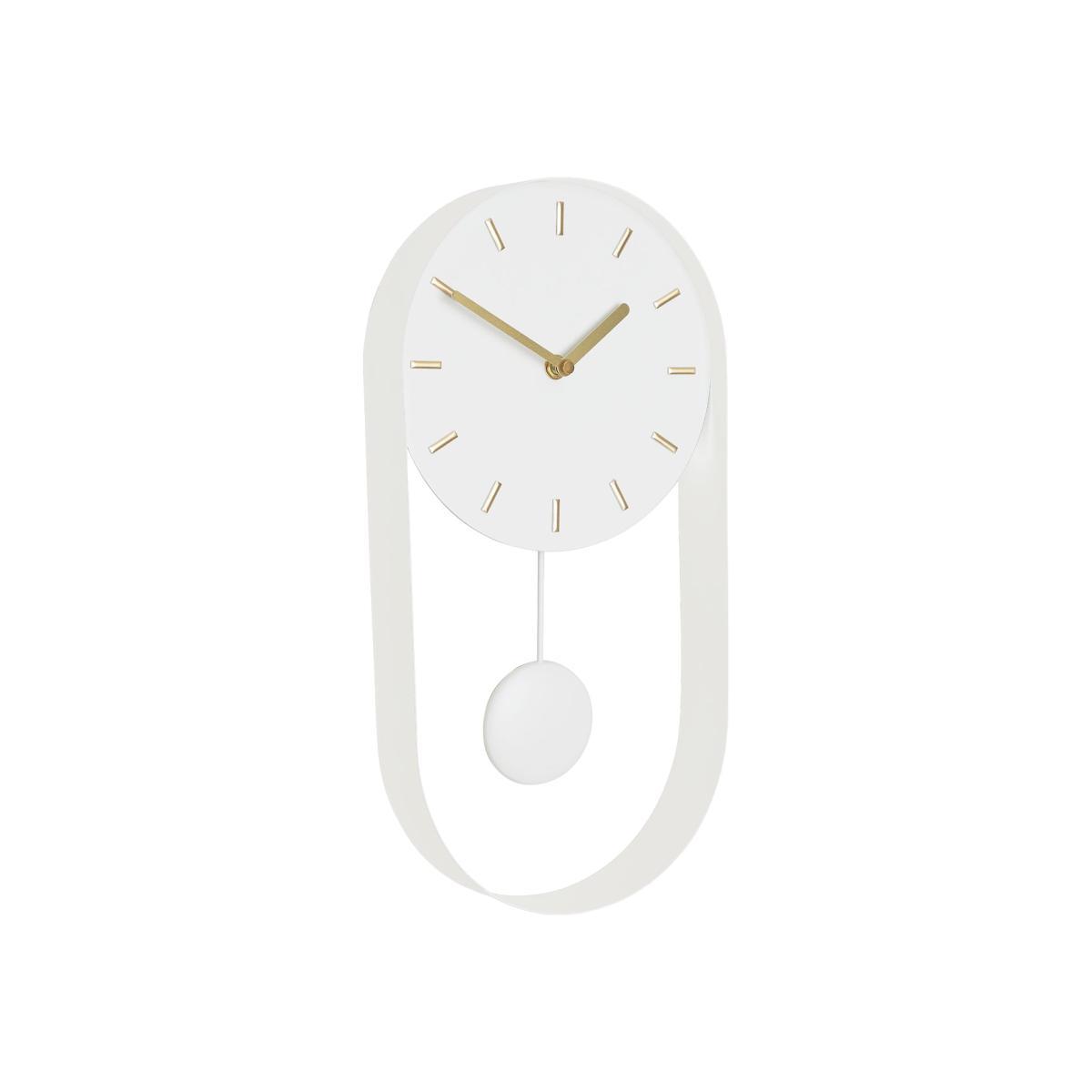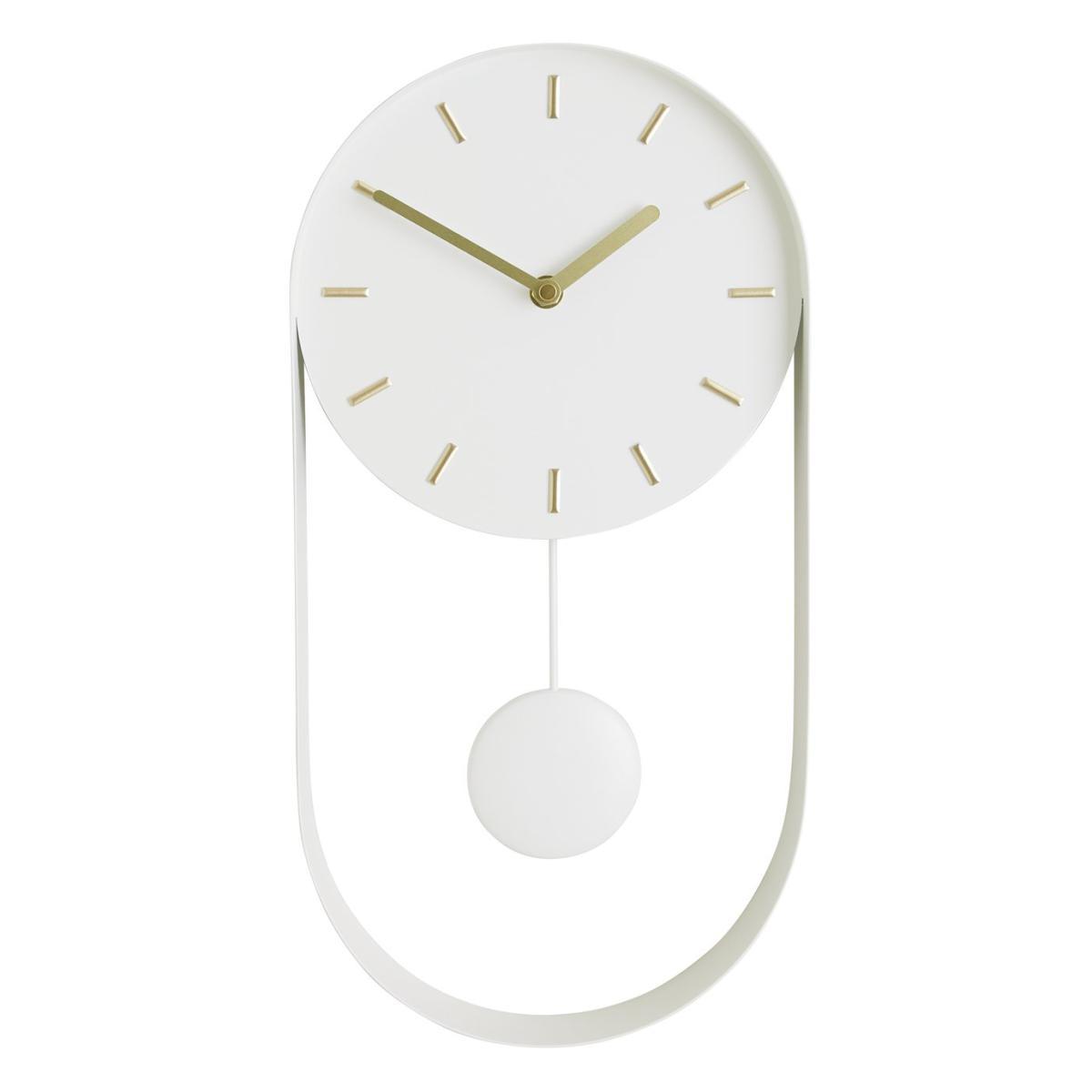 Curved lines and defined edges characterise the Metro metal white pendulum wall clock to create an on-trend, statement design. With a matt white finish, accent gold hands and hour markers, the clock's sleek design will look great hung in a home office or bedroom. Made from powder coated iron, the clock can be easily attached to your wall. Once hooked, watch the pendulum swing back and forth as it brings a sense of sophistication to your space.