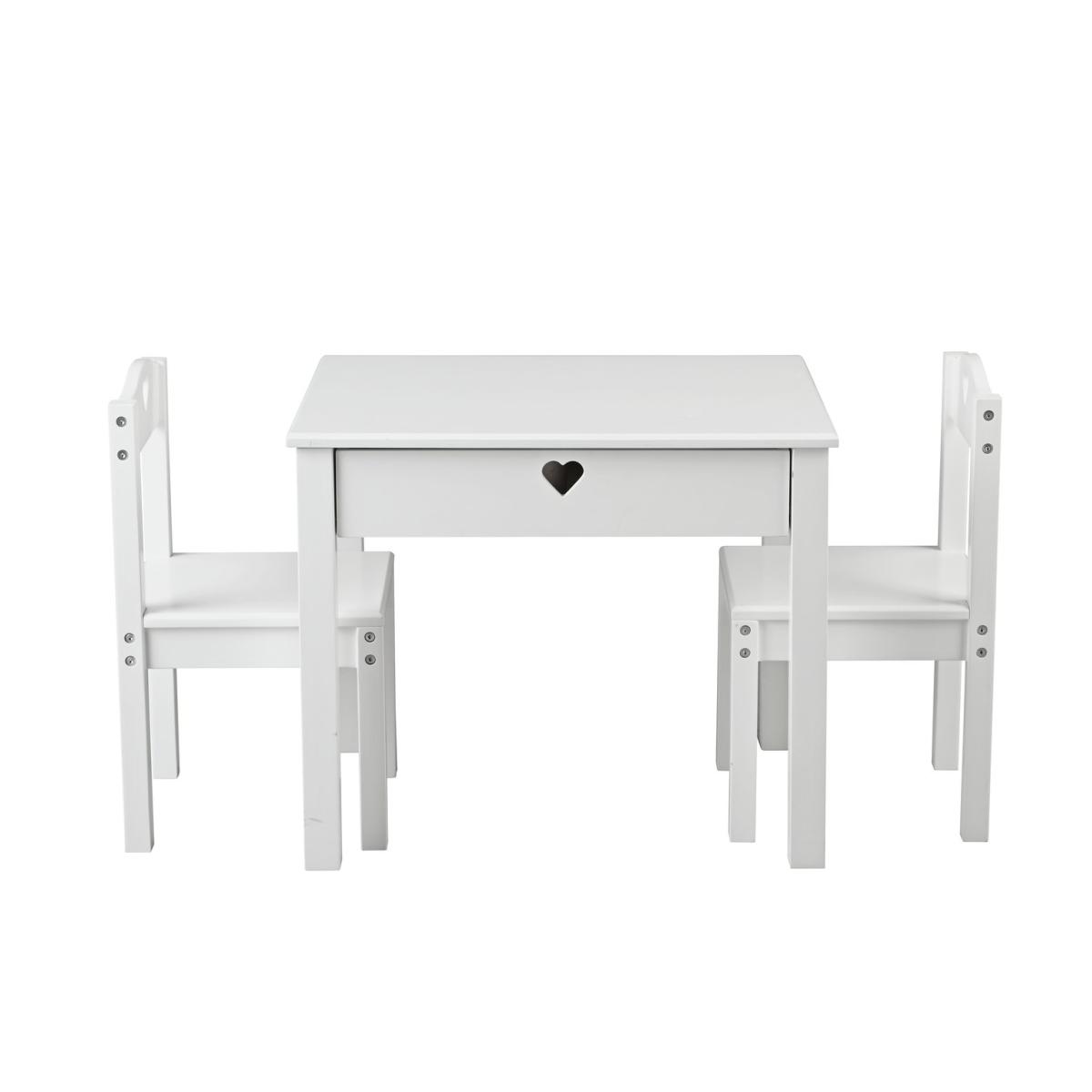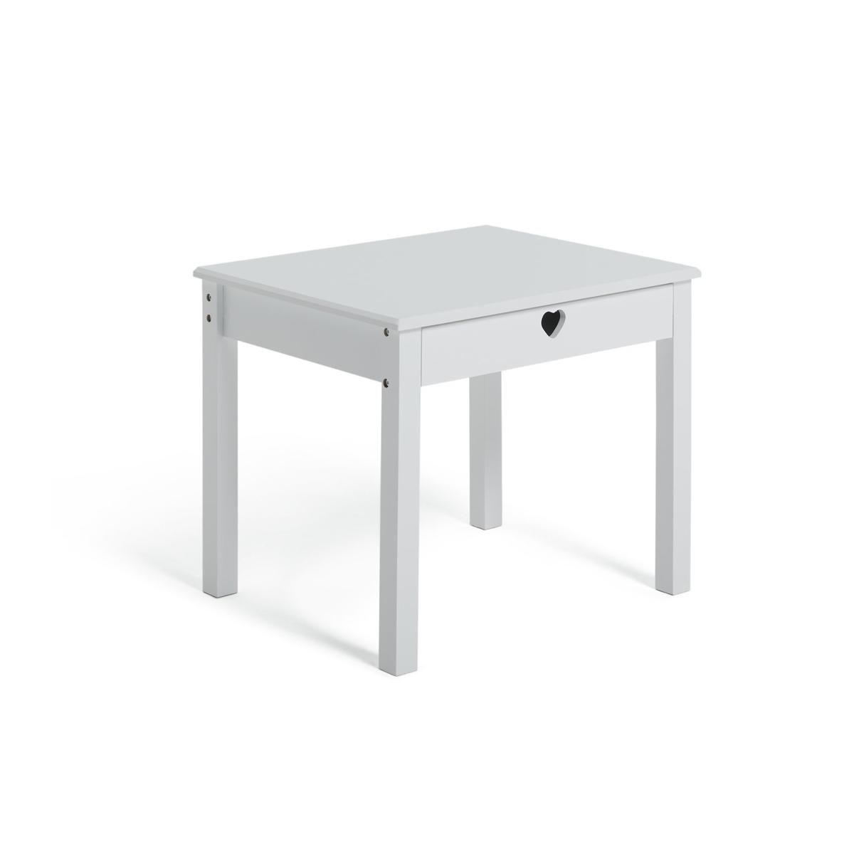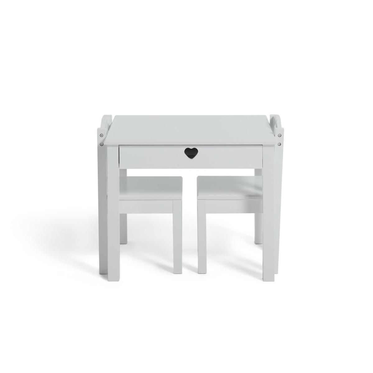 Let's play. This tiny table and 2 chairs are terrific for a toddler's bedroom or the corner of the kitchen. Shall we draw, make paper planes or colour in today? Tidy away pencils, paints, and paper in the handy pull-out drawer. It's easy to open using the cute cut-out heart. Super for snack time when friends come to play too. Made from FSC wood, it's doing its bit for the environment and is a doddle to keep clean. Just wipe with a damp cloth. Pull up a chair and join in the fun.