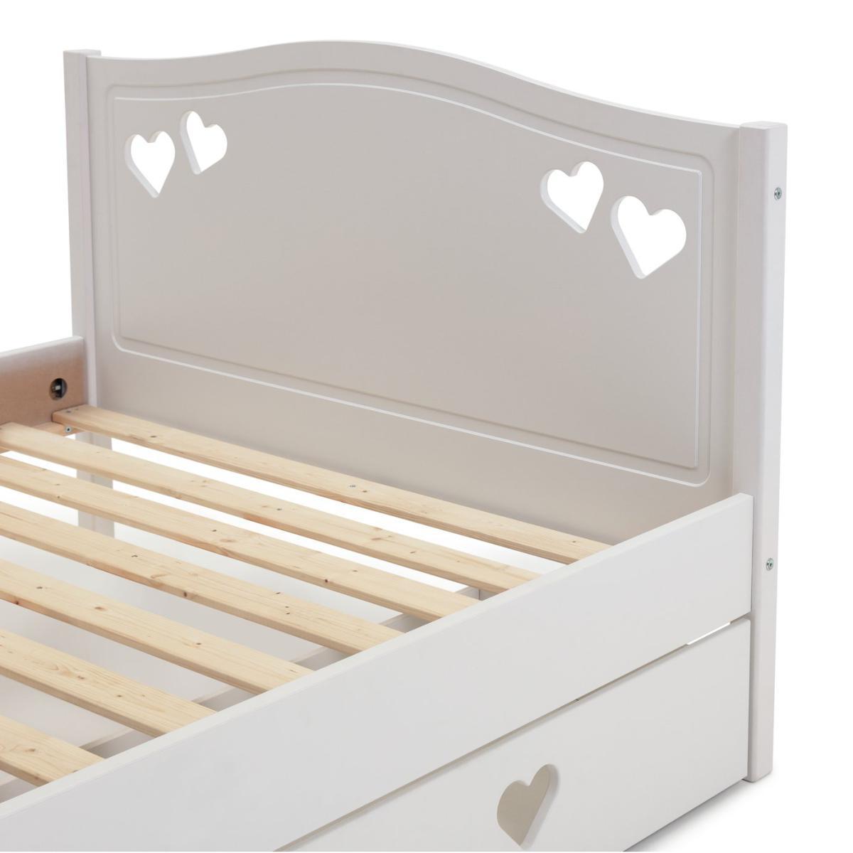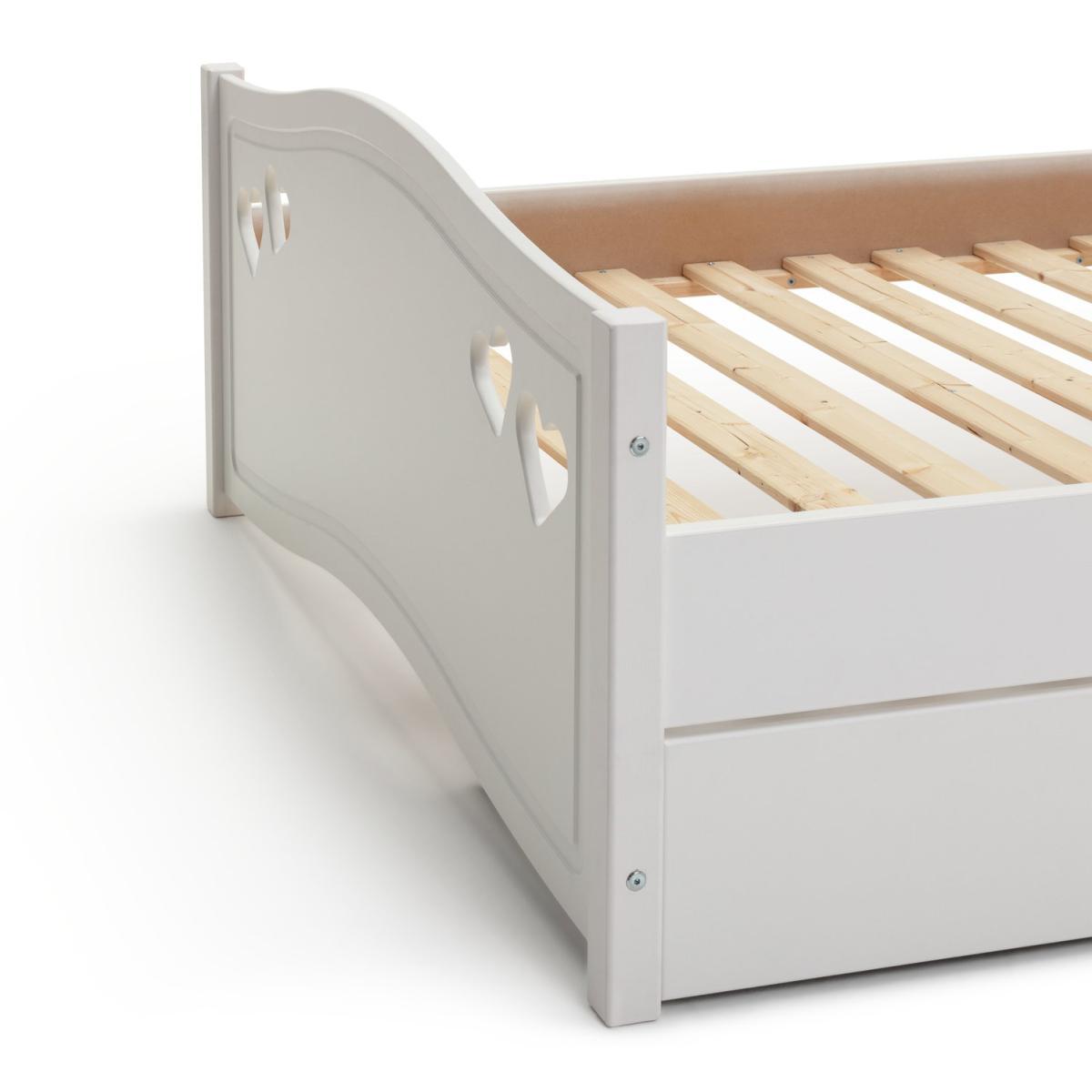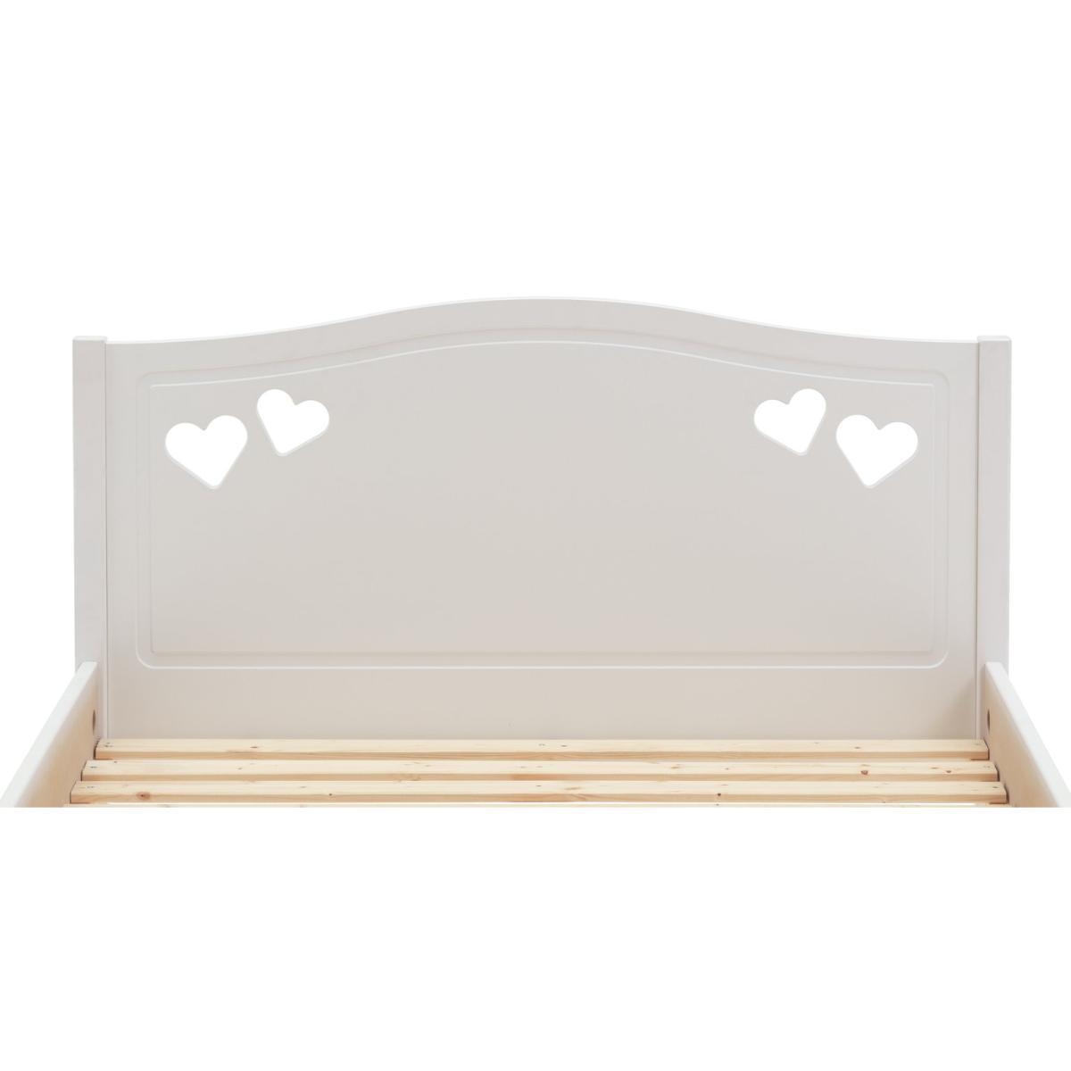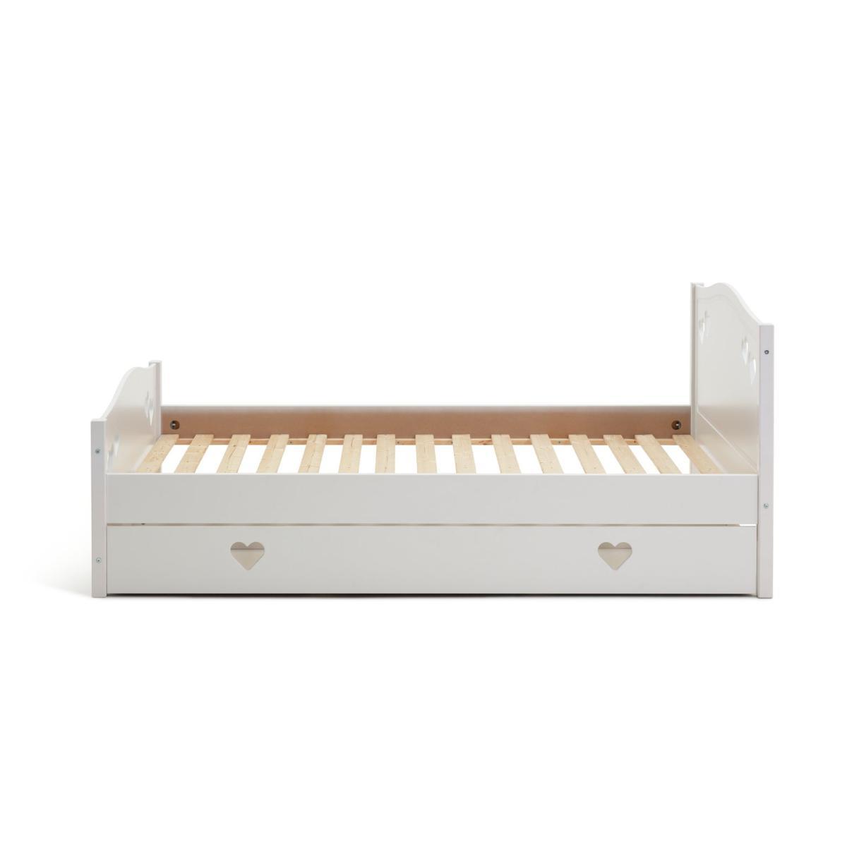 Dream a dream with the white Mia single bed with underbed storage drawer. With solid wood elements, charming cut out heart decorations, and elegant bevelled edges, this is a beautiful bed that has a truly magical look. Ideal for your young dreamer to grow into, the Mia single bed will see them through the years lovingly. The full length underbed storage drawer is perfect for toys and extra bedding. With sturdy castors, the drawer can go on either side of the bed to suit the space.