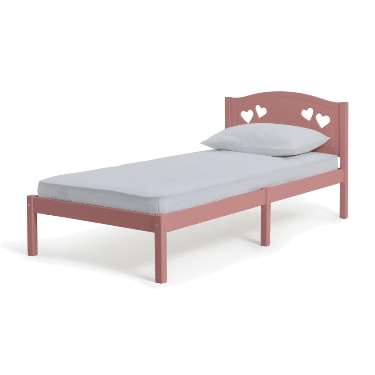 Mama Mia. This pink Mia bed will add some sweet style to your kid's bedroom. The gently curved and bevelled headboard has cute cut-out hearts to add to its storybook looks. And the wooden slatted base firmly supports and ventilates a single mattress. Our products are designed with kids in mind and are built to cope with everyday use. Tested to the latest safety regulations, they comply with British and European safety standards. Part of the Mia collection. Includes wooden slats. Size W96.3, L195.3, H82.2cm. For ages 4 years and over. Self-assembly. Fits single size mattress. Suitable for adult use (safety tested to 100kg). Self assembly: 2 people recommended.