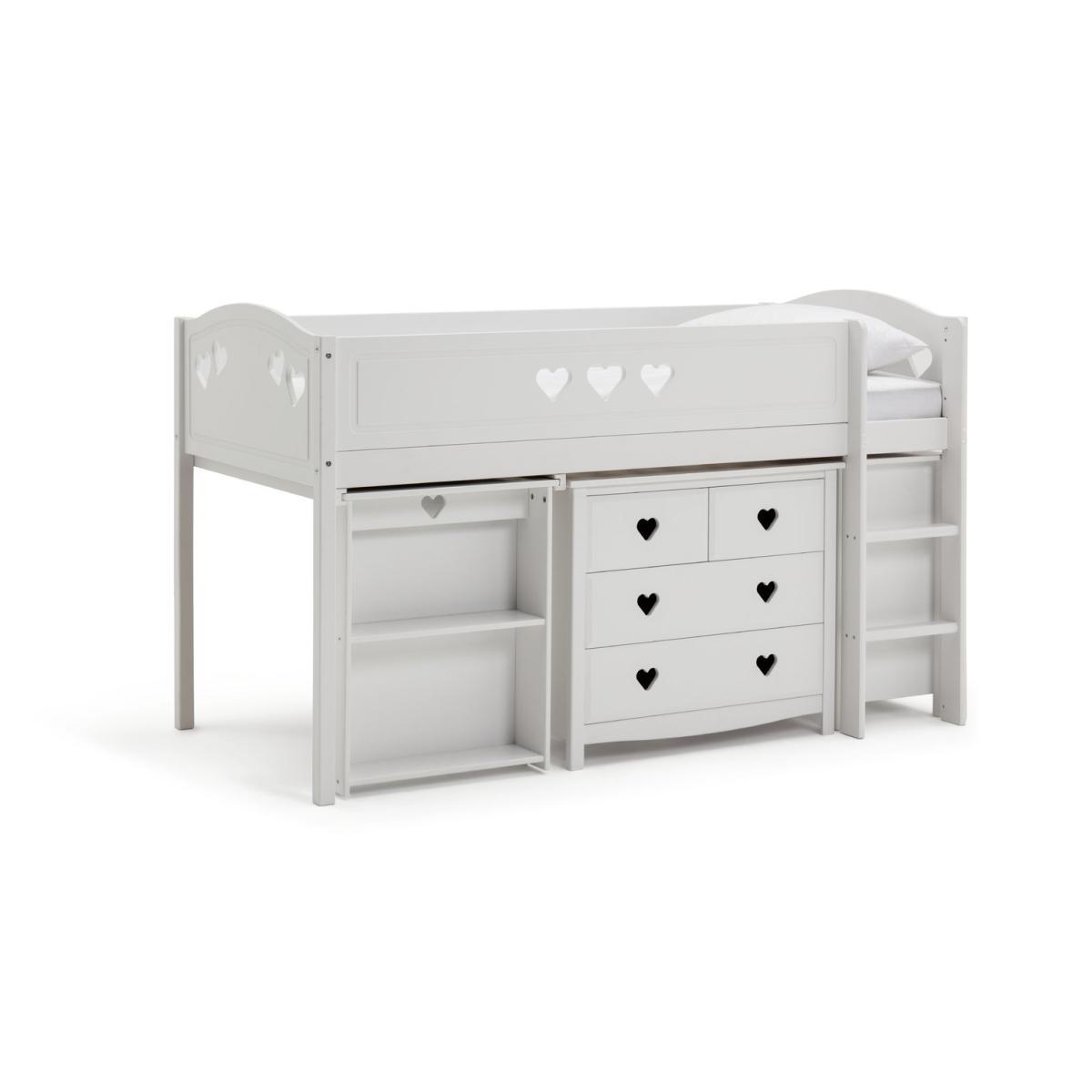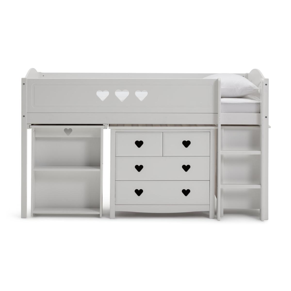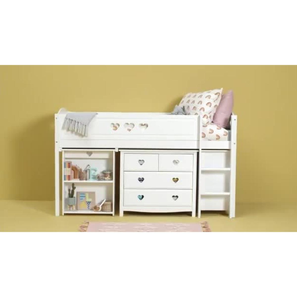 Featuring playful cut-out hearts and decorative bevelled edges, the Mia Mid Sleeper will make a charming addition to your little one's bedroom. Perfect for saving space, it comes with a chest of drawers, book shelf and pull-out desk underneath. This provides an abundance of storage space and even room for homework! Its solid pine frame, high protective sides and sturdy ladder make clambering in and out of bed super safe and easy. The Mia Mid Sleeper comes with a comfy Silentnight kids mattress. Ideal for growing children, it has an open coil design to provide firm support, while soft fibre filling adds a layer of cushioning. Foam free and chemical treatment free, it has a soft anti-allergy cover to help prevent dust mites, skin irritations and allergies. Kitting out the kids room in full? Check out the rest of the Mia bedroom furniture range. Part of the Mia collection. Sleeper:Single bed. White bed with a mdf and solid wood frame. Includes wooden slats. Self-assembly - 2 people recommended. If this product is over 60cm high it must be securely attached to the wall to prevent overturning. Ladder can be positioned either side of the bed. Maximum user weight per bunk 120kg. For ages 6 years and over. Suitable for adult use (safety tested to 100kg). Mattress:Requires 1 mattress (included). Silentnight mattress. Medium feel mattress. Open coil mattress with 323 springs. Knit cover with micro quilt finish. Rotate mattress regularly. For safety, maximum depth of mattress to be used is 16cm. Dimensions:Safety rail height 32cm. Frame size L195.3, W101.5, H116.8cm. Mattress size L190, W90, D15cm. Clearance between floor and underside of bed 74.6cm. Desk size H73.5, W60, D89cm. Storage unit size H73, W86, D40cm. Package dimensions:Package 1 size H11.1, W47.4, D193.1cm. Package 2 size H6, W61.3, D102.7cm. Package 3 size H13.9, W44.7, D92.2cm. General information:Manufacturer's 2 year guarantee.