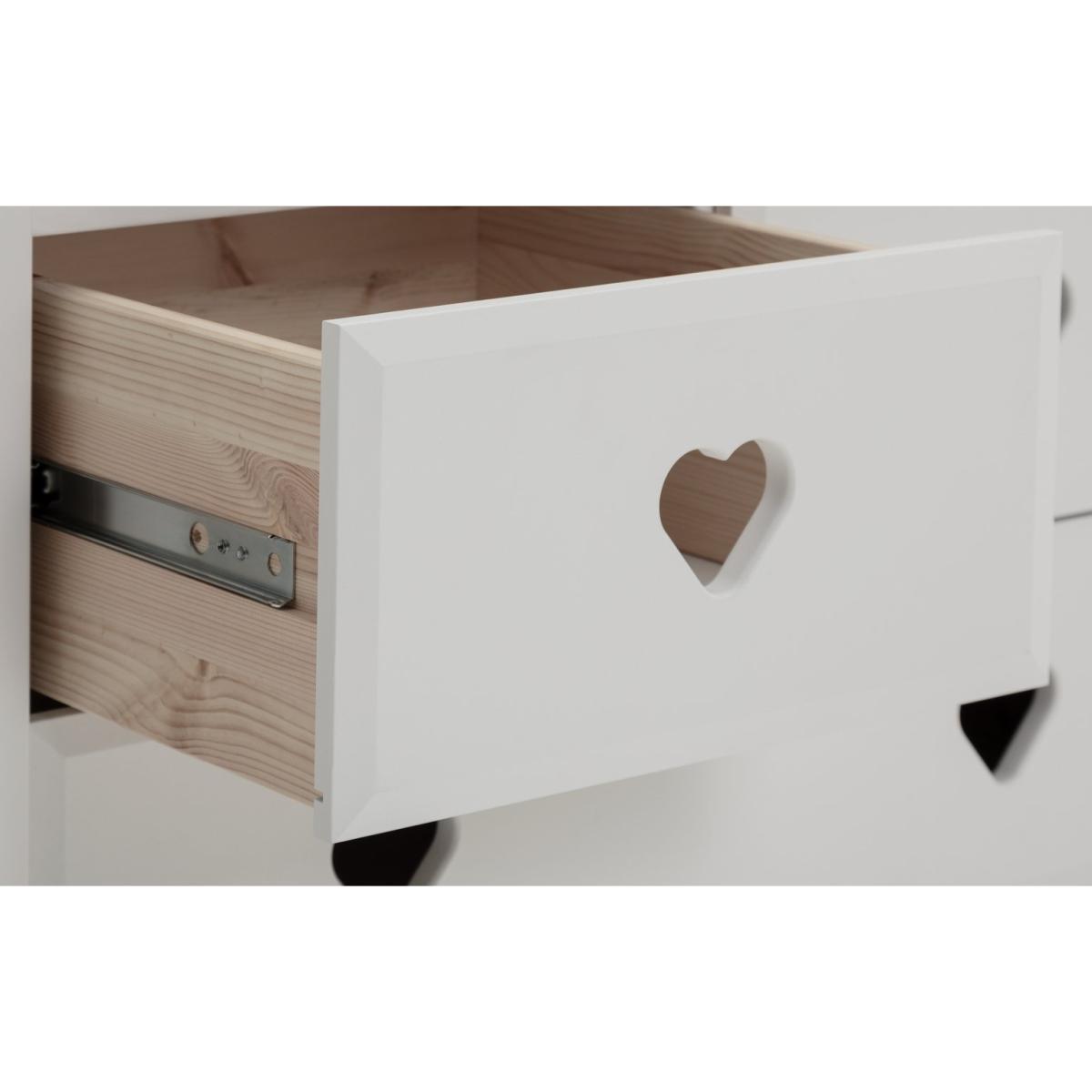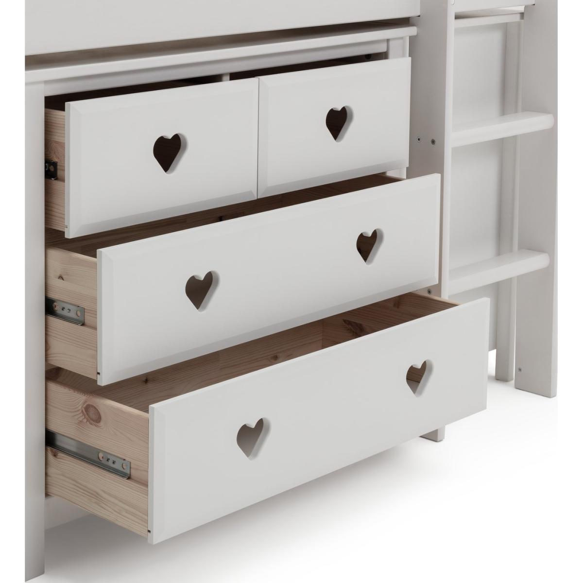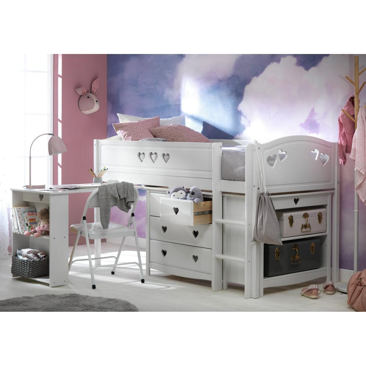 Featuring playful cut-out hearts and decorative bevelled edges, the Mia Mid Sleeper will make a charming addition to your little one's bedroom. Perfect for saving space, it comes with a chest of drawers, book shelf and pull-out desk underneath. This provides an abundance of storage space and even room for homework! Its solid pine frame, high protective sides and sturdy ladder make clambering in and out of bed super safe and easy. The Mia Mid Sleeper comes with a comfy Silentnight kids mattress. Ideal for growing children, it has an open coil design to provide firm support, while soft fibre filling adds a layer of cushioning. Foam free and chemical treatment free, it has a soft anti-allergy cover to help prevent dust mites, skin irritations and allergies. Kitting out the kids room in full? Check out the rest of the Mia bedroom furniture range. Part of the Mia collection. Sleeper:Single bed. White bed with a mdf and solid wood frame. Includes wooden slats. Self-assembly - 2 people recommended. If this product is over 60cm high it must be securely attached to the wall to prevent overturning. Ladder can be positioned either side of the bed. Maximum user weight per bunk 120kg. For ages 6 years and over. Suitable for adult use (safety tested to 100kg). Mattress:Requires 1 mattress (included). Silentnight mattress. Medium feel mattress. Open coil mattress with 323 springs. Knit cover with micro quilt finish. Rotate mattress regularly. For safety, maximum depth of mattress to be used is 16cm. Dimensions:Safety rail height 32cm. Frame size L195.3, W101.5, H116.8cm. Mattress size L190, W90, D15cm. Clearance between floor and underside of bed 74.6cm. Desk size H73.5, W60, D89cm. Storage unit size H73, W86, D40cm. Package dimensions:Package 1 size H11.1, W47.4, D193.1cm. Package 2 size H6, W61.3, D102.7cm. Package 3 size H13.9, W44.7, D92.2cm. General information:Manufacturer's 2 year guarantee.