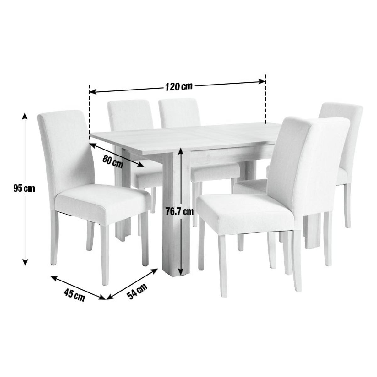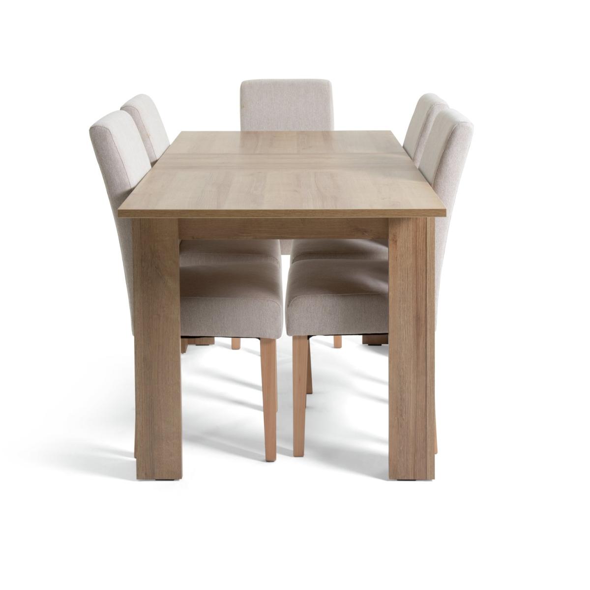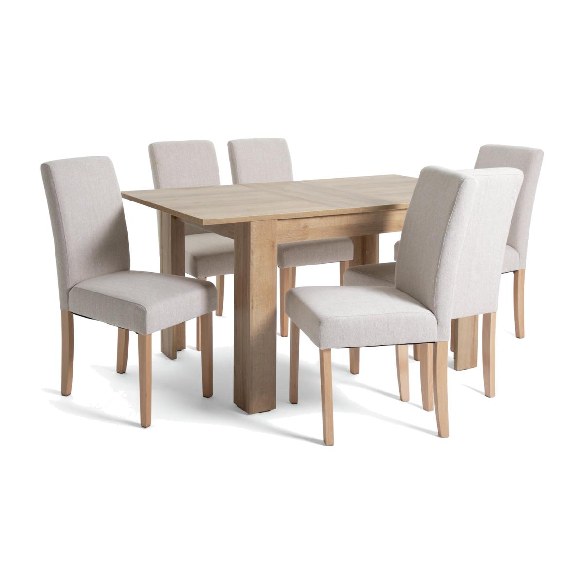Make meals memorable with our Miami 6-seater dining set. Country cottage charm and minimalist design come together with the table's clean lines and pillar legs. Upholstered in cool cream fabric, the solid wood chairs are a classic choice and create a subtle contrast against the natural wood effect. With a removable central leaf extension piece, the table can be lengthened when you're hosting more people or just serving up a massive spread. Yum!