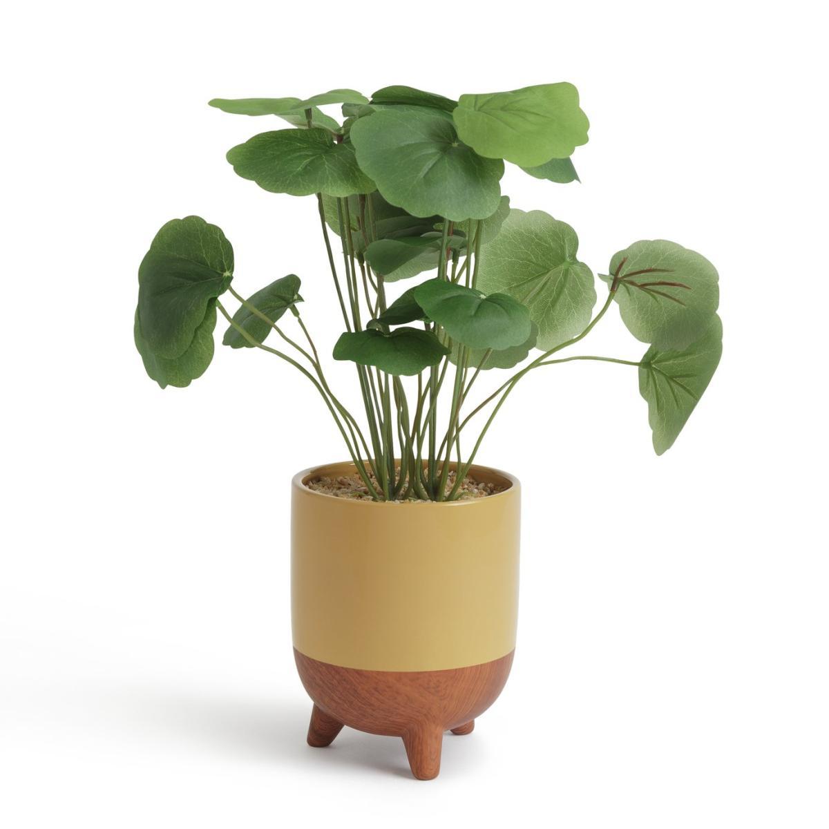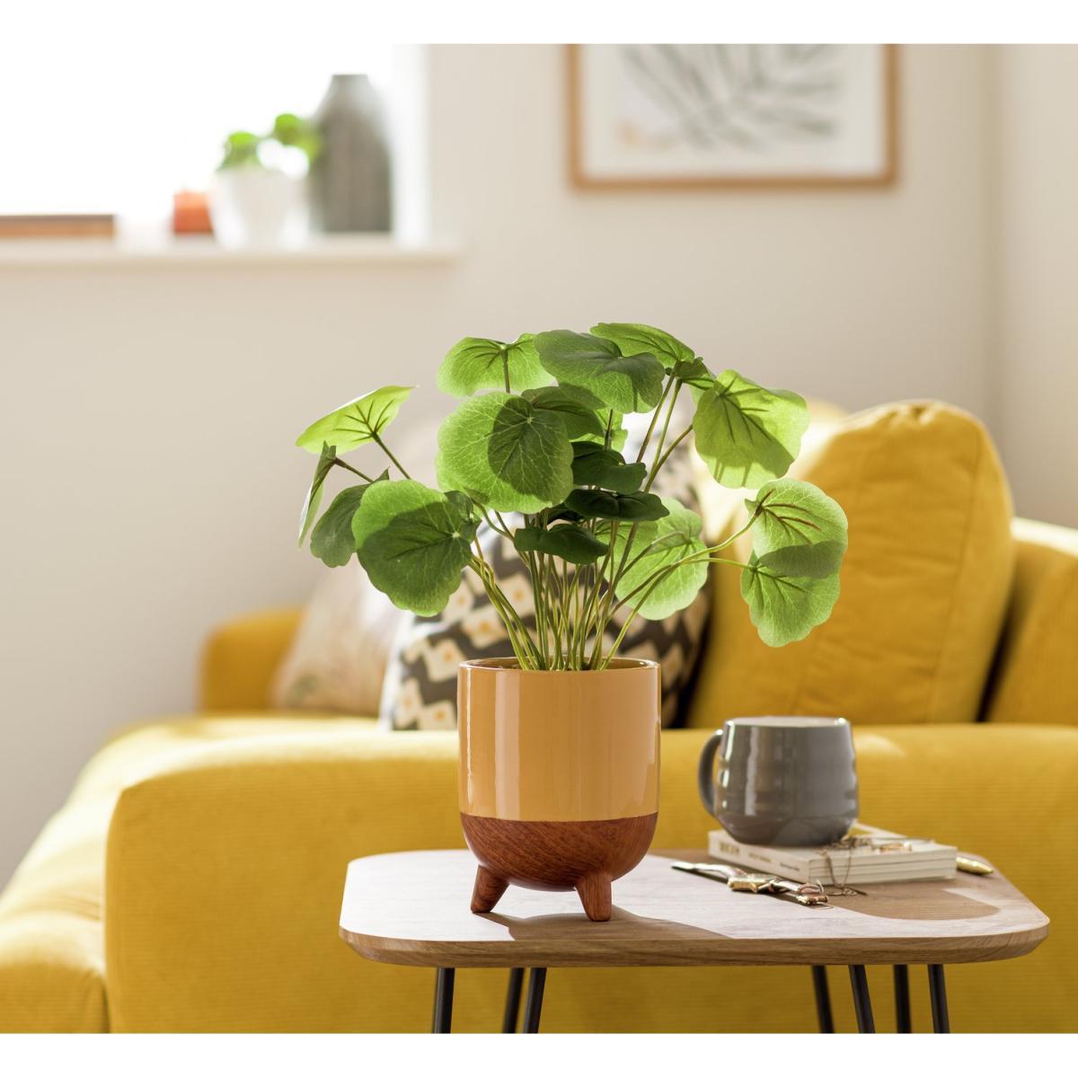 Lift the mood of any room with our beautiful faux potted plant. At 38cm high it's a statement maker. Totally life like and expertly designed to have all the colour and texture of real leaves. And remember afoliage - only plant can be used year-round. Rooted firmly in a splayed leg, two tone ceramic pot with wood effect base that has a real Mid-Century vibe. Cool and contemporary. So low maintenance, it's almost no maintenance.