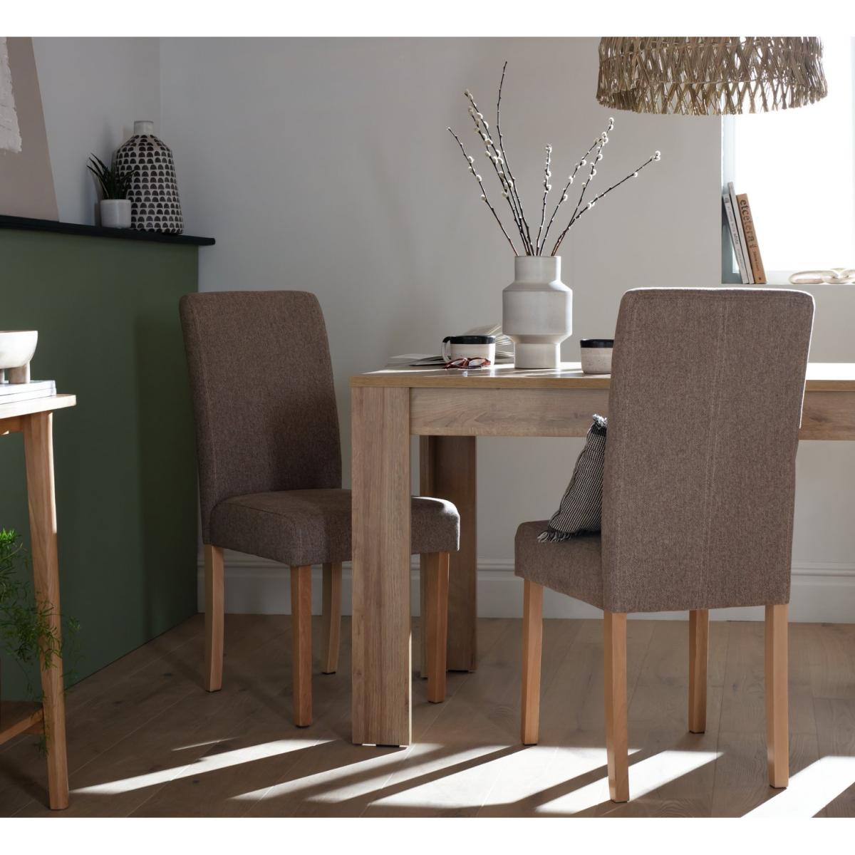 A dashing duo. Settle down for dinner with our charming pair of mid back fabric dining chairs. In rich brown, they're a classic choice that fits well in both colourful and laid back decor schemes. And in polyester they're long lasting and comfy. Complete with pale wooden legs for a natural finishing flair. Pull up a chair and tuck in.
