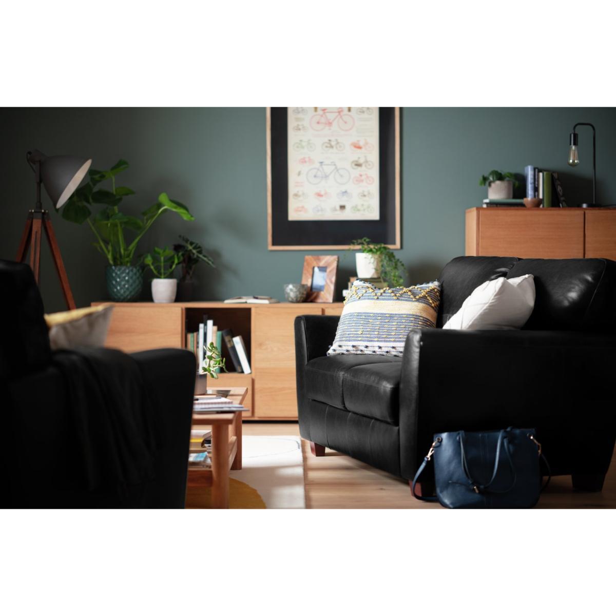 Flop back. Feet up. Our Milford 2-seater sofa is designed for those who appreciate laid-back living in an ultra-stylish way. Crafted in beautiful black leather and raised on wooden legs, you'll be relaxed and curled up in no time at all. The fixed seat cushion is pocket-sprung, and foam filled for maximum comfort. And the back cushion has a soft fibre filling - minimal plumping required. It feels so good to be home!