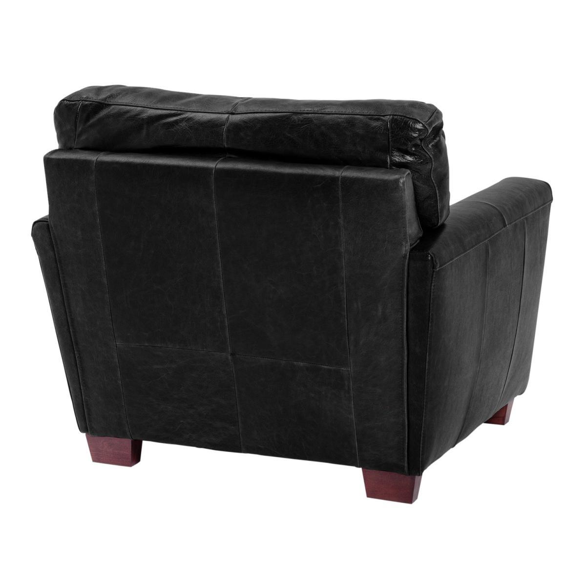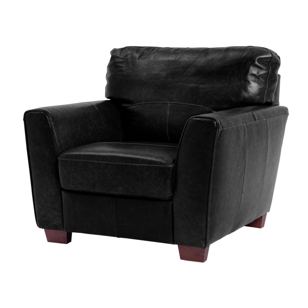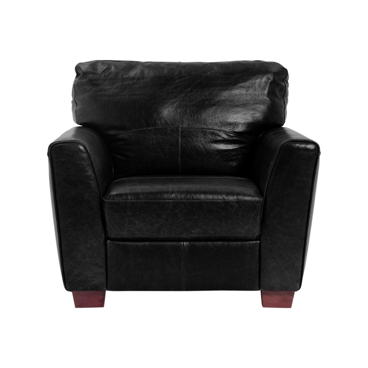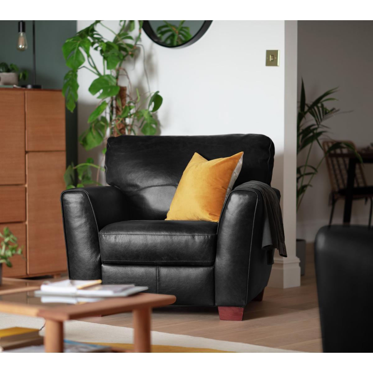Flop back. Feet up. Our Milford armchair is designed for those who appreciate laid-back living in an ultra-stylish way. Crafted in beautiful black leather and raised on wooden legs, you'll be relaxed and curled up in no time at all. The fixed seat cushion is pocket-sprung, and foam filled for maximum comfort. And the back cushion has a soft fibre filling - minimal plumping required. It feels so good to be home!