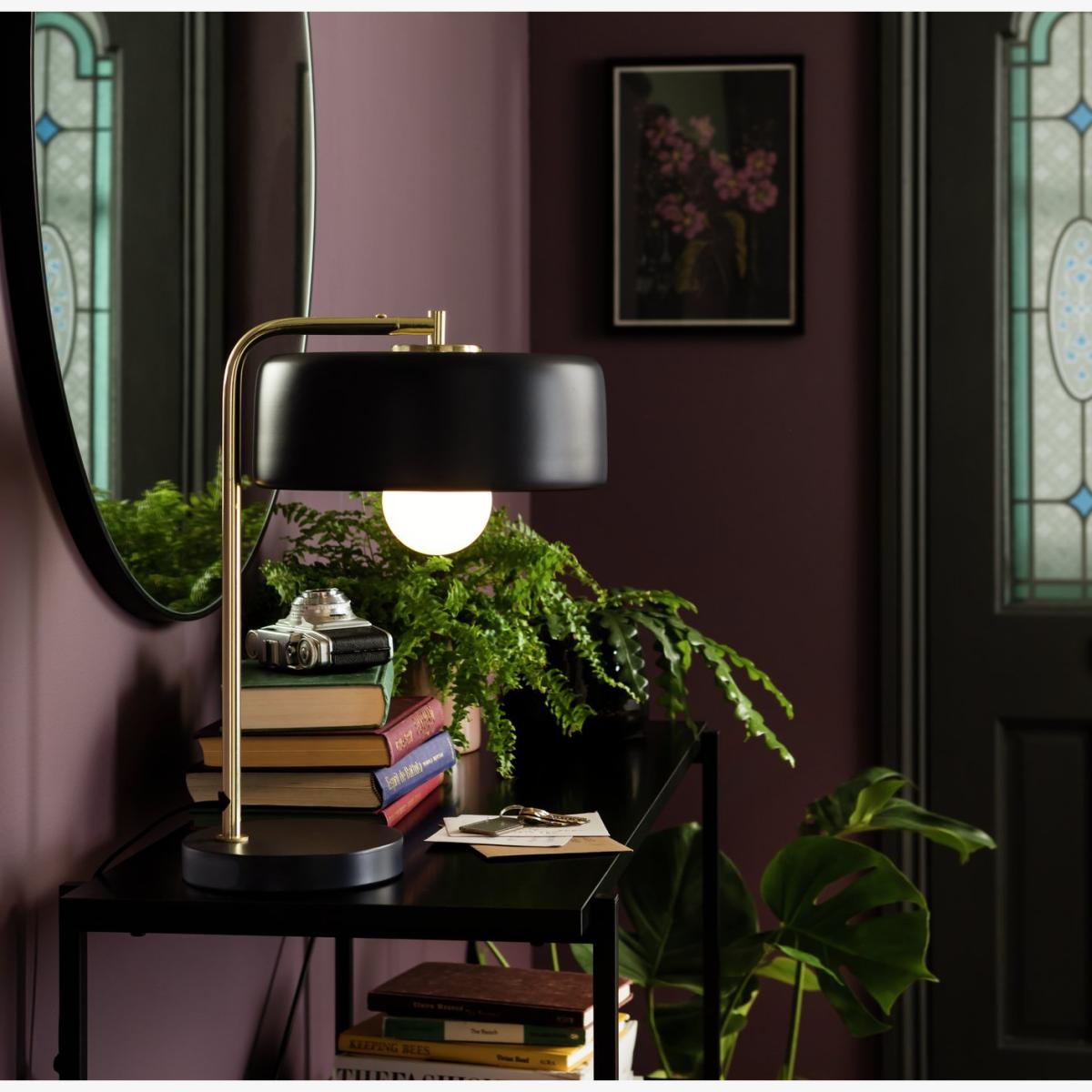 Sensational style. Check out this contemporary table lamp. Minah blends the best of classic design with a modern makeover. Made to endure, it comes with a matte black pressed iron base and brass plate finish. Its standout credentials are set. A brilliant statement piece. Light up with ease. The lamp comes with a globe e27 Edison screw LED bulb and an inline switch on a matching cable. Love the suave look? Match with matte accessories from our collection. Dimensions: Overall size H40.6, W30.8, D25.6cm, Diameter 25.6cm. Shade size H9.95, D25.6cm. Diameter of base 16cm. Cord length 1.8m. Bulb Information: Bulbs required 1 x globe E27 edison screw LED bulb(s) (included). Recommended maximum wattage: 6 watts. Alternative Bulb Required: 3. LED bulb only. Colour rendering index 80. Colour temperature 2500. K. Rated luminous flux 733 lumens. General Information: Shade colour: black. Base colour: black. In-line switch. IP rating 20 - not suitable for bathroom use. Self-assembly. This lighting product is a class 1 fitting. Minah. Manufacturer's 1 year guarantee.