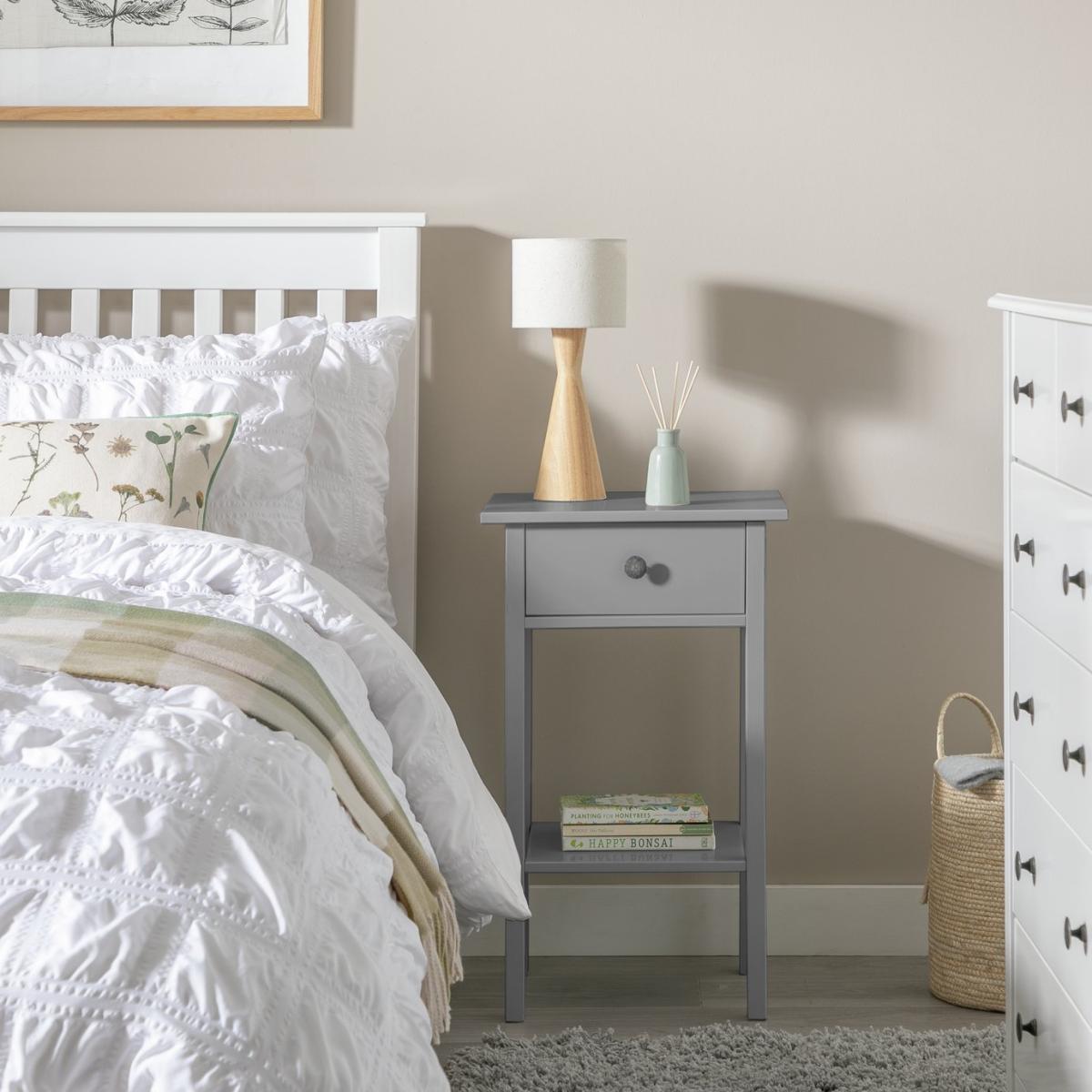 I love this little bedside table because of its simple, clean lines and versatile grey finish, making it a staple piece that works well in both modern and traditional interiors. It’s ideal for adding function without clutter - great for those who prefer a kept bedroom surface or small storage. I’d style it with a minimalist table lamp, a few favourite books, or a small plant to create a soft, inviting bedside vignette. Its neutral tone also allows it to be paired easily with more colourful or patterned bedding, while its drawer offers handy storage for everyday essentials. This piece is particularly well-suited for cosy, Scandi-inspired rooms but can effortlessly slot into eclectic or contemporary decors too.