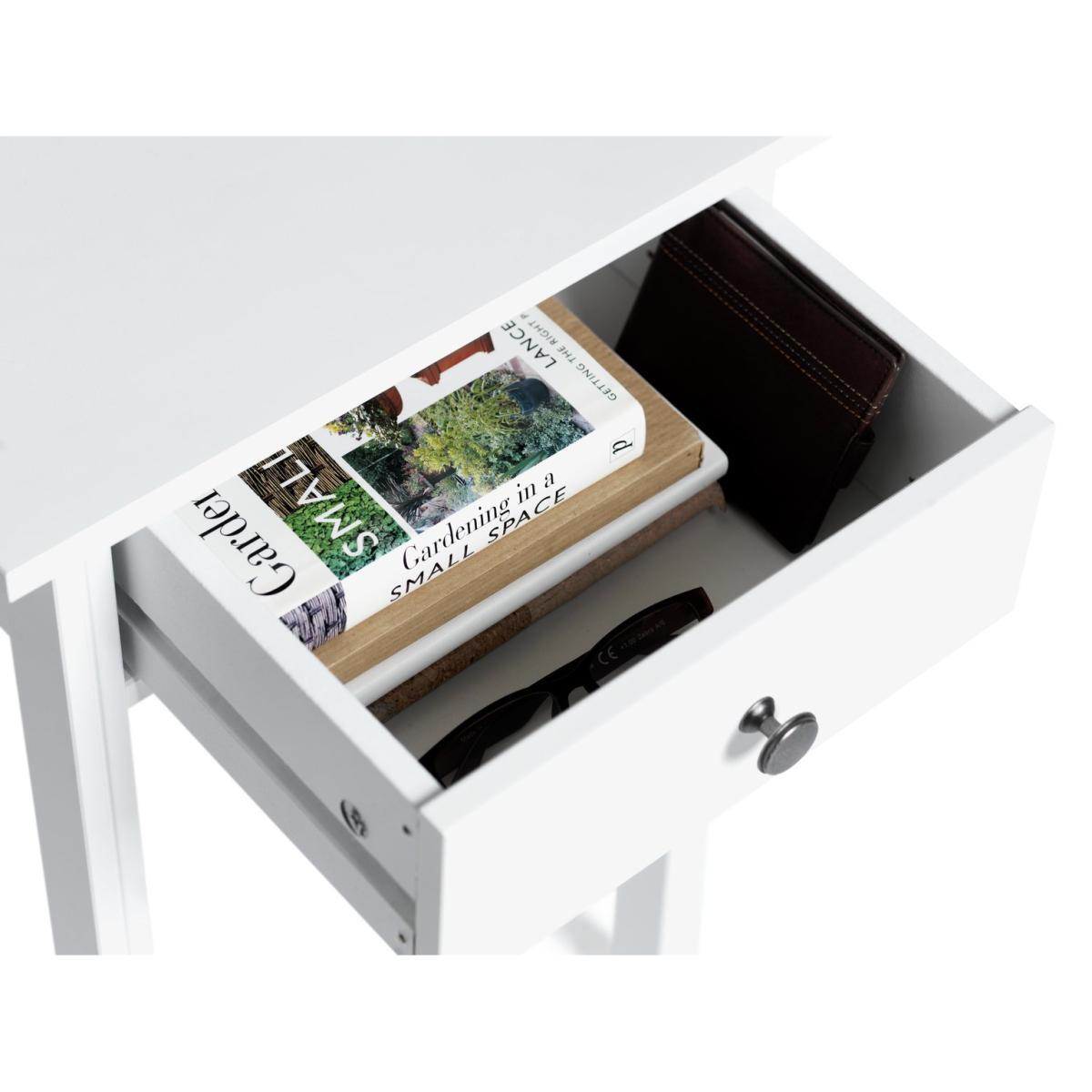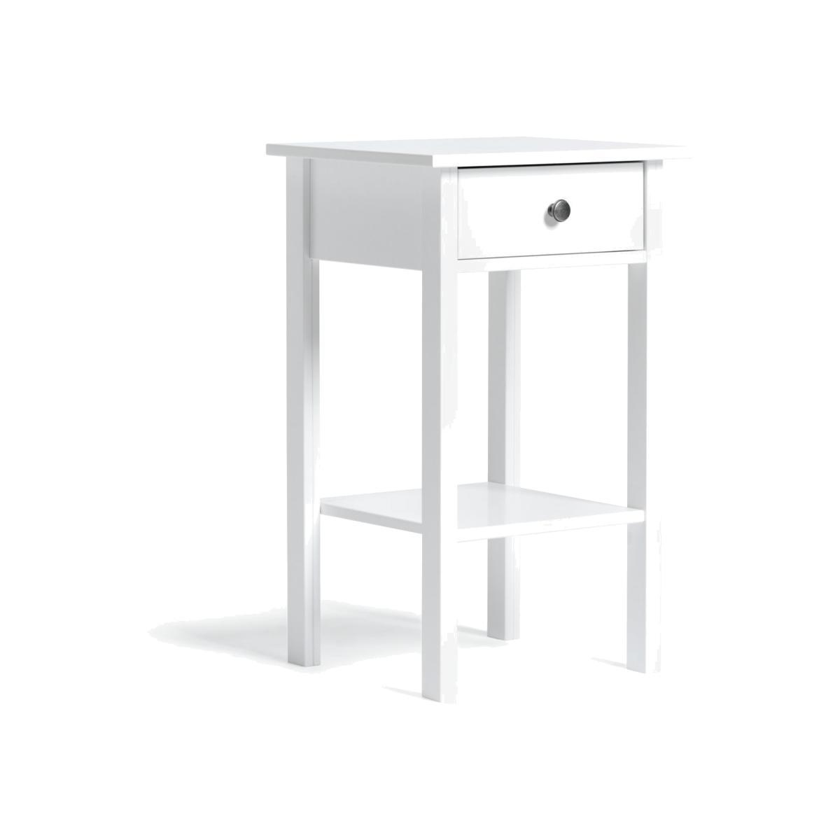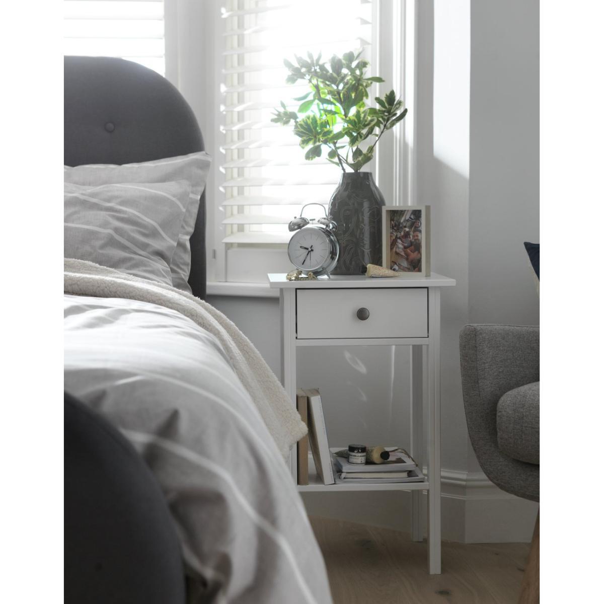 Best friend by your side. With a fixed shelf for holding the latest page-turner and a drawer for ear pods, phone charger and more, this bedside table is a convenient way to keep night time essentials to hand. Add a table or angle poise lamp to read by or a vase of fresh flowers to add a fresh sense of style. White and bright it will not only cheer up your night but will look good with any decor, modern or traditional.