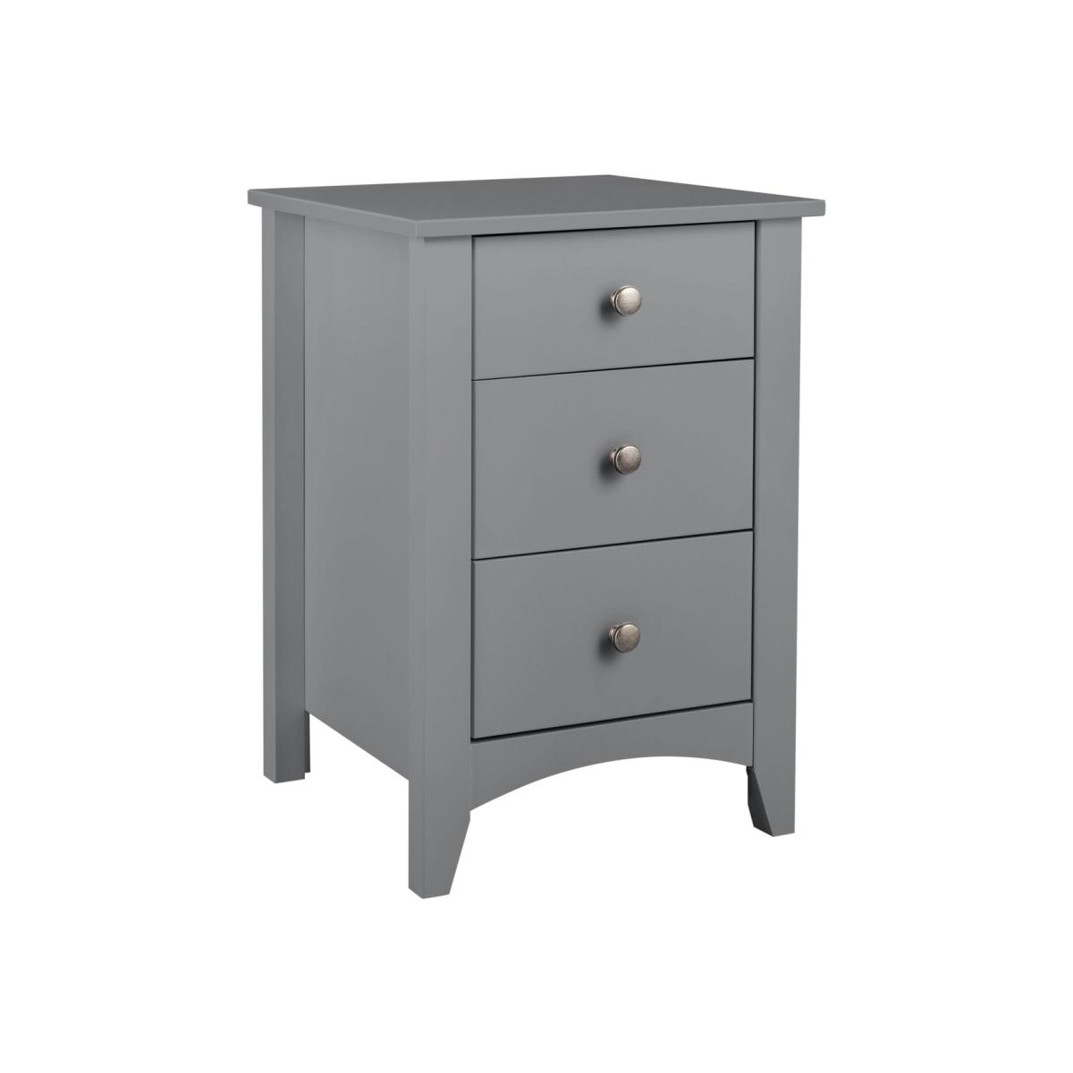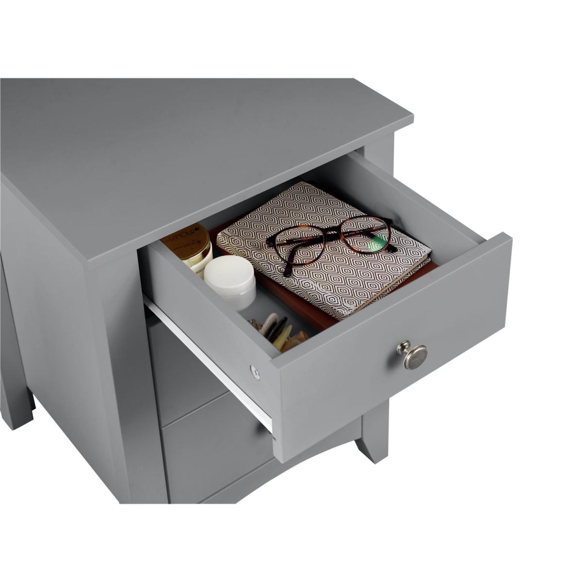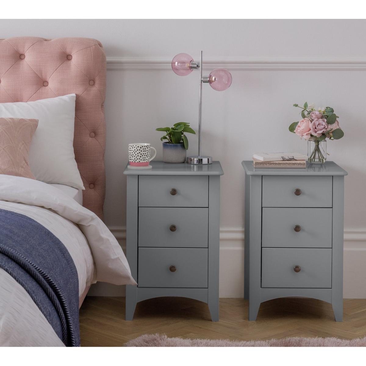 I love this bedside table for its simple, clean lines and versatile grey finish, making it a great addition to both modern and traditional interiors. Its compact size works well alongside a variety of bed styles, from upholstered headboards to sleeker frames. Practical styling tips include keeping the top space uncluttered for bedtime essentials like a lamp or alarm clock, while the drawers provide handy storage for smaller items. Pair it with other grey or neutral tones for a calm, cohesive look, or add colourful accents through lamps or accessories for a more lively bedroom scheme. It's a functional, stylish piece that can easily be integrated into different bedroom setups.