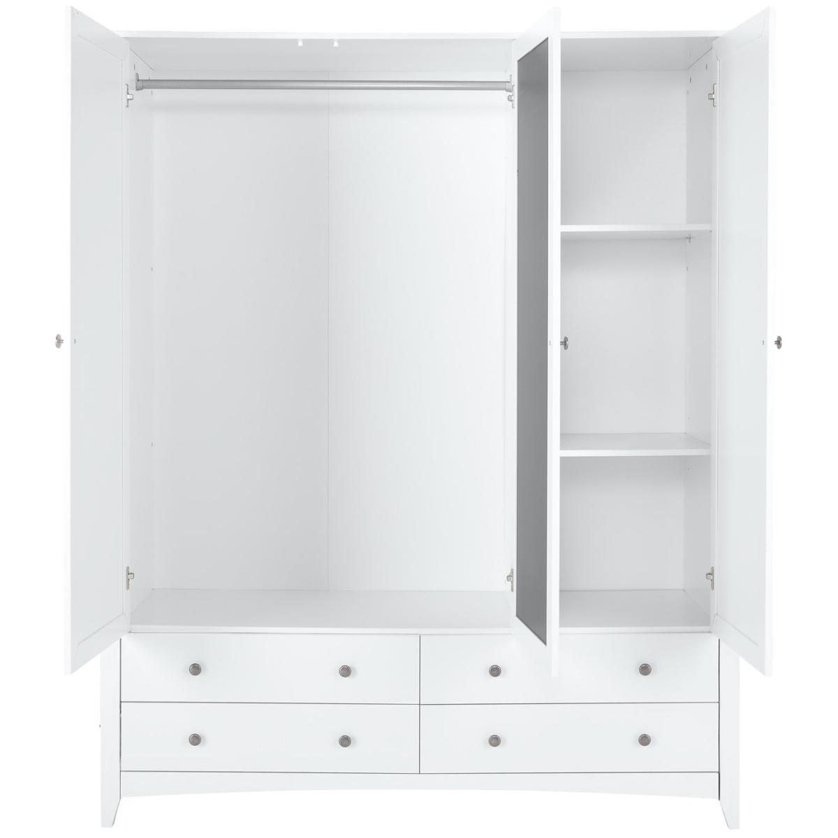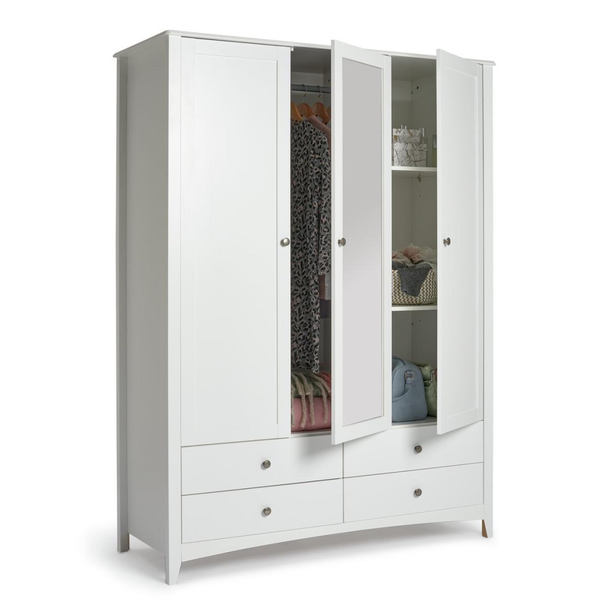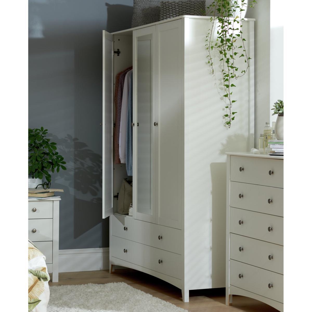 Inspired by Shaker styling, our Minato 3 door wardrobe opens up to reveal a dressing room layout. A place to hang non-creasables, 4 easy slide drawers to fold and shelves for stacking everything from tops to handbag, shoes to accessories. Plus a light and bright reflective mirror to admire your appearance. Sitting on a curved plinth with panelled doors and metal button handles it's a classic that will sit comfortably in modern or classic room dcor.