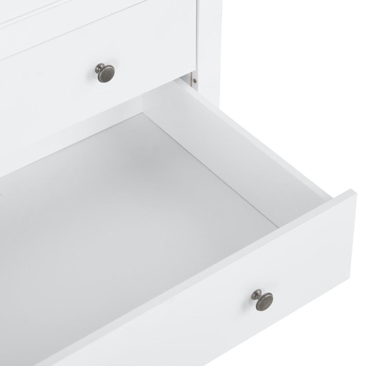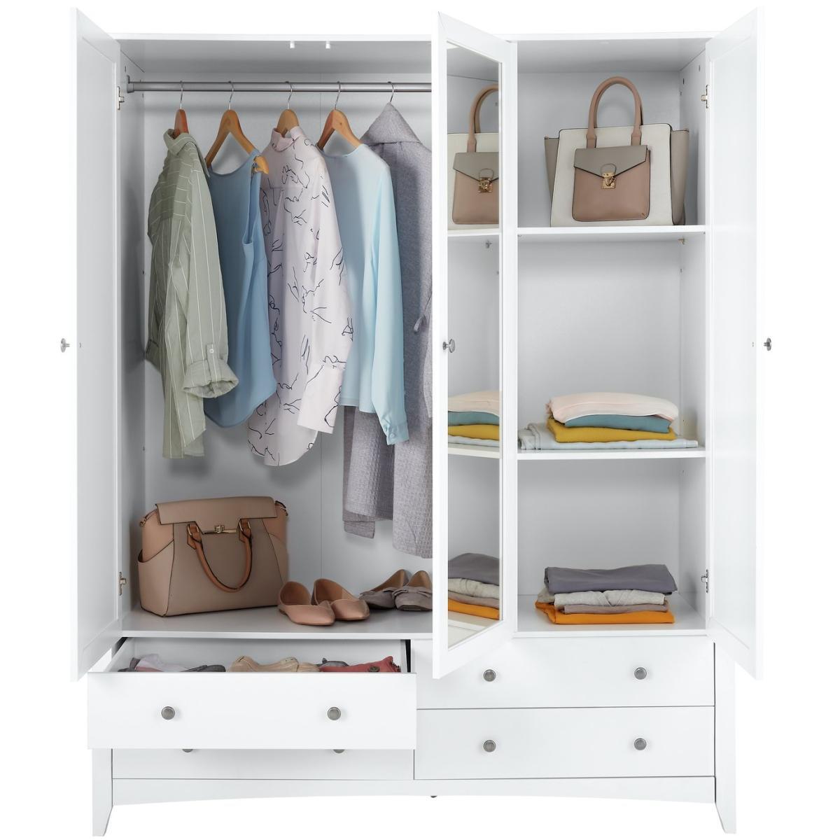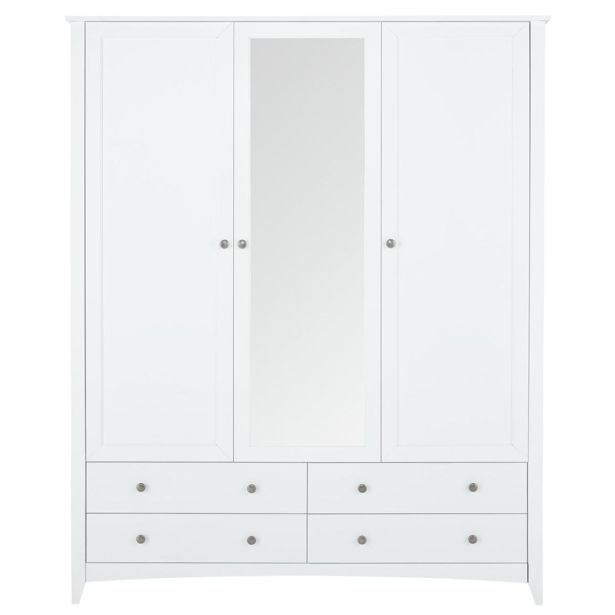 Inspired by Shaker styling, our Minato 3 door wardrobe opens up to reveal a dressing room layout. A place to hang non-creasables, 4 easy slide drawers to fold and shelves for stacking everything from tops to handbag, shoes to accessories. Plus a light and bright reflective mirror to admire your appearance. Sitting on a curved plinth with panelled doors and metal button handles it's a classic that will sit comfortably in modern or classic room dcor.