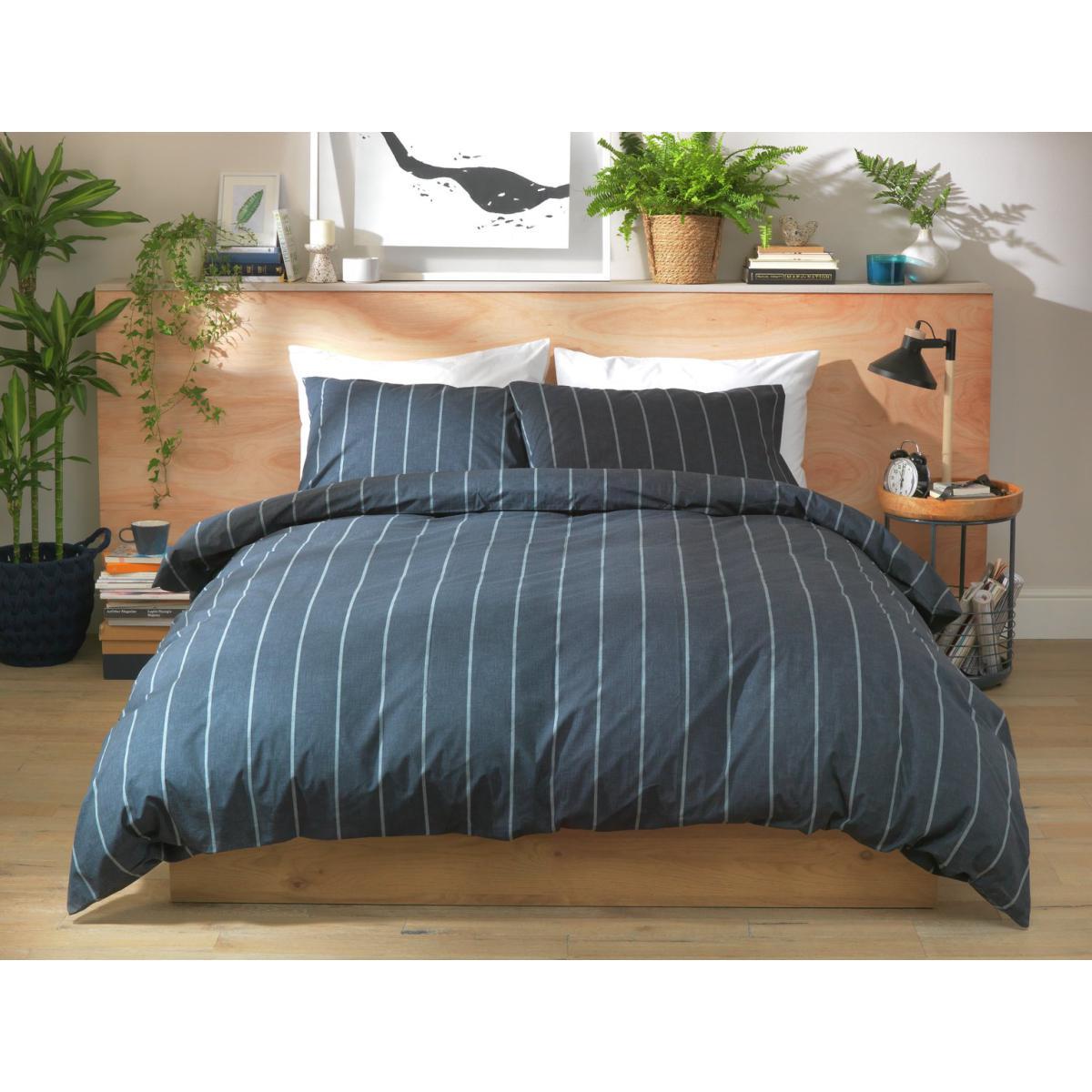 Set the mood with stripes. This effortlessly cool bedding set brings a luxurious hotel feel to your bedroom. It's crafted in 100% cotton percale and features a crisp navy pinstriped design that pairs well with most decors, from contemporary to country. The button fastening makes changing the sheets easy too. Soft, smart, and cosy.