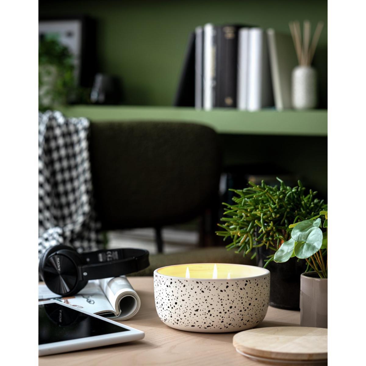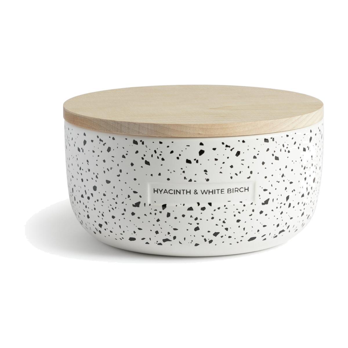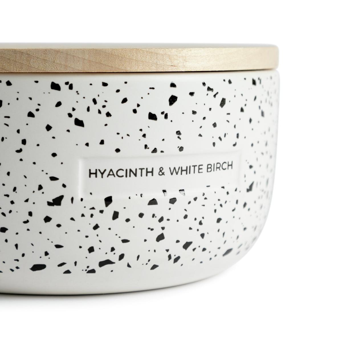Immerse yourself in the essence of springtime. Our hyacinth and white birch triple wick candle is a breath of fresh air. Delicately floral with warm woody undertones, the aroma is fresh and uplifting. A welcoming scent to impress your guests or just enjoy a little bathtime me-time. With a beautiful monochrome flecked design and natural wooden lid, this candle looks so good too. Relax and unwind. Time to treat your senses. See more in our collection of scented candles. Water Lily & White woods scent. Paraffin wax. Approximate burn time 30 hours. Size H8, W16, D16cm. Diameter 16cm.