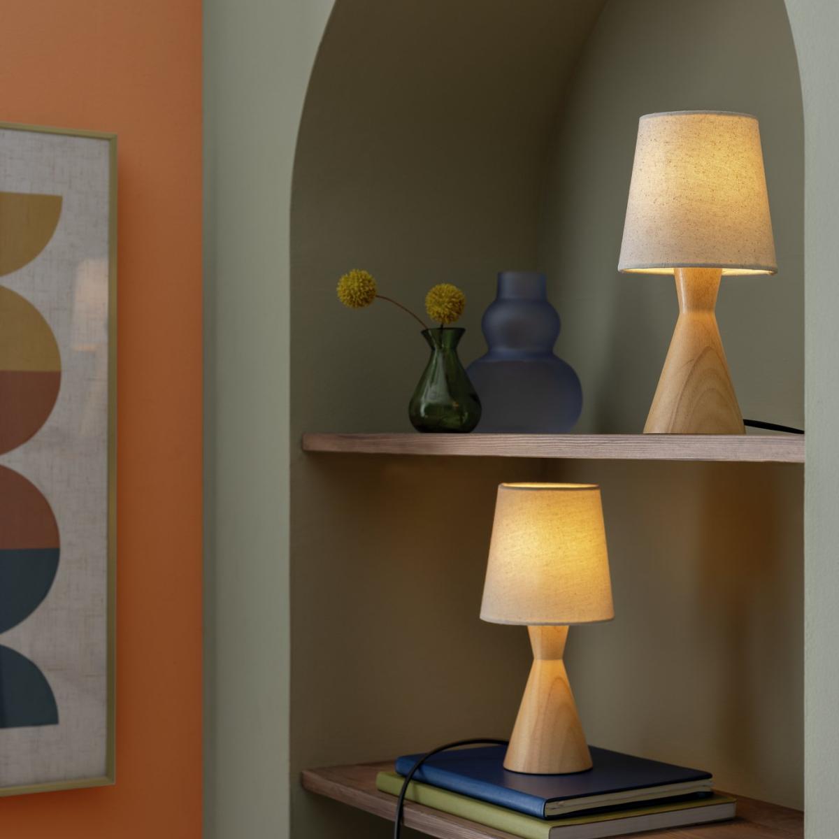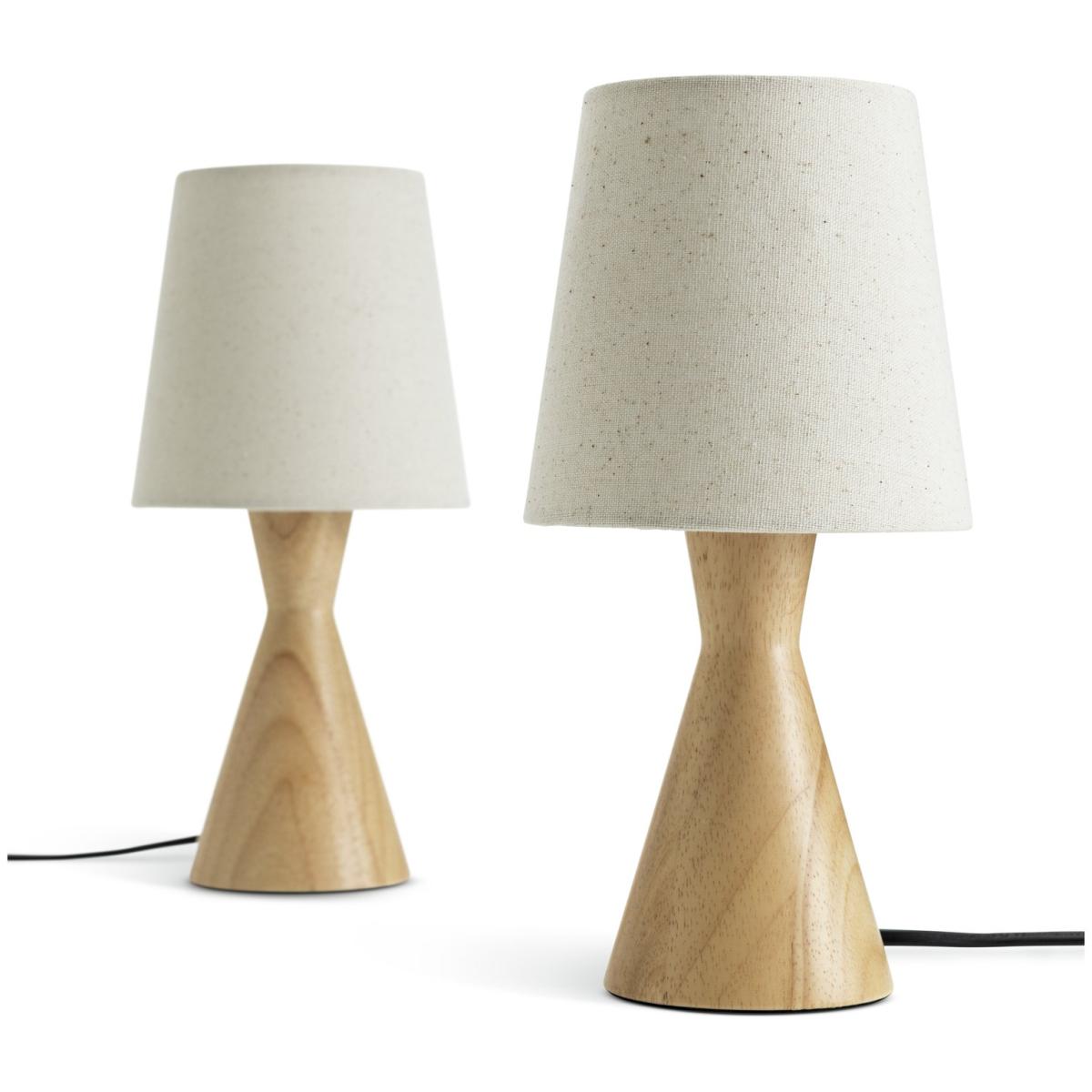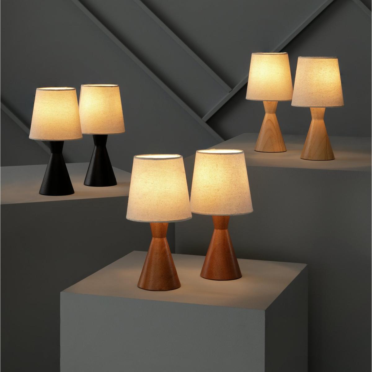 Modern sensibilities and natural charm come together in our smart pair of table lamps. White fabric shades perch atop contemporary rubber wood conical bases. Just the thing to bring balance and a light, ambient touch to your space. The inline switch means easy on, easy off. Dimensions: Overall size H26, Diameter 14cm. Shade size H13.5, D10cm. Diameter of base 9.6cm. Cord length 1.8m. Bulb Information: Bulbs required 2 x capsule G9 filament LED bulb(s) (not included). Recommended maximum wattage: 3 watts. LED bulb only. General Information: Shade colour: natural. Base colour: natural. Shade material: fabric. Base material: wood. In-line switch. IP rating 20 - not suitable for bathroom use. Supplied assembled. Product is mains powered plug in. This lighting product is a class 2 fitting. Modern Wood. Manufacturer's 1 year guarantee.