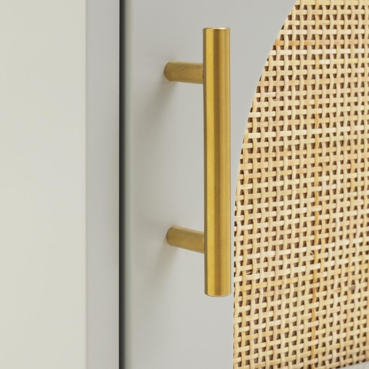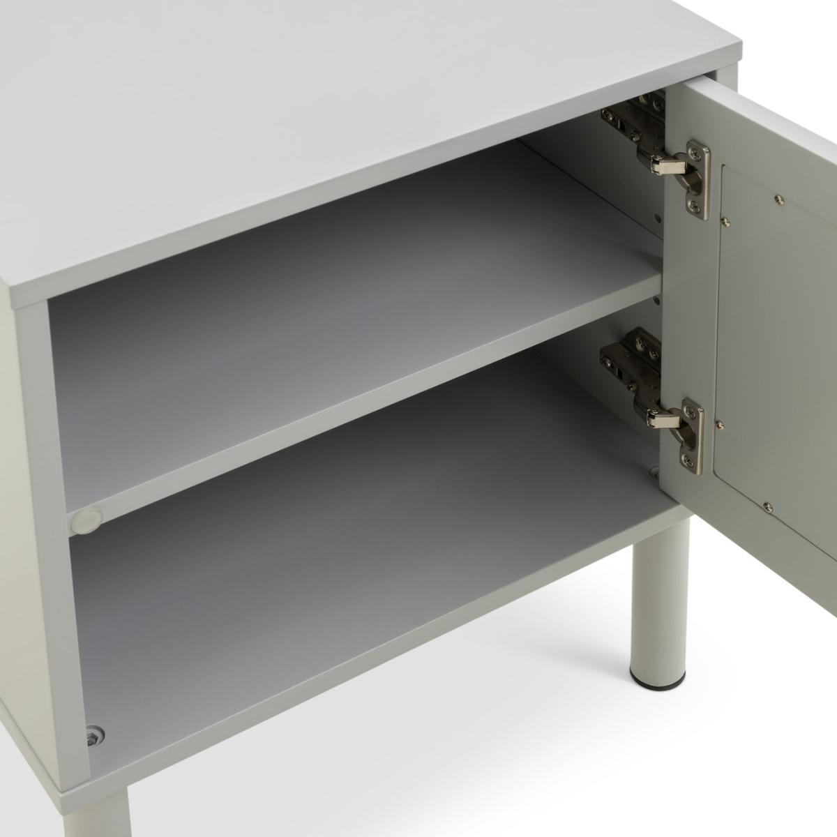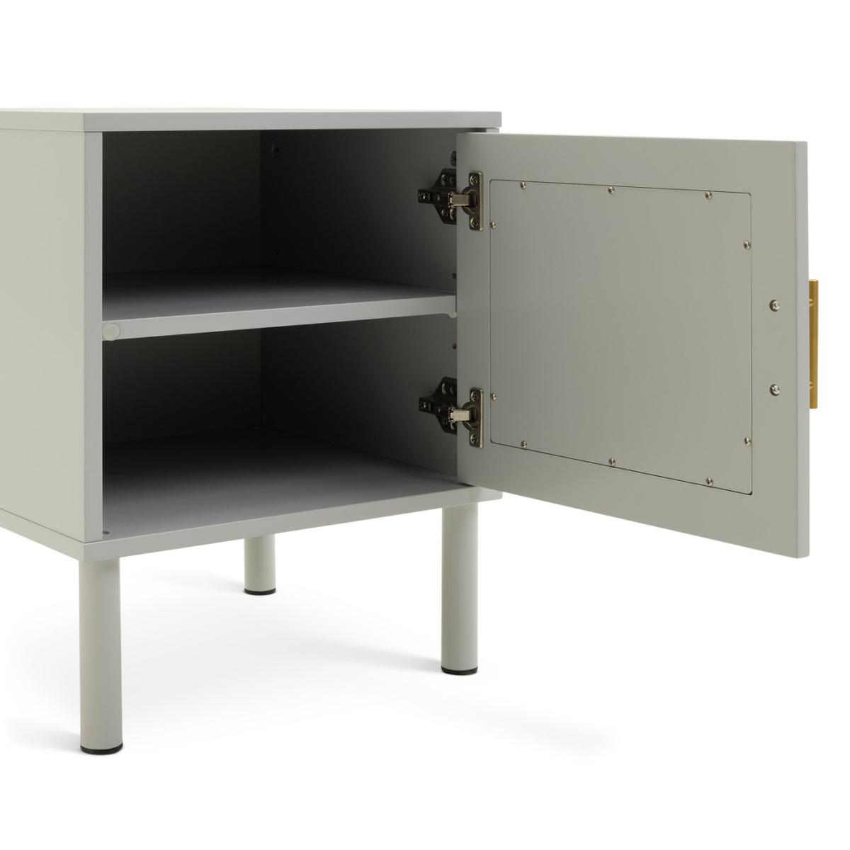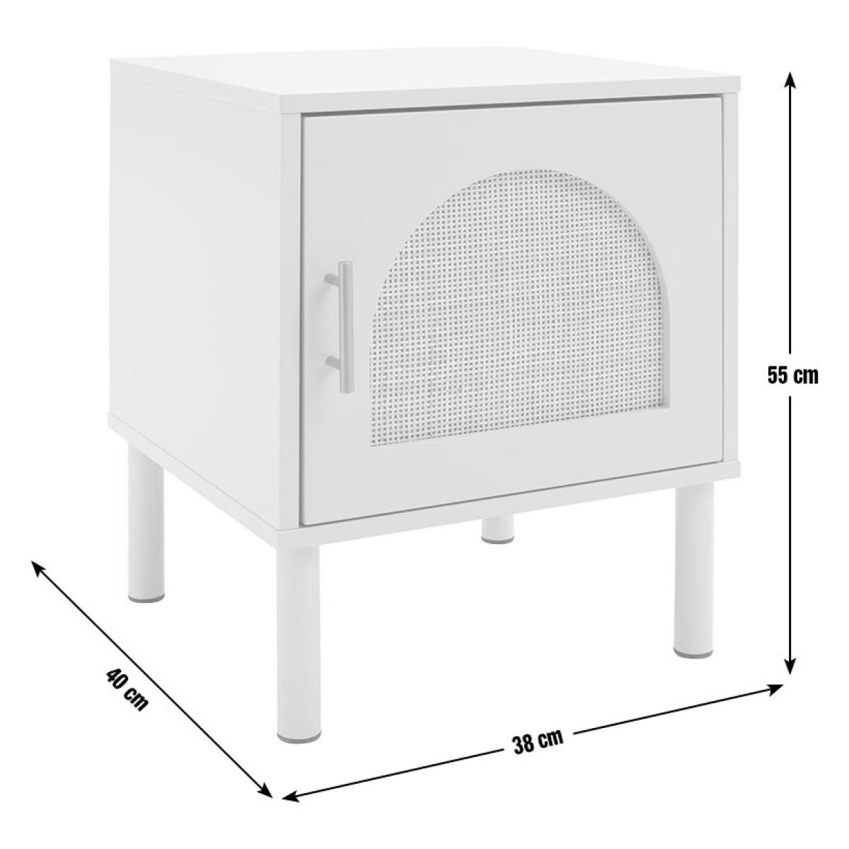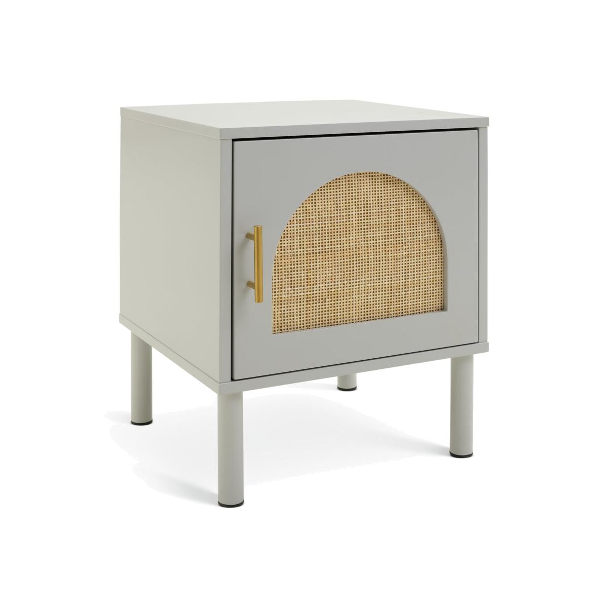 Fabulously fashioned for bedtime essentials. Painted grey, inlaid with natural cane insets and finished with slim golden handles, this bedside table has an air of boho charm meets French chic. Behind the door are 2 handy shelves. Grey metal legs add an elevated contemporary touch. Part of the Monica collection. Made of MDF. Metal handles. Soft close. 1 door. 1 fixed shelf. 1 adjustable shelf. Self-assembly - 1 person recommended. If this product is over 60cm high it must be securely attached to the wall to prevent overturning. Dimensions: Size H55, W38, D40cm. Handle size: L10, W3cm. Weight 10.3kg. Package Dimensions: Package 1 dimensions: H53.5, W44.3, D13.5cm. Package 1 weight: 11.5kg. General information: FSC certified meaning the materials used for this product are responsibly sourced. Manufacturer's 1 year guarantee.