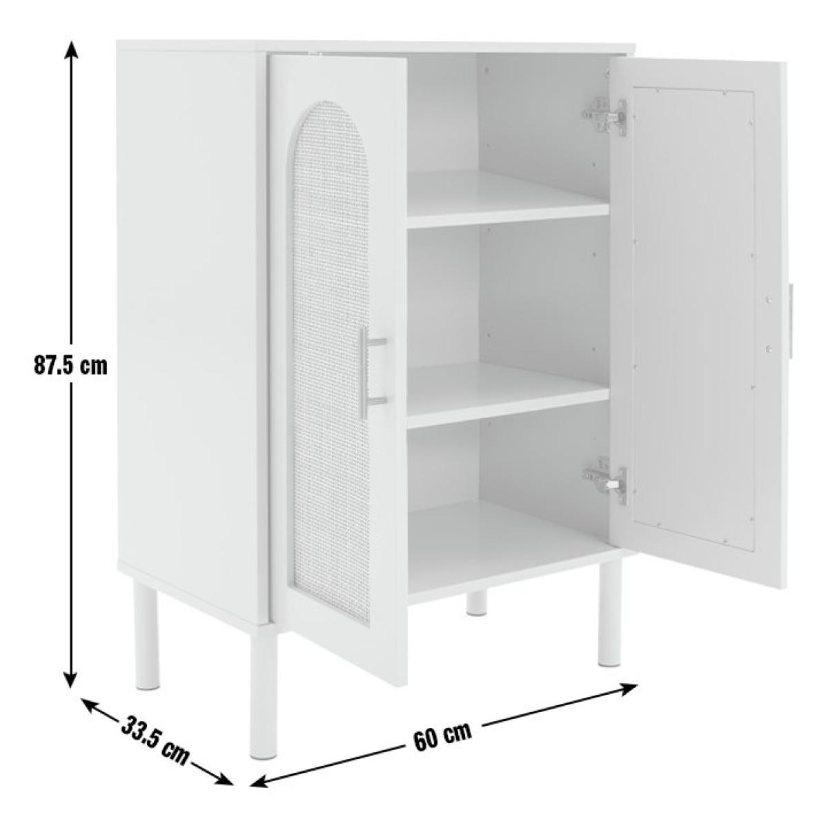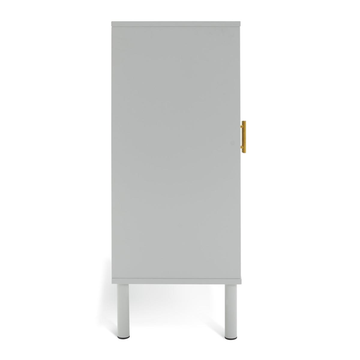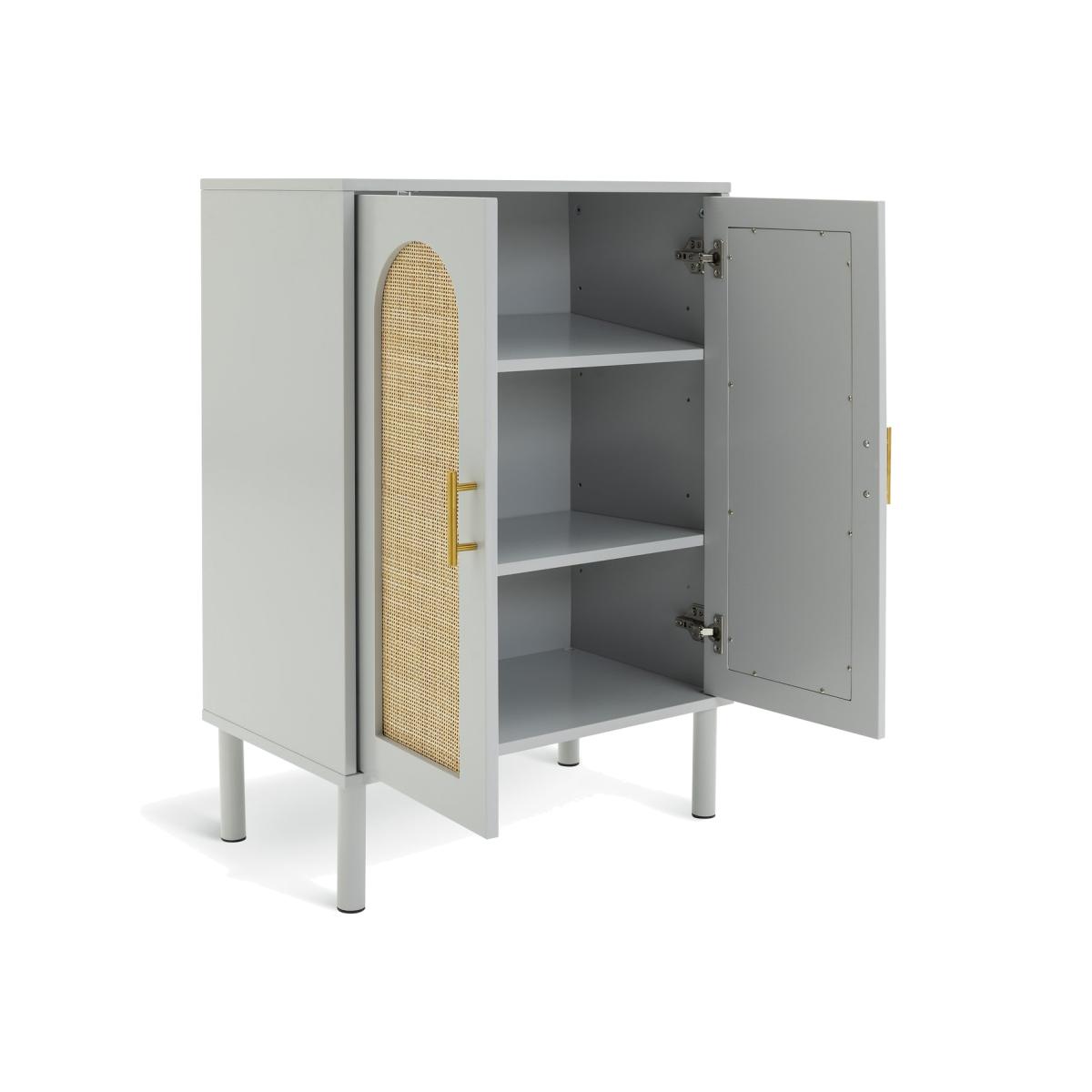 A fabulously fashioned home for your favourite footwear. Painted grey, inlaid with natural cane arches and finished with glam golden handles, this 2-door wooden cabinet has an air of boho charm meets French chic. This shoe cabinet can comfortably take 9 pairs of shoes or boots. Grey metal legs add an elevated contemporary touch. Part of the Monica collection. Made from MDF with a painted finish. Size H87.5, W60, D33.5cm. Weight 18.3kg. Stores an average of 9 pairs of shoes. Freestanding. Self-assembly. If this product is over 60cm high it must be securely attached to the wall to prevent overturning. Package Dimensions: Package 1 dimensions: H16.6, W40.5, D83cm. Package 1 weight: 20.1kg. FSC certified meaning the materials used for this product are responsibly sourced. General Information: Manufacturer's 1 year guarantee.