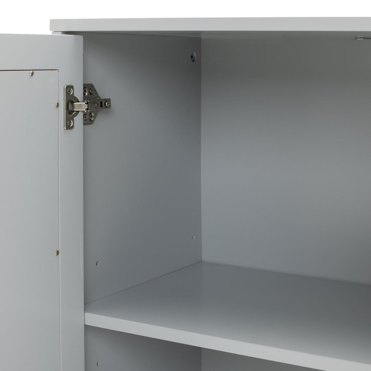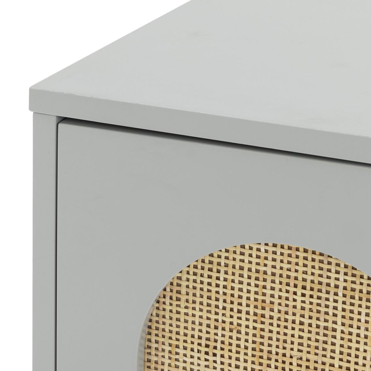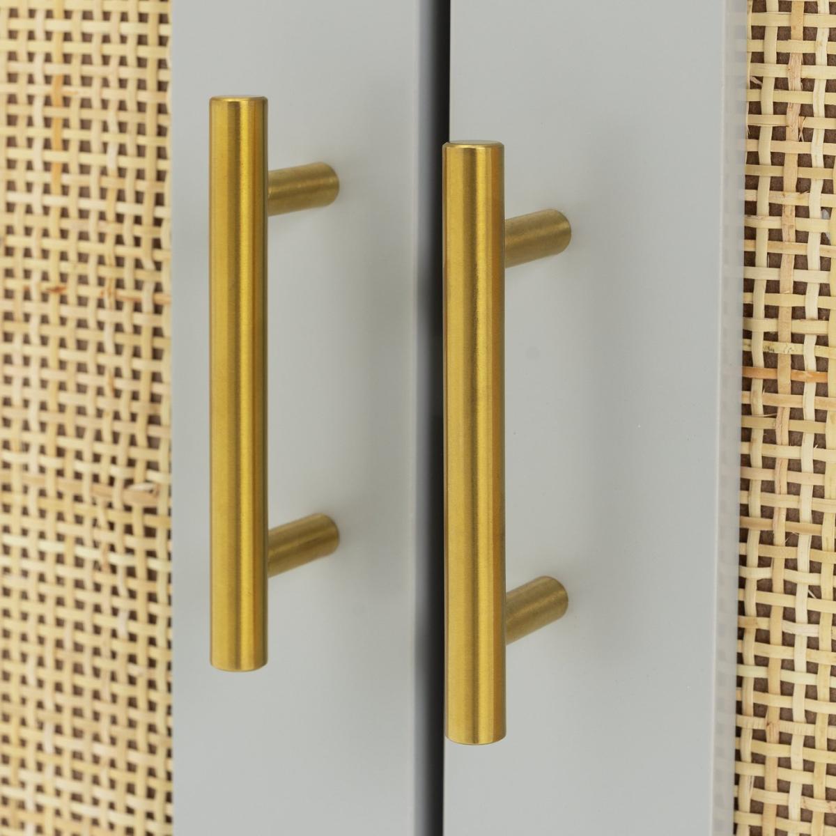 A fabulously fashioned home for your favourite footwear. Painted grey, inlaid with natural cane arches and finished with glam golden handles, this 2-door wooden cabinet has an air of boho charm meets French chic. This shoe cabinet can comfortably take 9 pairs of shoes or boots. Grey metal legs add an elevated contemporary touch. Part of the Monica collection. Made from MDF with a painted finish. Size H87.5, W60, D33.5cm. Weight 18.3kg. Stores an average of 9 pairs of shoes. Freestanding. Self-assembly. If this product is over 60cm high it must be securely attached to the wall to prevent overturning. Package Dimensions: Package 1 dimensions: H16.6, W40.5, D83cm. Package 1 weight: 20.1kg. FSC certified meaning the materials used for this product are responsibly sourced. General Information: Manufacturer's 1 year guarantee.
