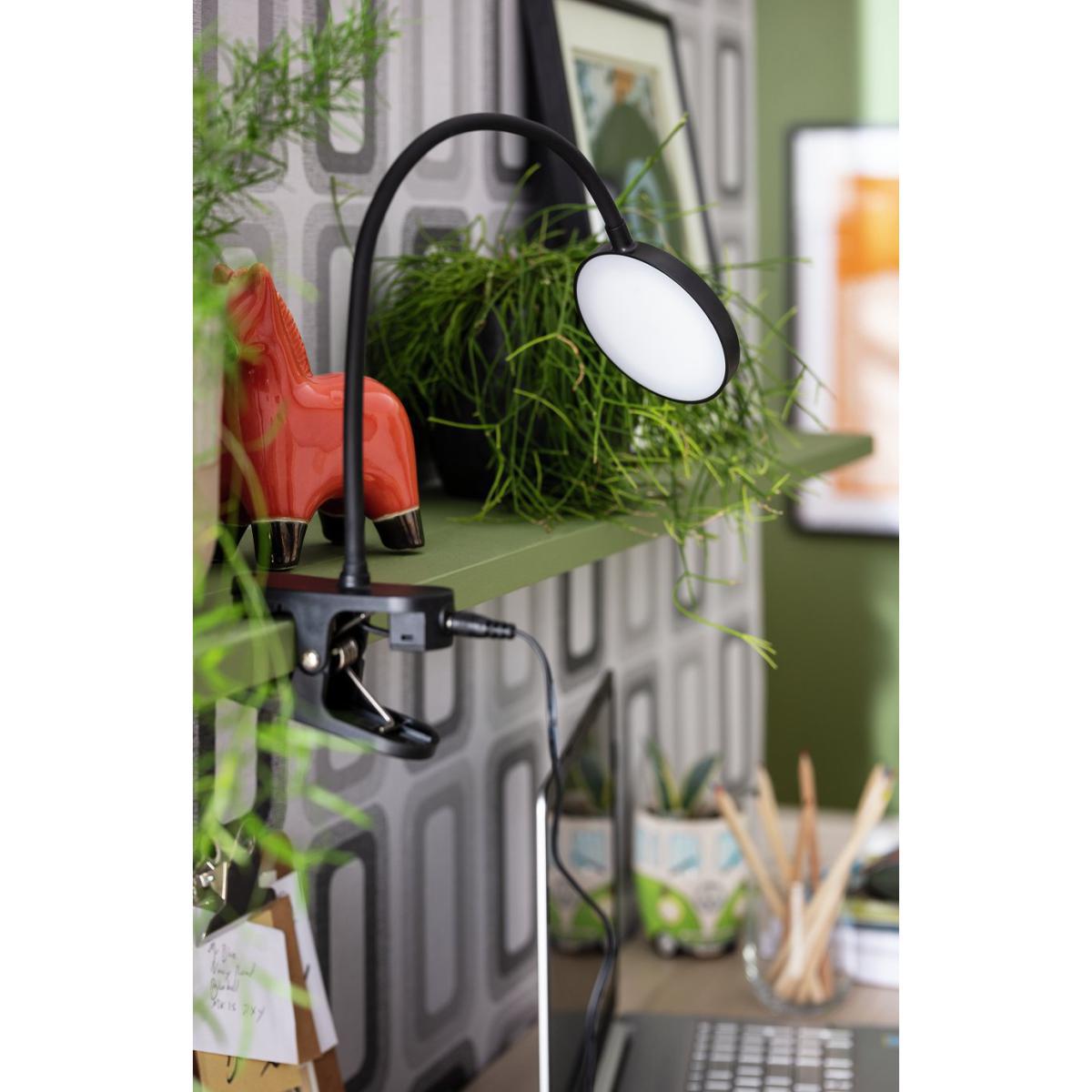I love this little clip lamp for its blend of functionality and modern design. Its sleek black finish and flexible neck make it a versatile addition perfect for task lighting or adding a contemporary touch to a desk, bedside table, or even a reading nook. It works particularly well in minimalist or industrial interiors, where its clean lines can complement other monochrome or metal accents. For styling tips, consider clipping it onto shelves, headboards, or even open kitchen cabinets to save space and introduce an adjustable light source. Its understated look allows it to seamlessly fit into both home offices and living spaces, offering practical illumination without overpowering your décor.