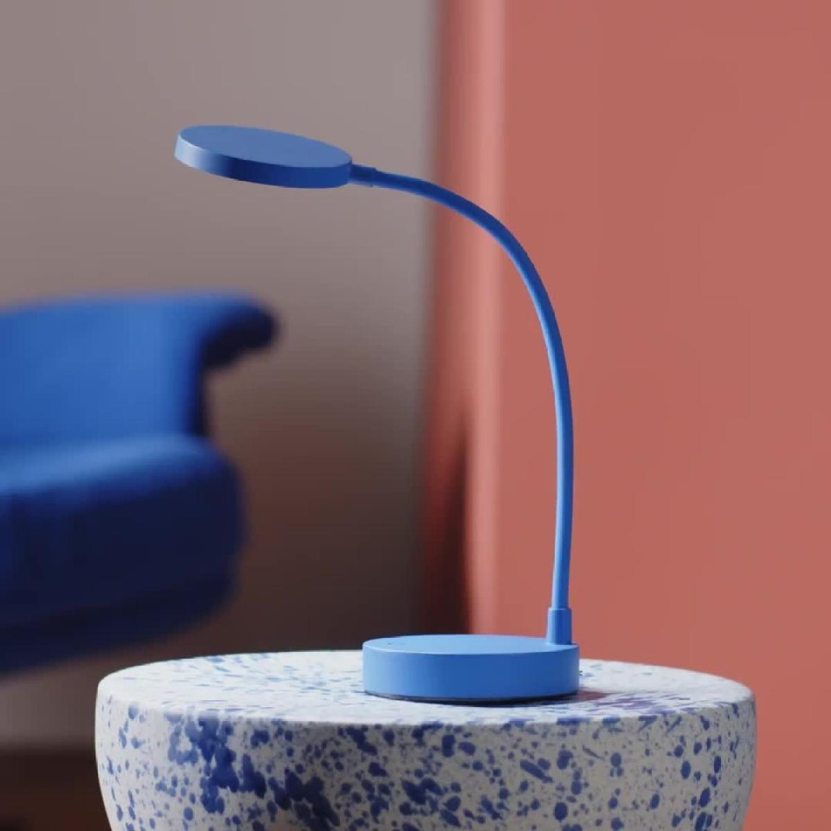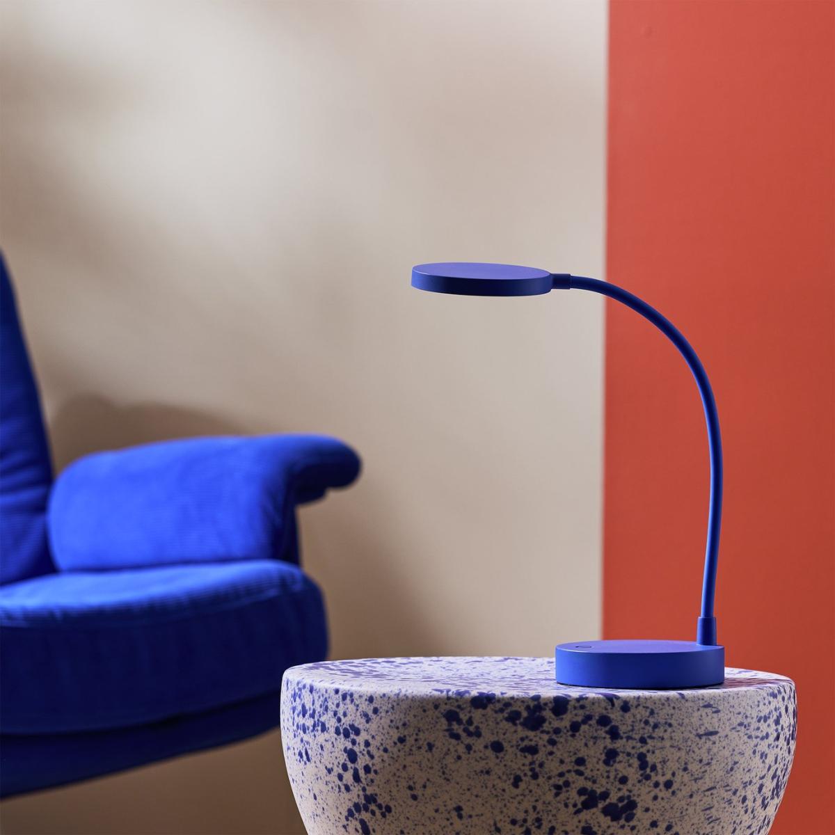 Brighten your day, or your workspace, with this flexible blue desk lamp. Shine a white LED light exactly where you need it. The long pliable neck can be bent to suit, and the head angled in any direction. Could it get any easier? Yes, it's touch sensor operated, just tap on and off. And it's rechargeable, so it can go anywhere. Reading, working, puzzling, gaming or crafting, Mopsa aims to please. Dimensions: Overall size H29, W23, D11 cm. Diameter 23cm. Shade size H1, D9cm. Diameter of base 11cm. Cord length 1m. Bulb Information: Integrated LED bulb(s)(included). LED bulb only. Colour rendering index 80. Colour temperature 3000. K. Rated luminous flux 120. General Information: Shade colour: blue. Base colour: blue. Shade material: plastic. Base material: plastic. Product features: USB connectivity. Switch on product base. IP rating 20not suitable for bathroom use. Fully assembled. This lighting product is a class 3 fitting. Part of the Rechargeable collection. Manufacturer's 2 year guarantee.
