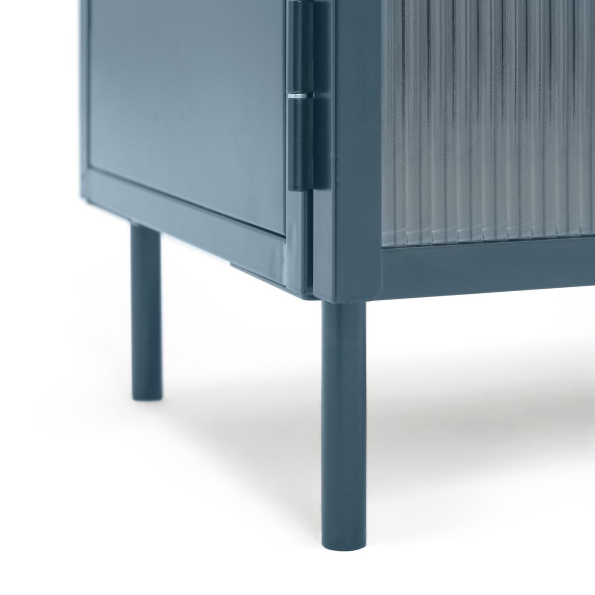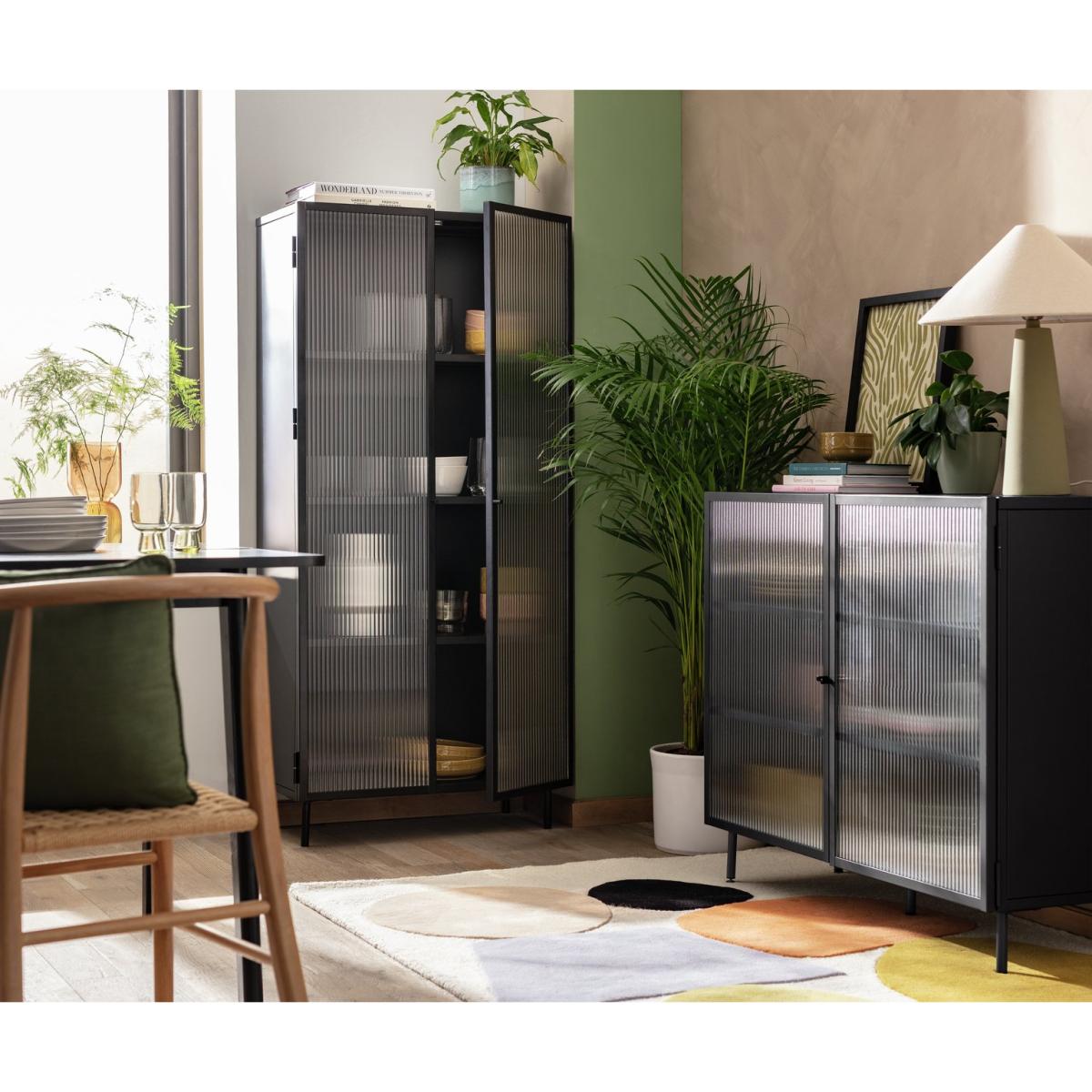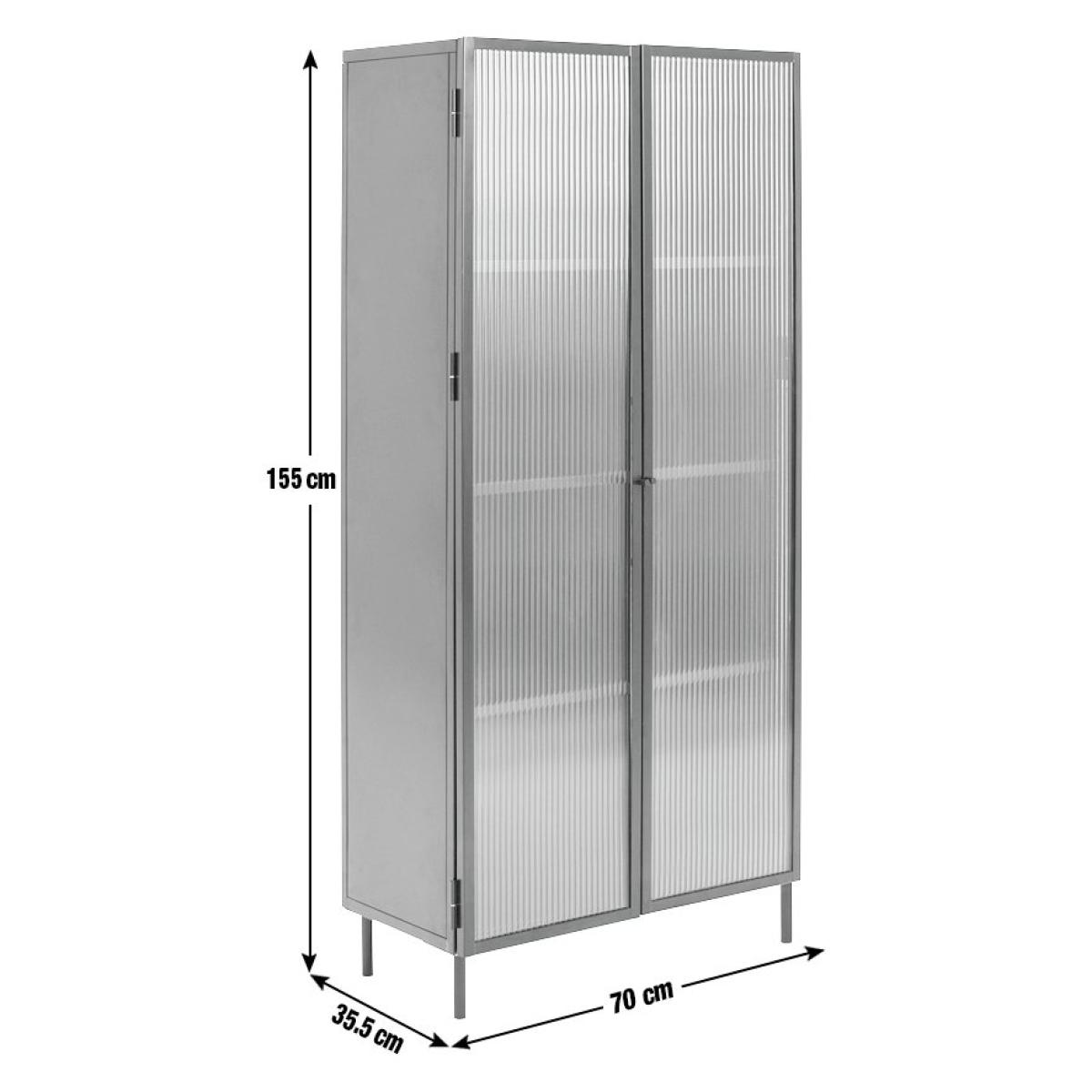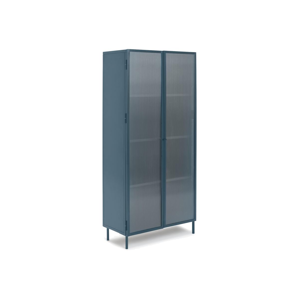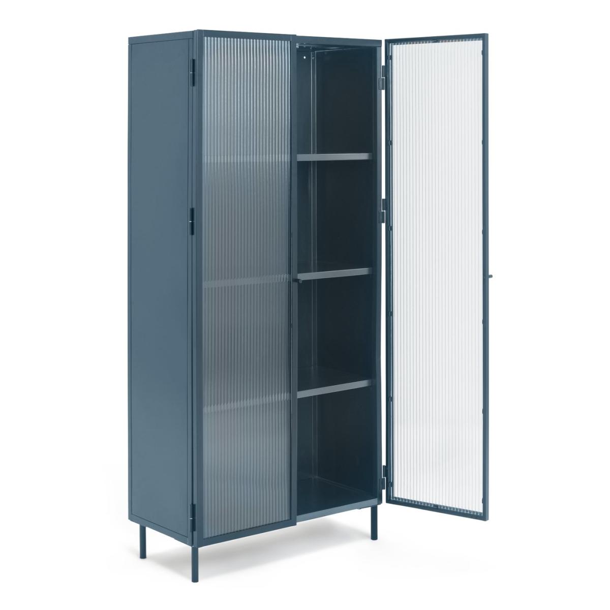 Want a neat place to showcase your favourite collectibles, photos, or personal library? Our 2 door display cabinet is just the spot. In smooth powder coated blue steel it has a cool, modern industrial look. And behind the 2 fluted glass doors are 4 spacious shelves. So there's plenty of room for everything that makes you happy. Go on, fill it up. Slim minimalist metal handles and feet add to this tall cabinet's contemporary charm. Like the look of this Morillo cabinet? Check out other complementary pieces to go with this collection. Part of the Morillo collection. Size H155, W70, D35.5cm. Weight 35.1kg. Maximum load weight of 50kg. 4 shelves made from metal including 3 fixed shelves. 2 doors made from glass. Black metal handles. Self-assembly - 2 people recommended. If this product is over 60cm in high it must be securely attached to the wall to prevent over turning. (fixing included). Package Dimensions: Package 1 dimensions: H18.5, W152.5, D40.5cm. Package 1 weight: 30.4kg. Package 2 dimensions: H11, W96, D45cm. Package 2 weight: 8.9kg. General Information: We are excited to be welcoming some of our favourite HOME products into the Habitat range. Your product may arrive in Habitat or HOME packaging.