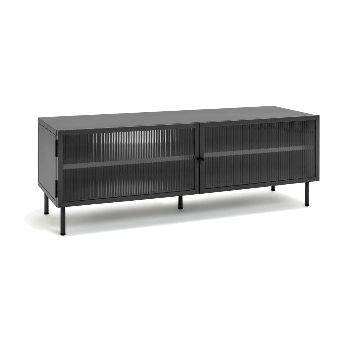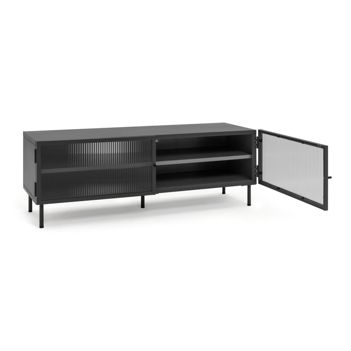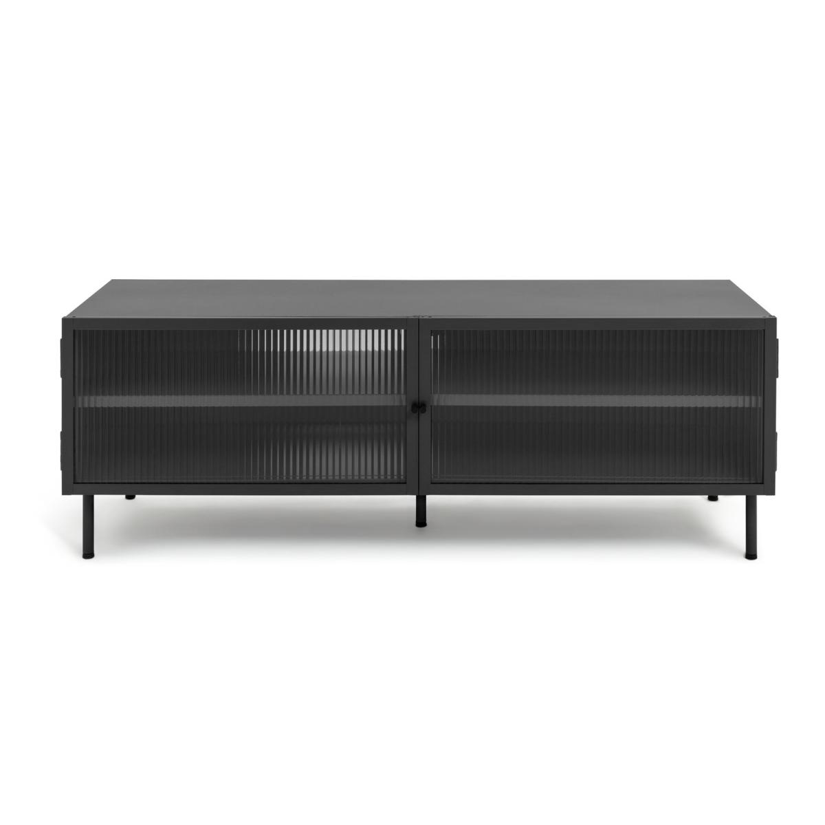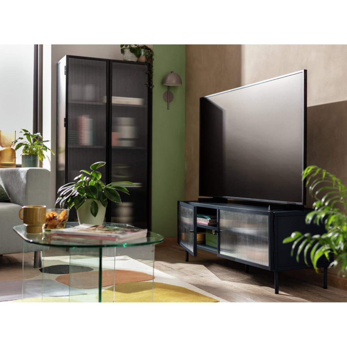 Want a neat place to display your big screen? Our 2 door TV unit is just the spot. In smooth powder coated black steel it has a cool, modern industrial look. And behind the 2 fluted glass doors are 2 spacious shelves for consoles, cables and CDs. So there's plenty of room for all your entertainment. Go on, fill it up.