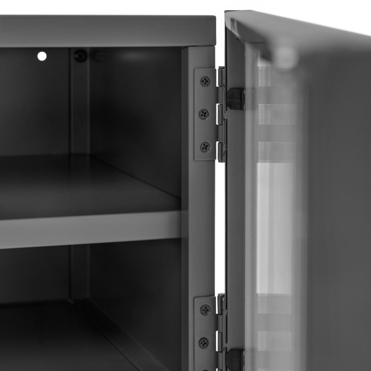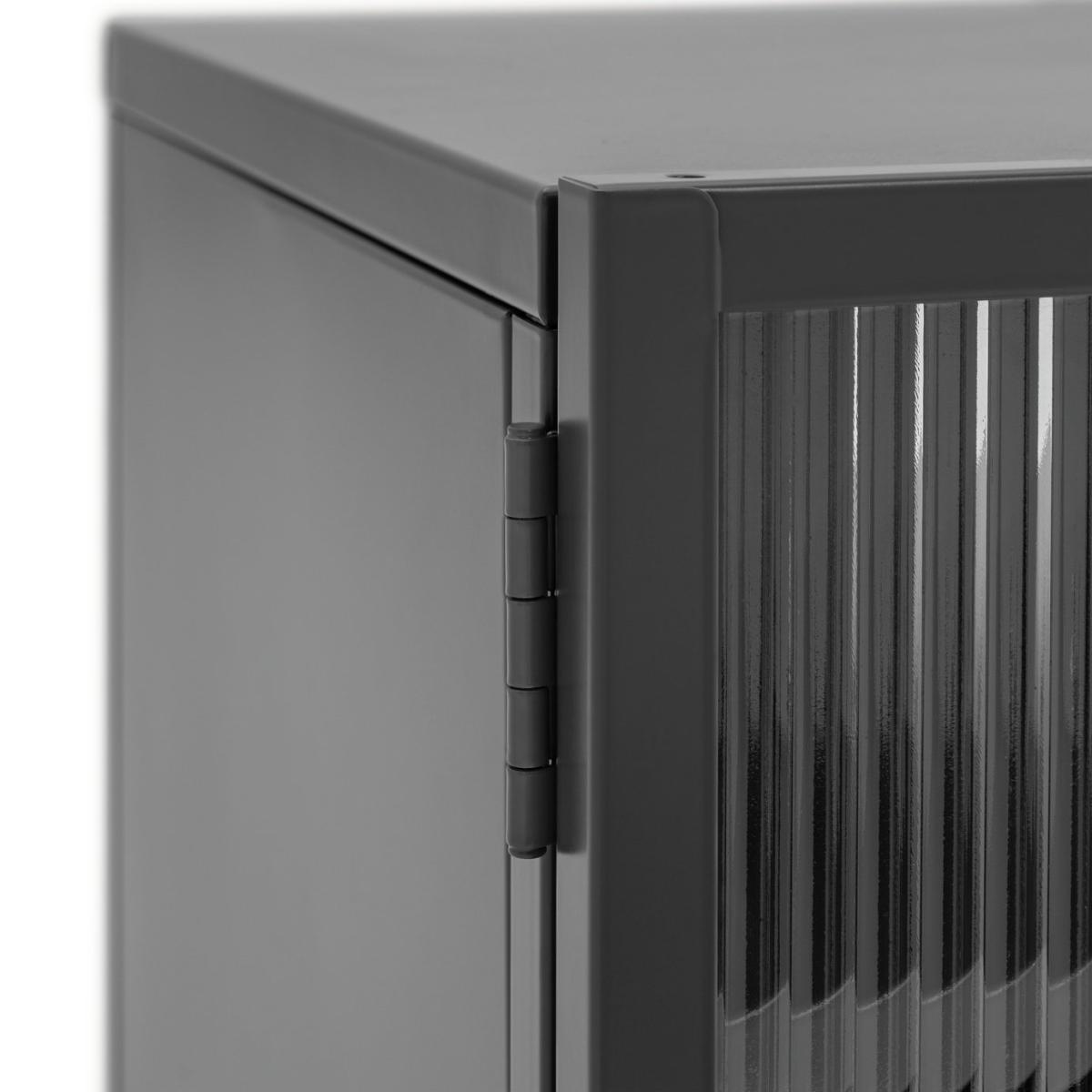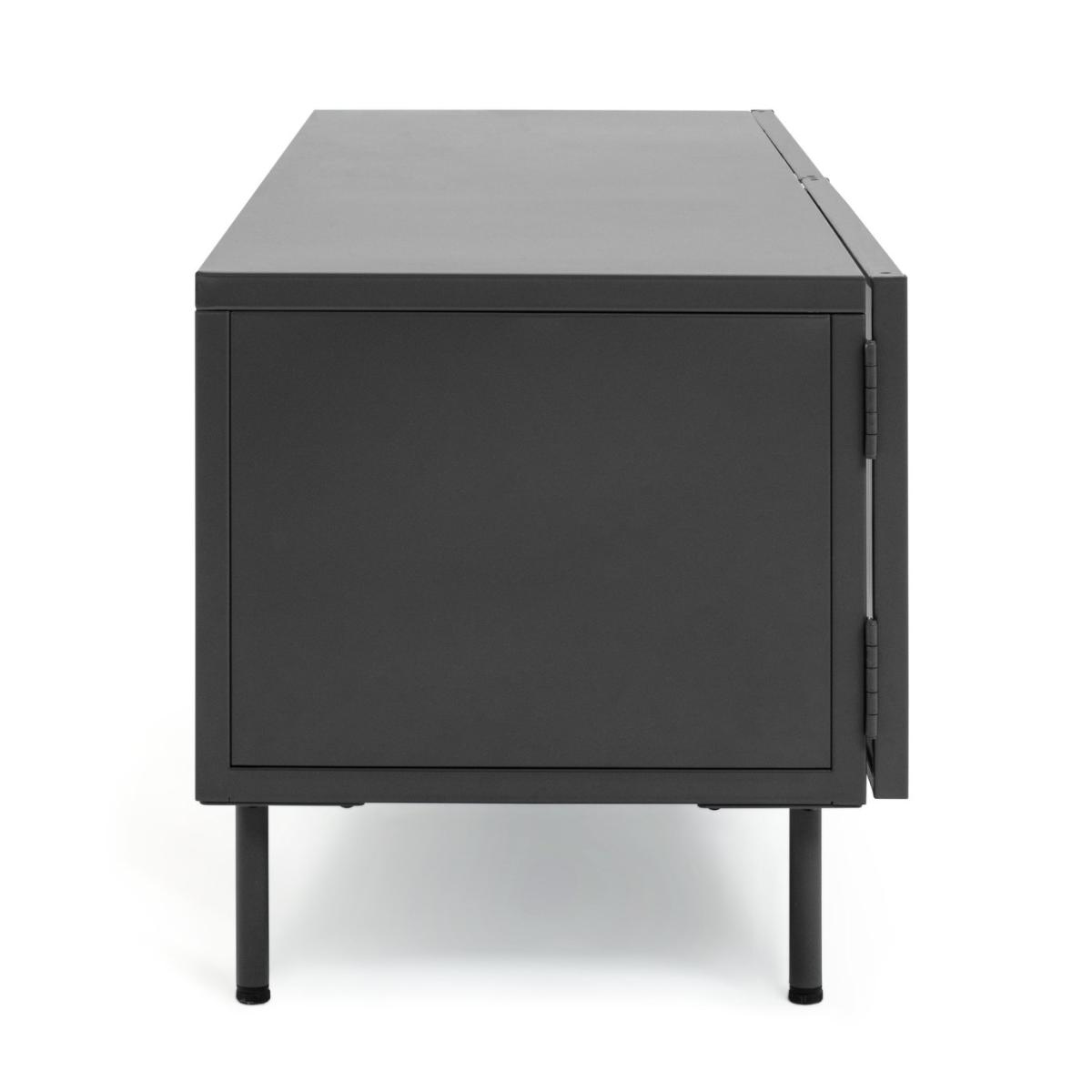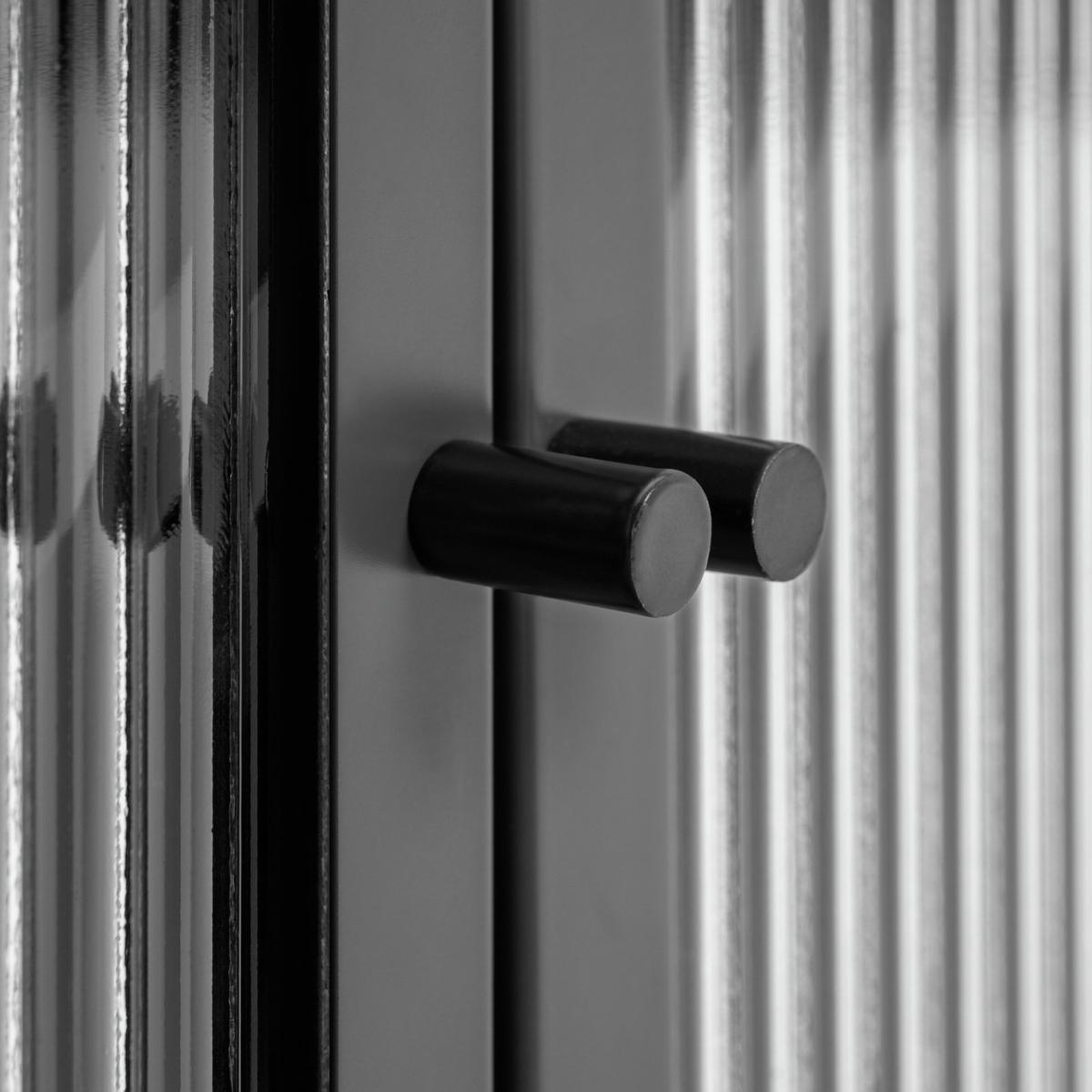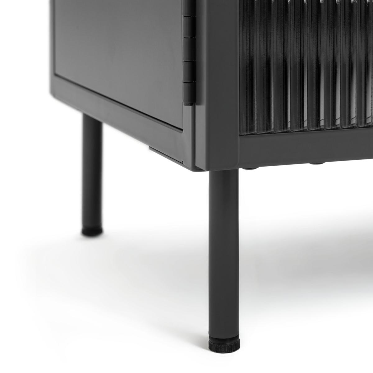 Want a neat place to display your big screen? Our 2 door TV unit is just the spot. In smooth powder coated black steel it has a cool, modern industrial look. And behind the 2 fluted glass doors are 2 spacious shelves for consoles, cables and CDs. So there's plenty of room for all your entertainment. Go on, fill it up.