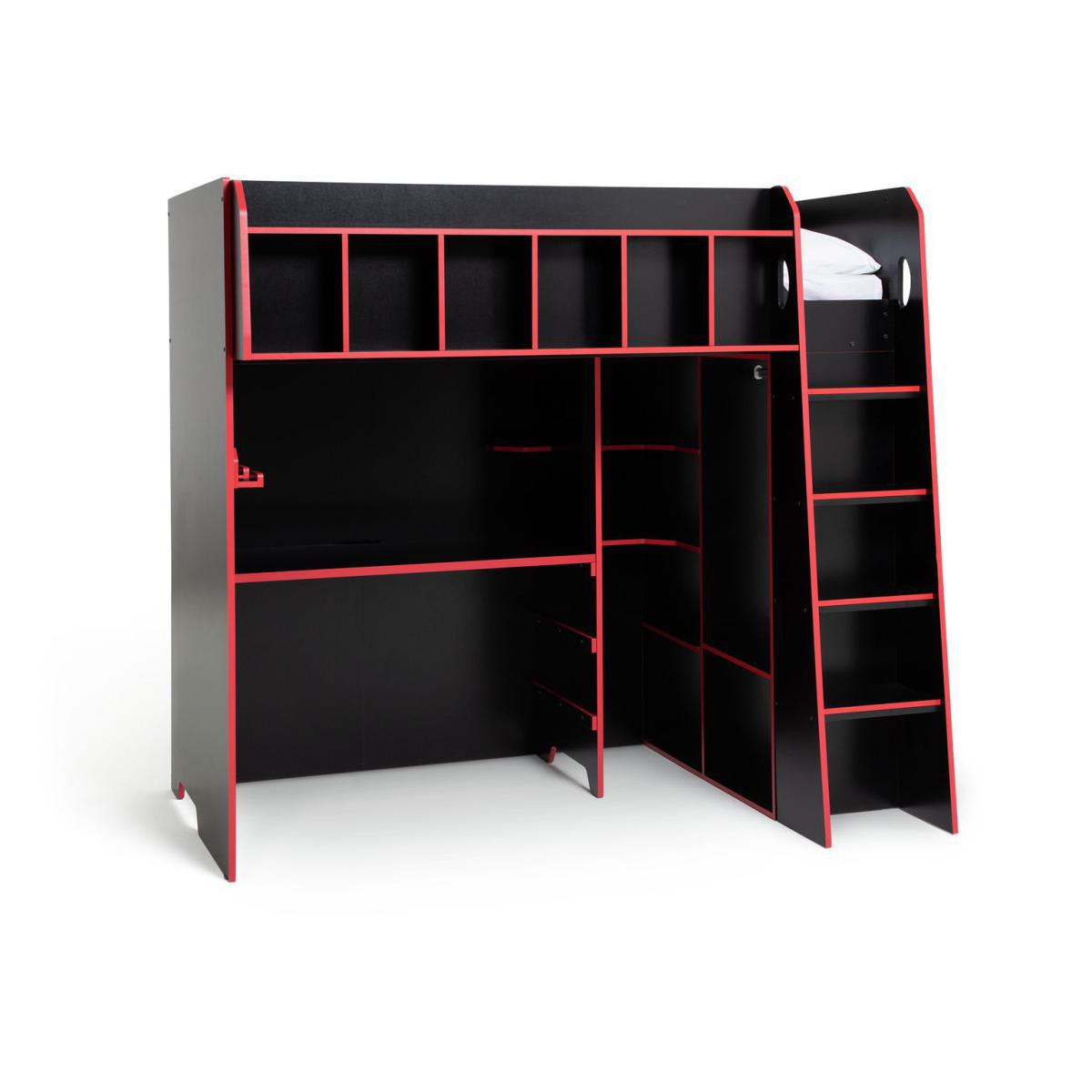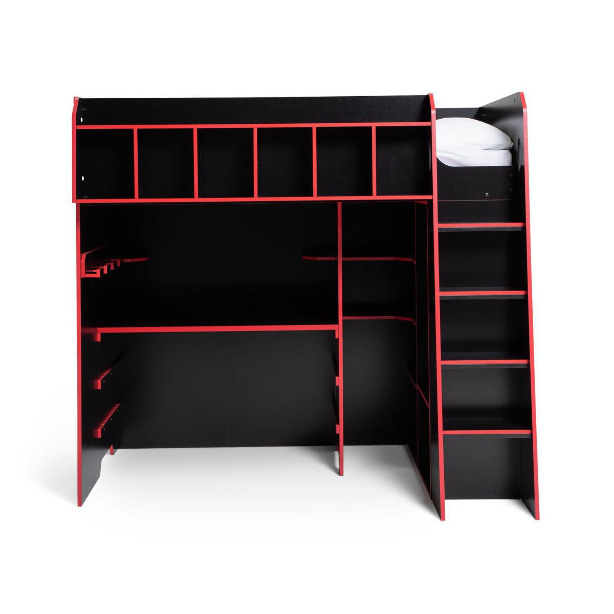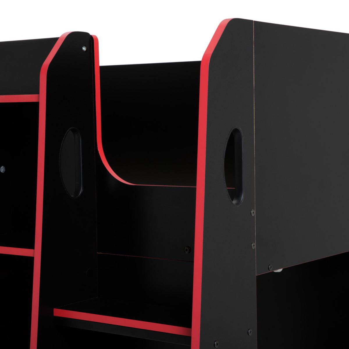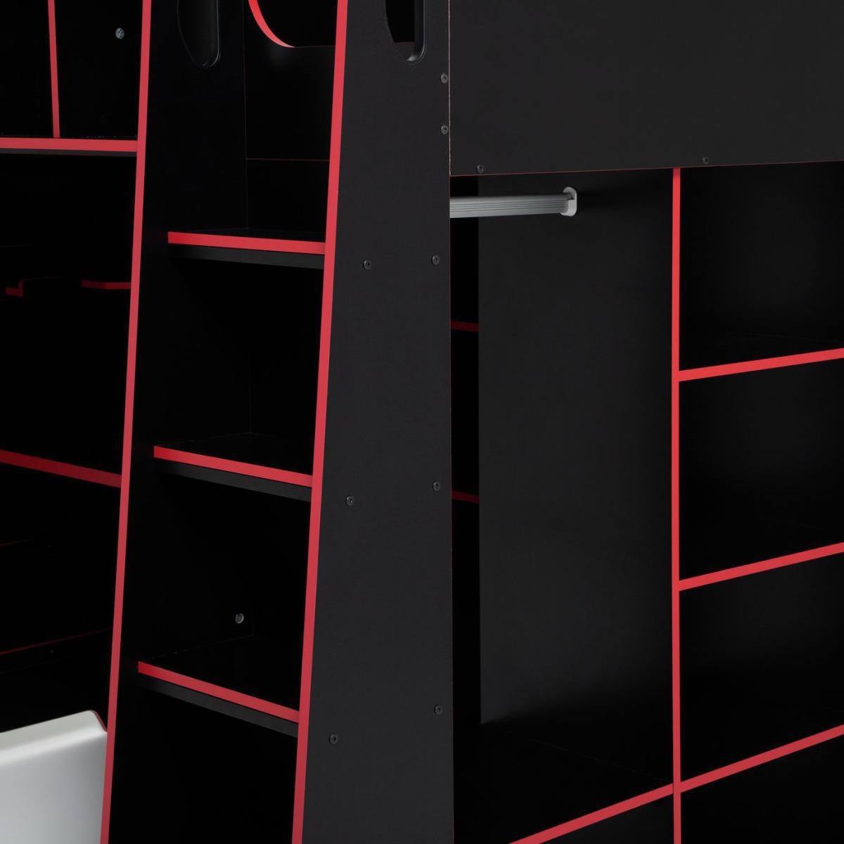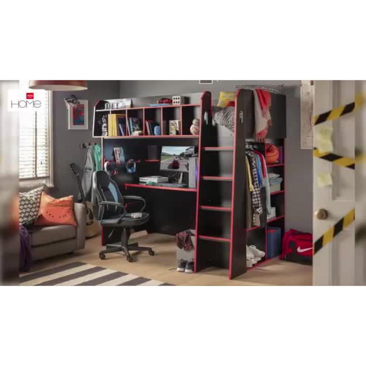 The Multi-Gaming High Sleeper Bed for gamers maximises gaming comfort, storage functionality, and style. Featuring 6 front shelf compartments, a specially designed shelf for headphones, controllers and accessories, adjustable height desk surface with 3 setting levels for ergonomic setup, a hanging rail with 2 open shelves. 3 tier corner open storage and cable management cut-outs. It comes in black finish and a coloured edge banding, and a curved D handles design for an easy soft-grip.