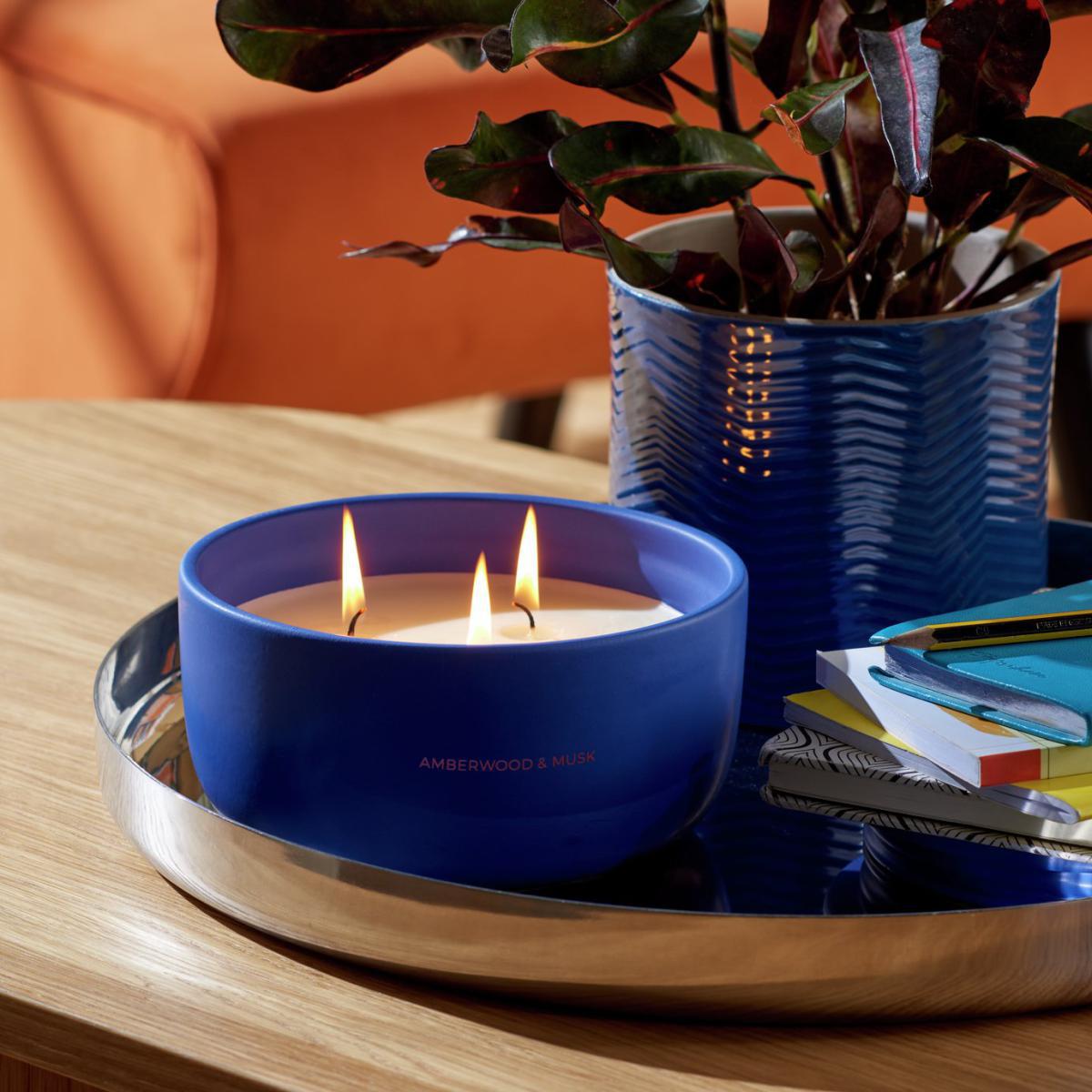 Soothe your senses. Let this Amberwood and Musk candle transform your mood with its warm and earthy fragrance full of woody notes. Intimate and soothing, it creates an atmosphere of relaxation. Settle down with a good book or take time to enjoy a few moments of mindfulness. You're worth it. Even better, it has 2 wicks for a richer fragrance. The brilliant blue packaging adds a pop of colour to your space. Just light and unwind.