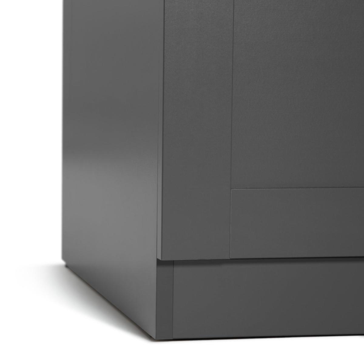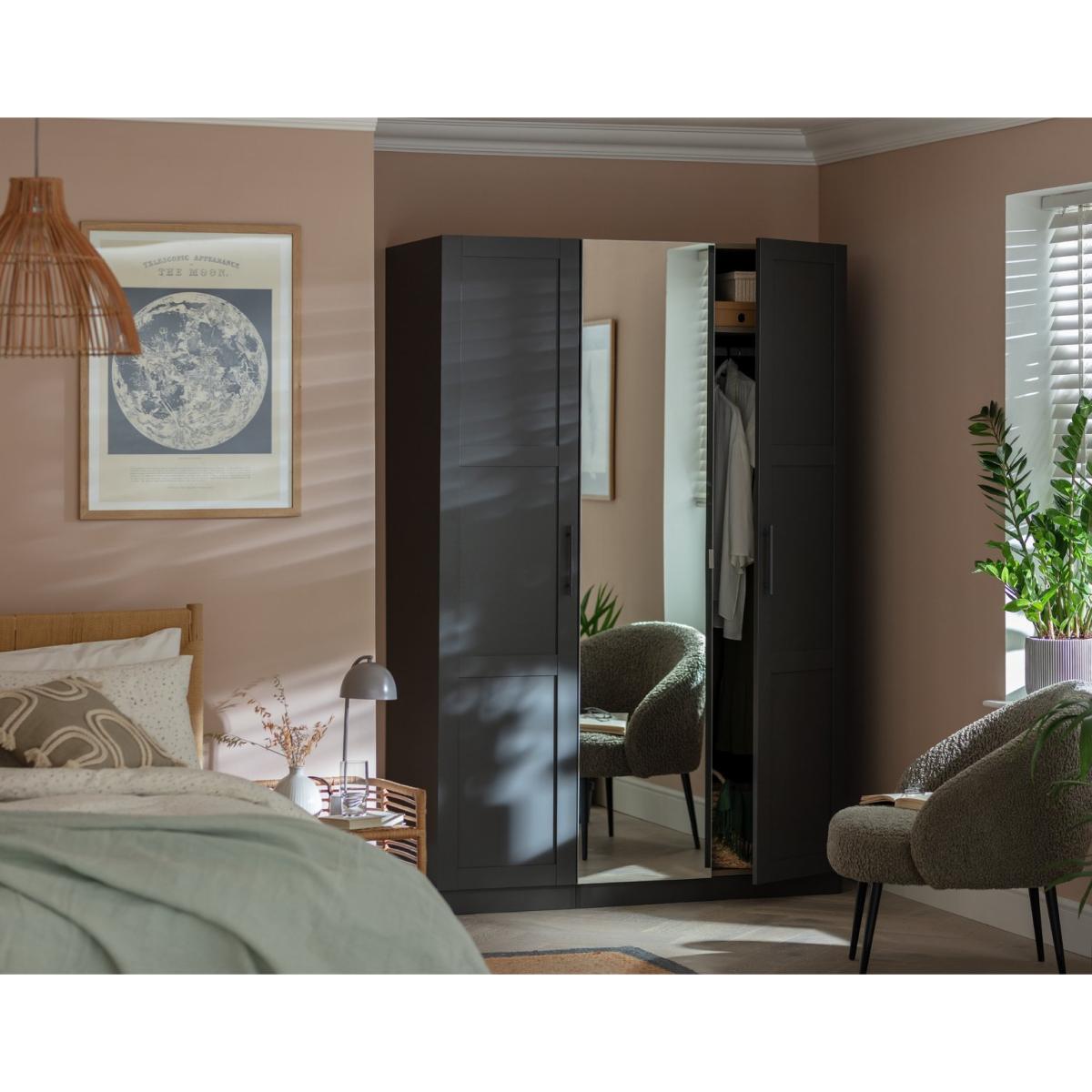 I love this wardrobe for its sleek, modern look and versatile functionality. The anthracite finish is perfect for contemporary interiors, especially those leaning towards minimalist, industrial, or monochrome schemes. Its panelled design adds subtle texture without overwhelming the space, making it ideal for bedrooms that need a clean, streamlined storage solution. Practical styling tips include pairing it with matte black or chrome hardware and integrating minimalist accessories - like subdued lighting or simple bedding - to create a balanced, cohesive look. It also works well in multifunctional rooms, thanks to the mirror in the centre, which provides both practical dressing room functionality and helps make the room appear larger.