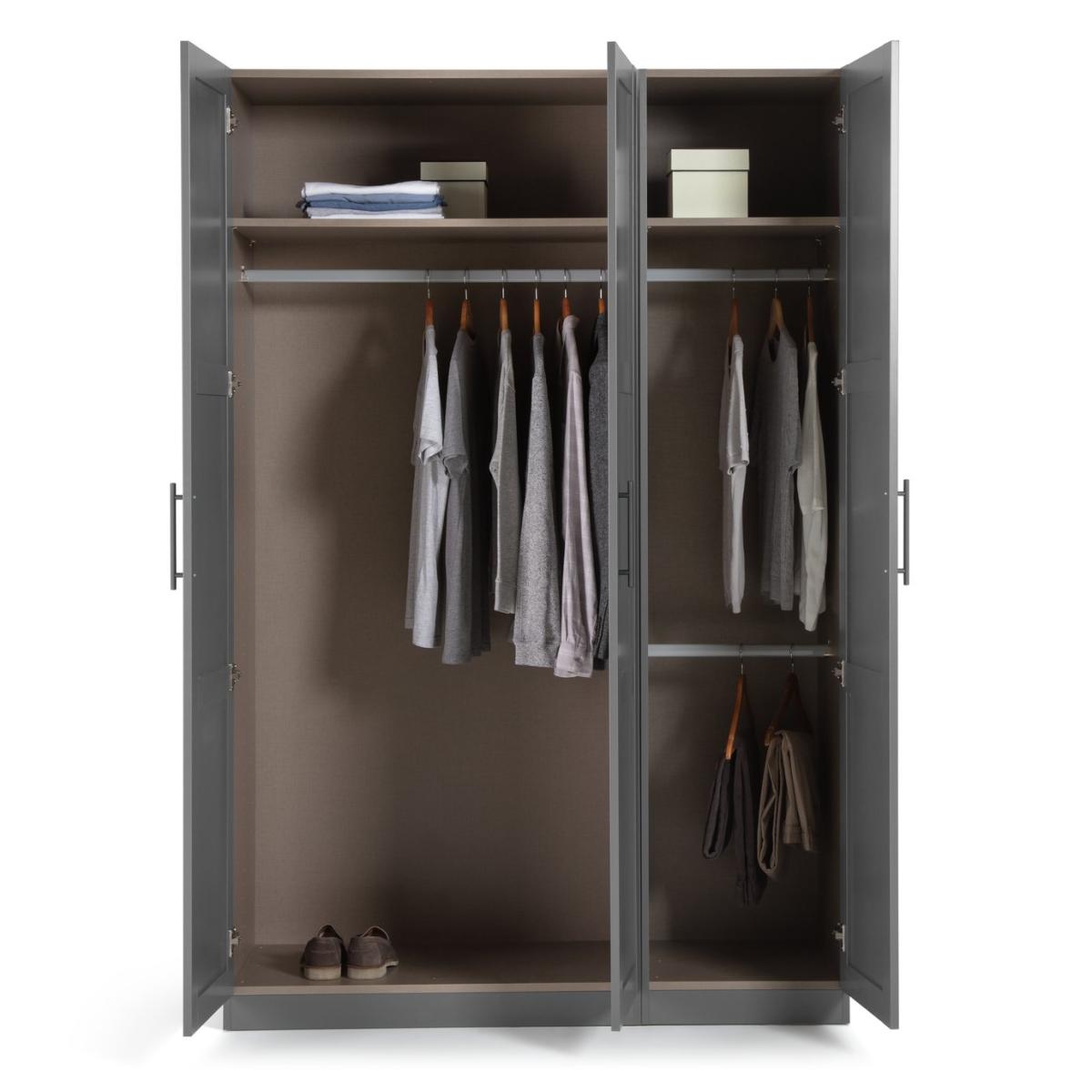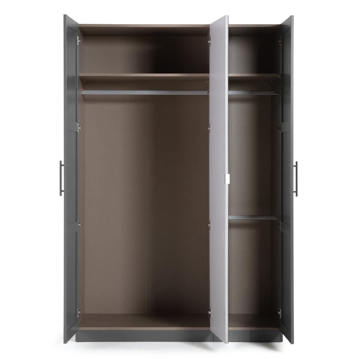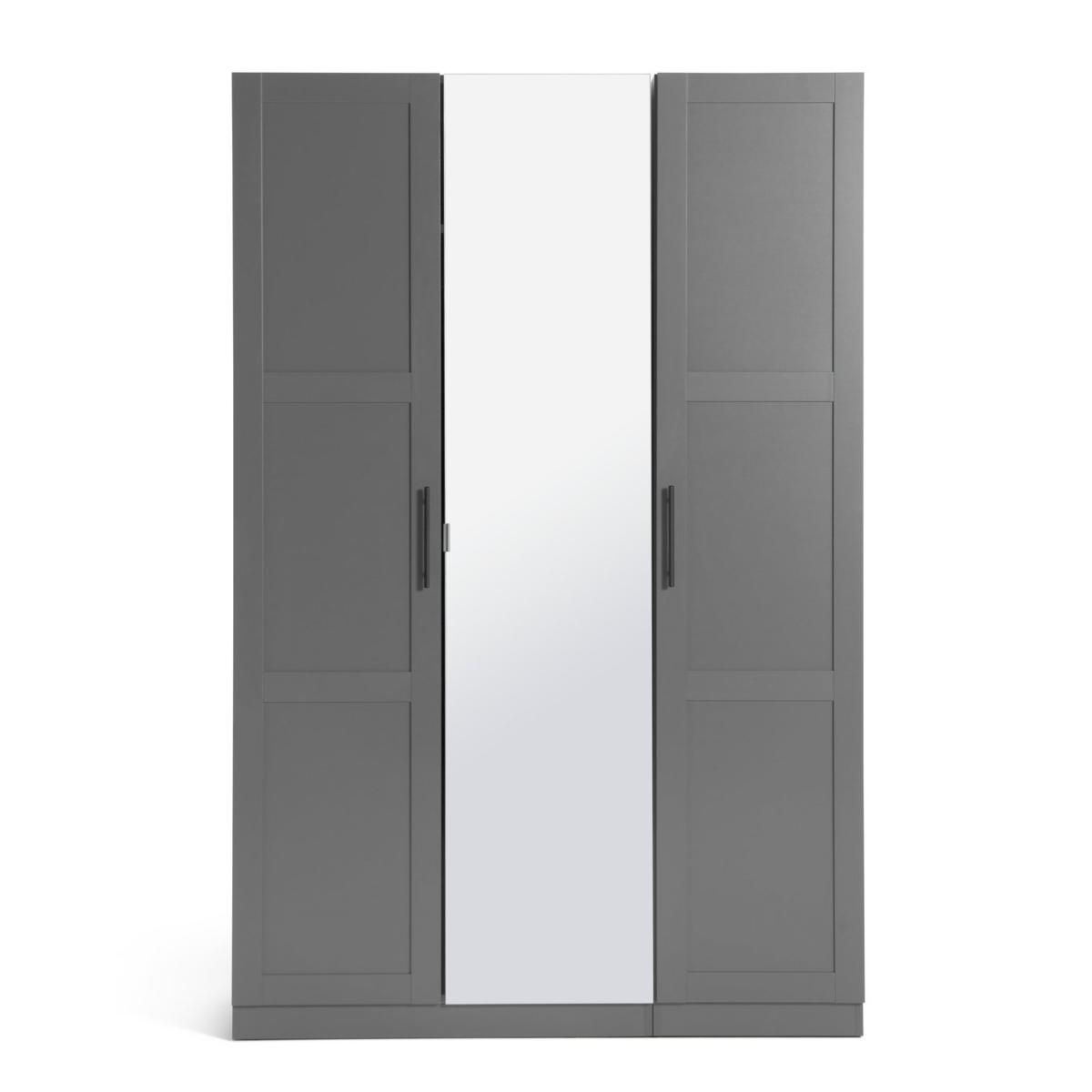 Good things come in threes. Take this smart, 3 door mirrored wardrobe. Inspired by the calm, uncluttered Shaker style, it has a pristine, anthracite finish. Ideal for contemporary spaces. Inside there's plenty of hanging space for shirts, sweaters, jeans and jackets. Plus a couple of handy shelves for shoes and bags. Check out the full length mirror and sleek, steel handles. Super smart all round.