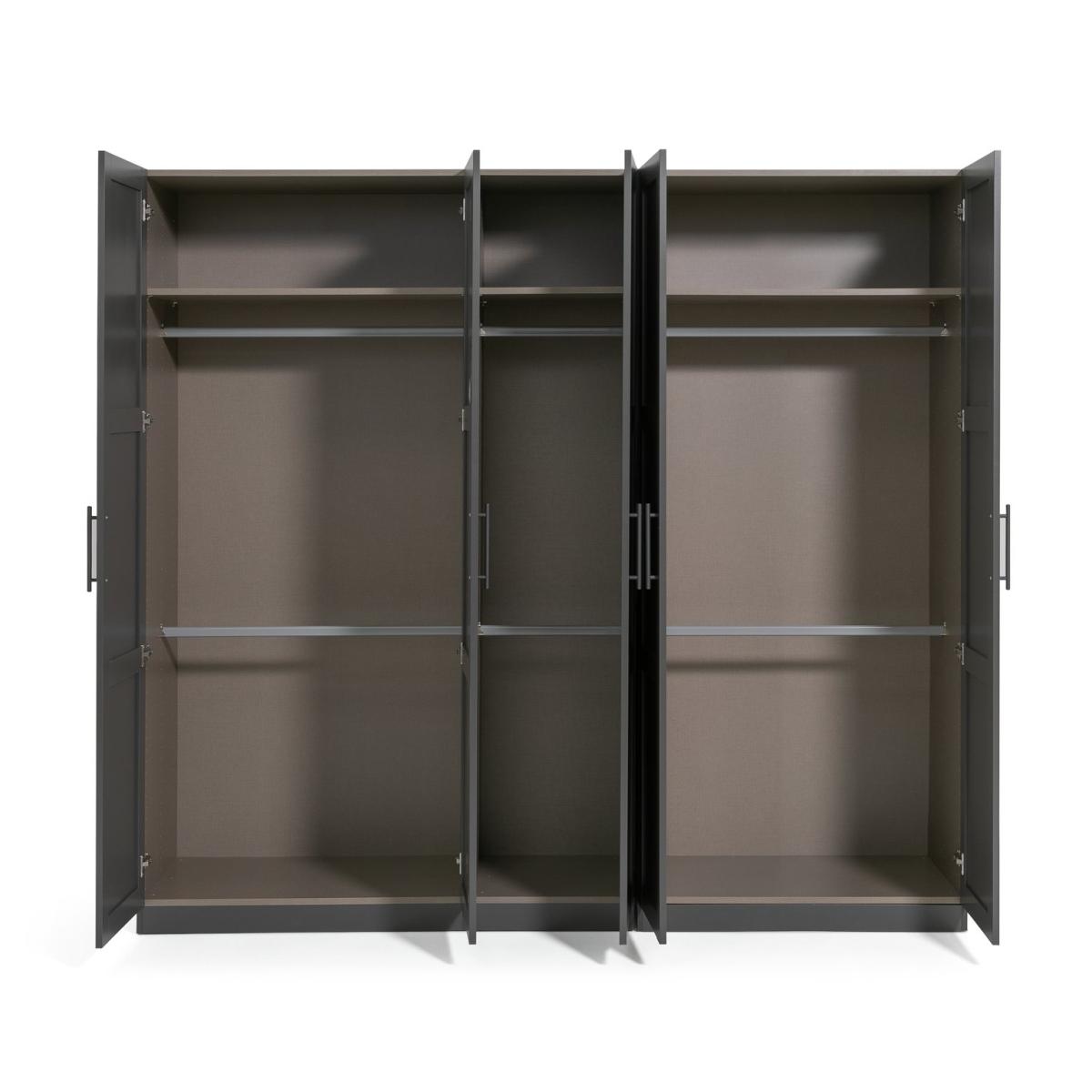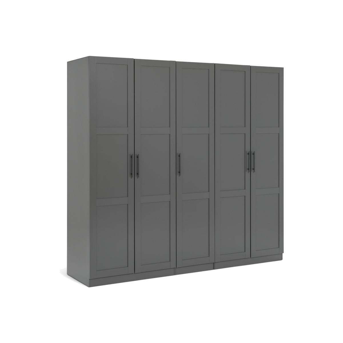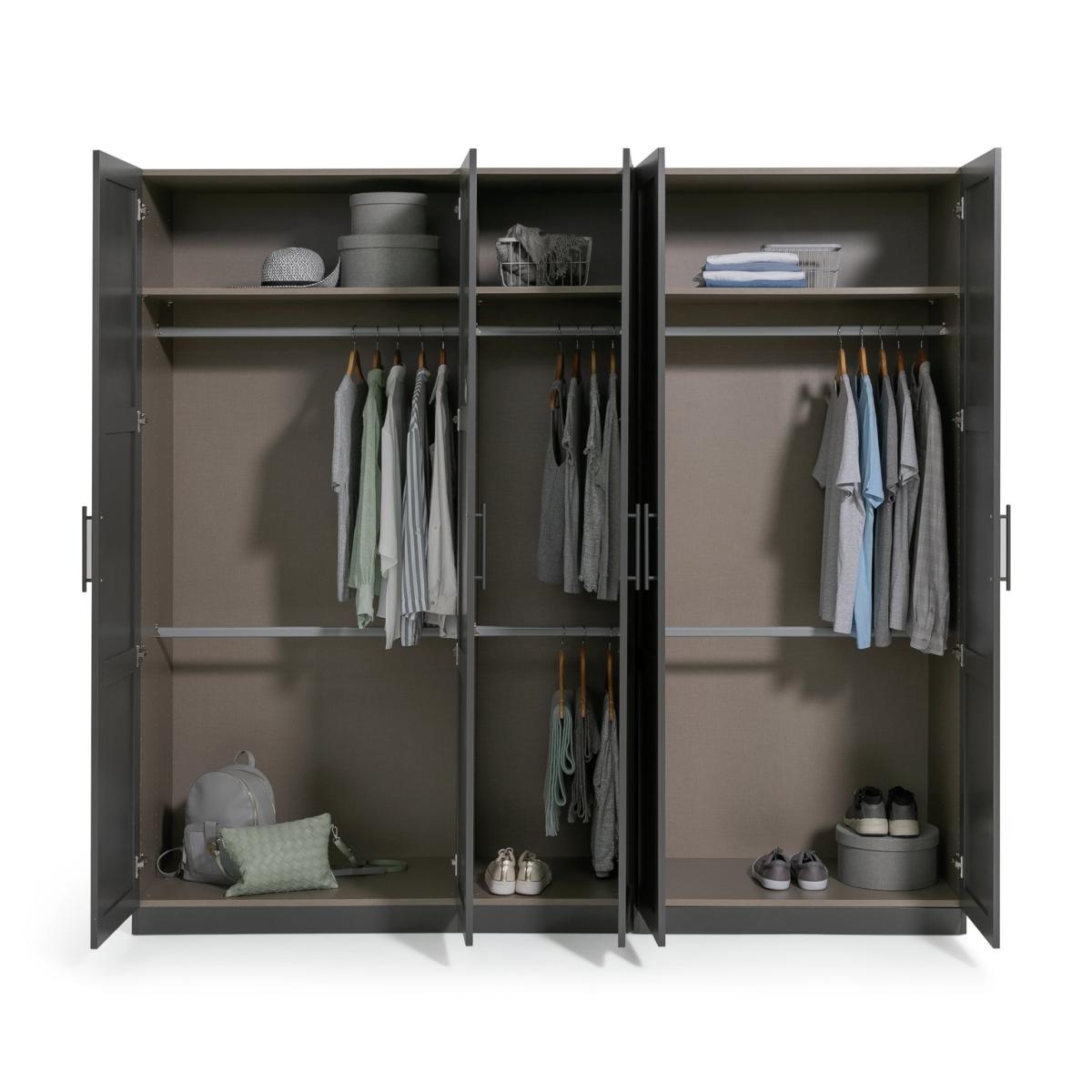 Say hello to our storage super star. This anthracite 5 door wooden wardrobe is inspired by the calm, uncluttered Shaker style. An ideal design for contemporary bedrooms. It's finished with sleek metal handles and a smart wooden plinth. Nice touch. The roomy interior gives you bags of space and storage options. Effortless elegance? Oh yes.