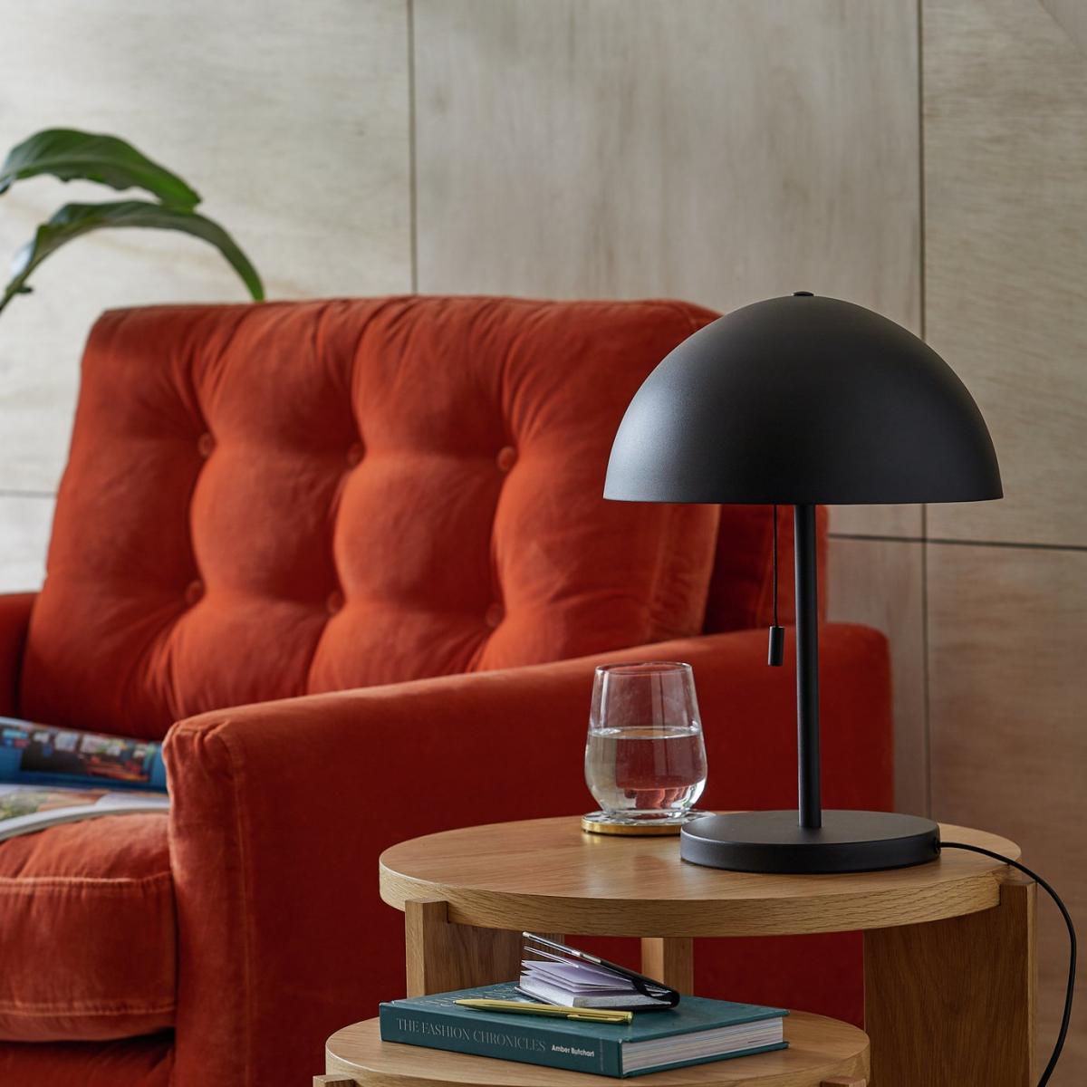 Got designer leanings? Like a sprinkling of vintage with a thoroughly modern look? Then bingo. You'll love our in-house designed mushroom table lamp. With a classic dome, it casts a warm ambient light to create a mellow mood. And just like the 70s originals, it features a pull cord switch. A real statement piece off or on. What's great is you can also repurpose your lamp around the home from hallway to the bedside table. A style icon looks good anywhere. Available in a variety of colours so you can pick the perfect one for you. Dimensions: Overall size H40.14, Diameter 27cm. Shade size H14.6, D27cm. Diameter of base 18cm. Cord length 1.8m. Bulb Information: Bulbs required 1 x golfball E27 edison screw LED bulb(s) (not included). Recommended maximum wattage: 10 watts. General Information: Shade colour: black. Base colour: black. Shade material: metal. Base material: metal. Pull switch. IP rating 20 - not suitable for bathroom use. Minimal assembly. This lighting product is a class 2 fitting. Mushroom. Manufacturer's 1 year guarantee.