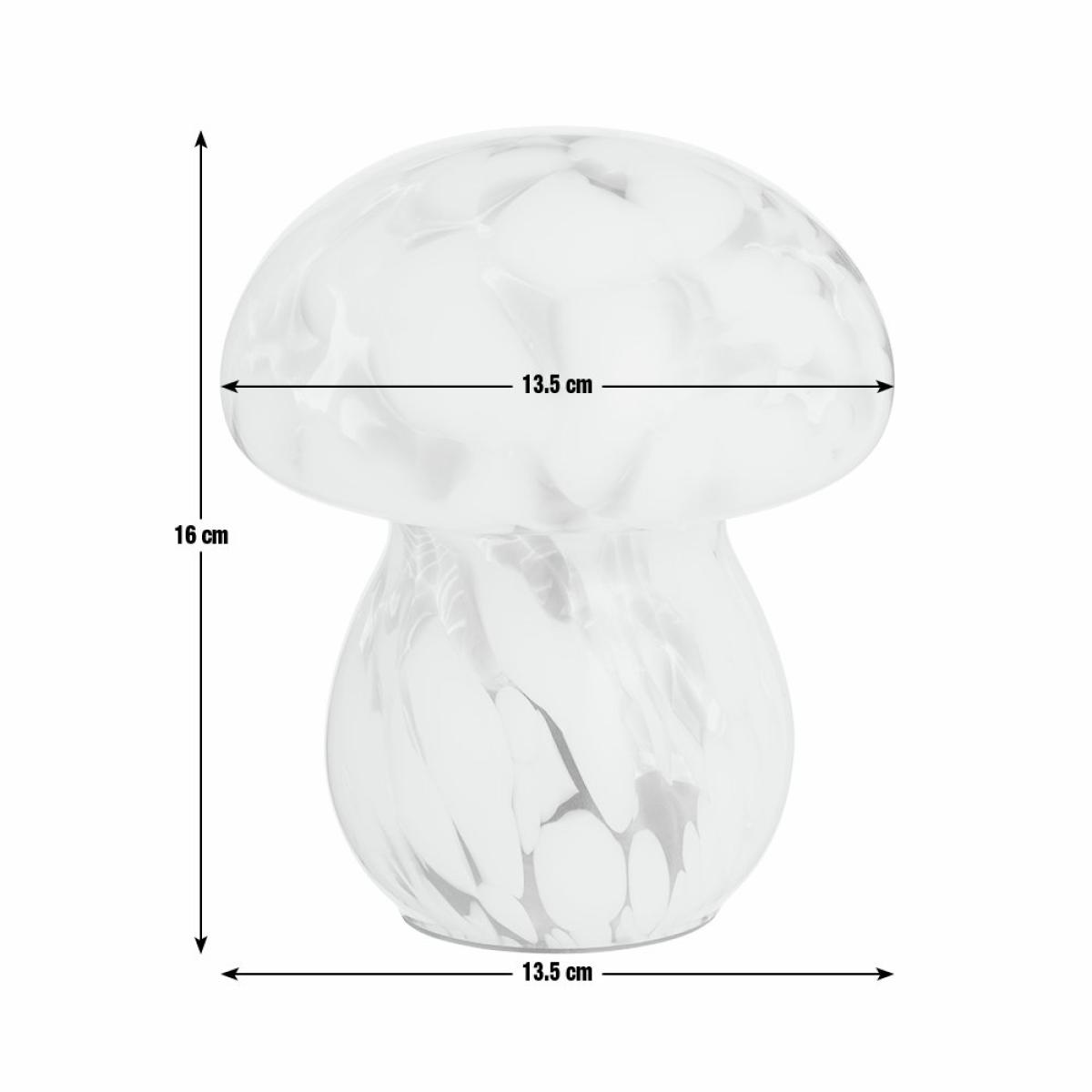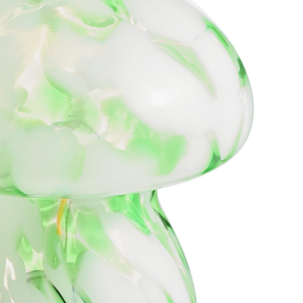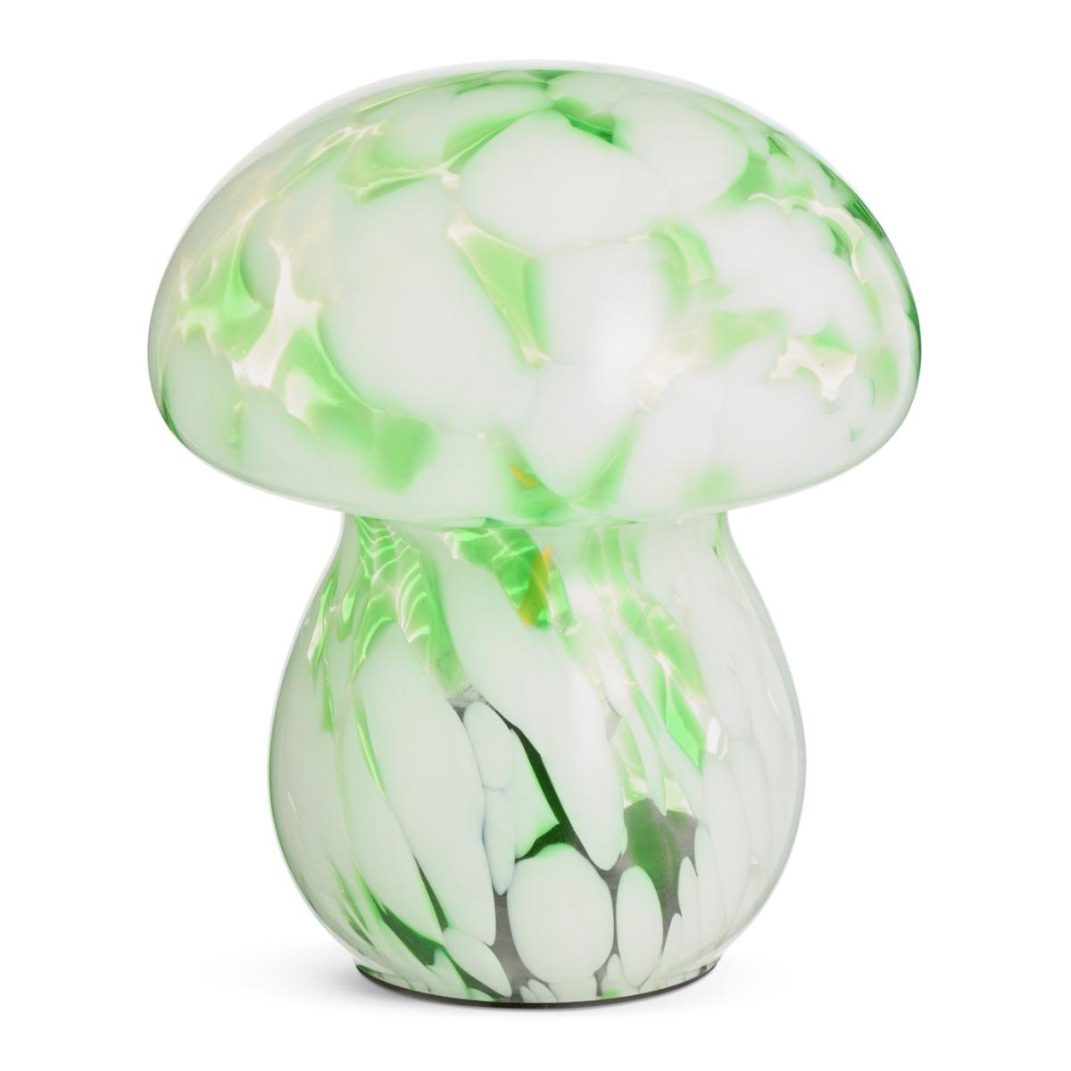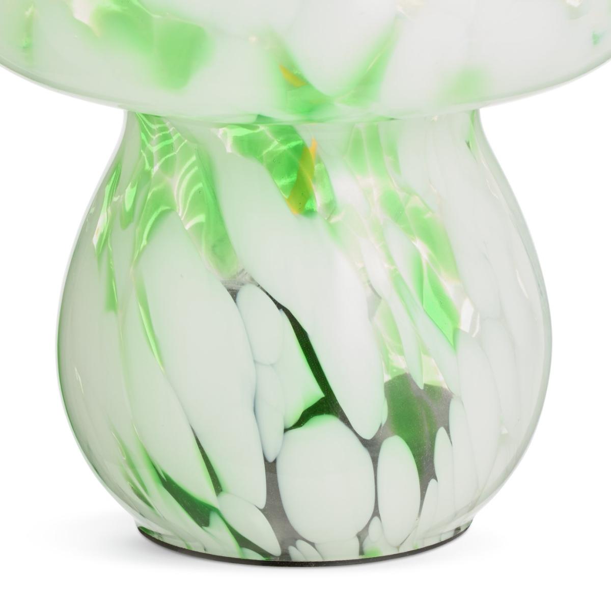 A bold little scene-stealer. Our mushroom-shaped lamp is a charming nod to retro 70's design. Crafted in swirling green confetti glass, each lamp is unique. Switch on and this light emits a soft ambient glimmer wherever a glow up is needed. Powered by 2 x AAA 1.5V batteries. Dimensions: Overall size H16, W13.5cm. Diameter 13.5cm. Bulb Information: LED bulb only. Colour rendering index 82. Colour temperature 2700. K. Rated luminous flux 40. General Information: Shade colour: green and white. Base colour: green and white. Shade material: glass. Base material: plastic. IP rating 20. Fully assembled. Product is battery powered. This lighting product is a class 3 fitting. Manufacturer's 1 year guarantee.