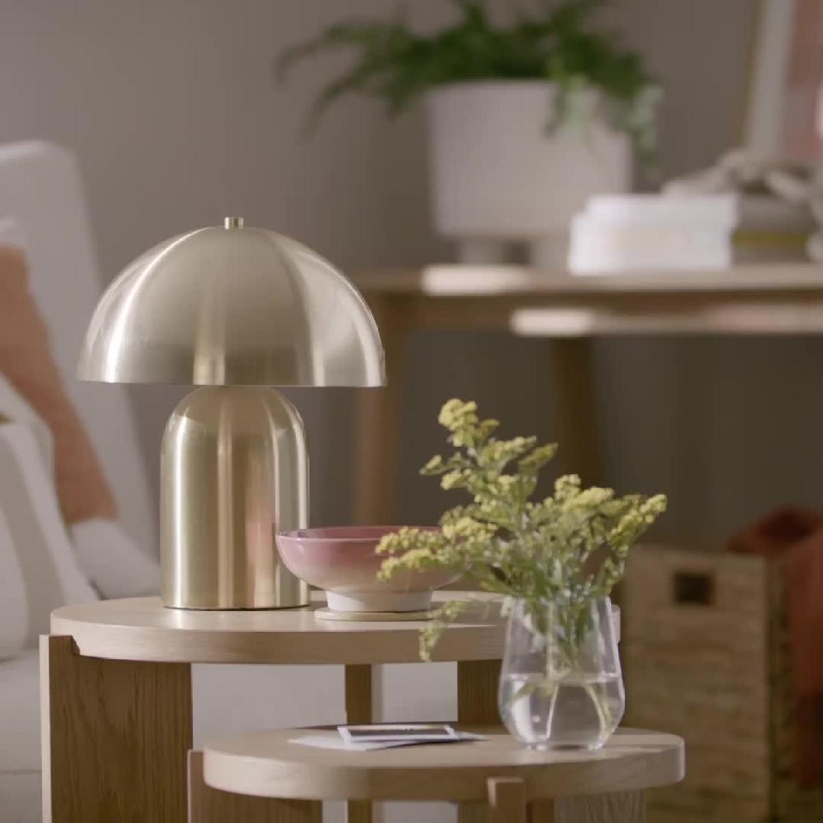 Let a modern metallic mushroom light up your life. On or off, our golden, curvaceous table lamp demands attention. Made from solid steel with a satin brass finish, it's pure gilded glamour. A sculptural piece that's born to shine. Metallic accents are a quick and easy way to make a style statement; we love them. Dimensions: Overall size H32, Diameter 25cm. Shade size H12.5, D25cm. Diameter of base 12cm. Cord length 1.8m. Bulb Information: Bulbs required 1 x golfball E27 edison screw filament LED bulb(s) (not included). Recommended maximum wattage: 7 watts. (bulb not included). LED bulb only. General Information: Shade colour: brass. Base colour: brass. Shade material: steel. Base material: steel. In-line switch. IP rating 20 - not suitable for bathroom use. Minimal assembly. Product is mains powered plug in. This lighting product is a class 2 fitting. Habitat. Manufacturer's 1 year guarantee.