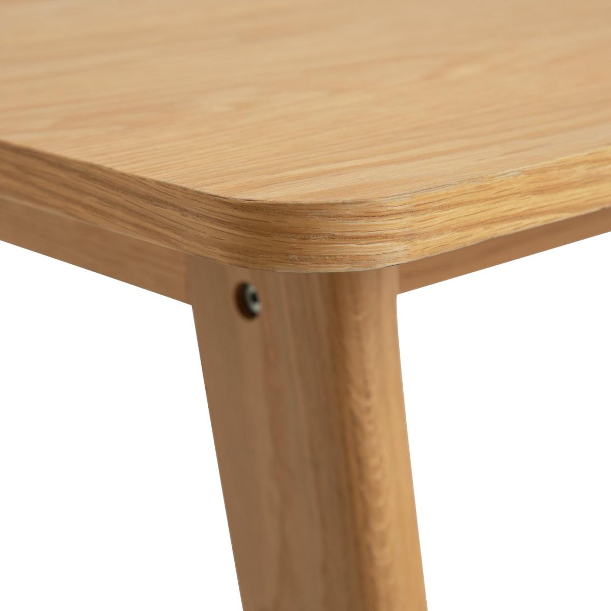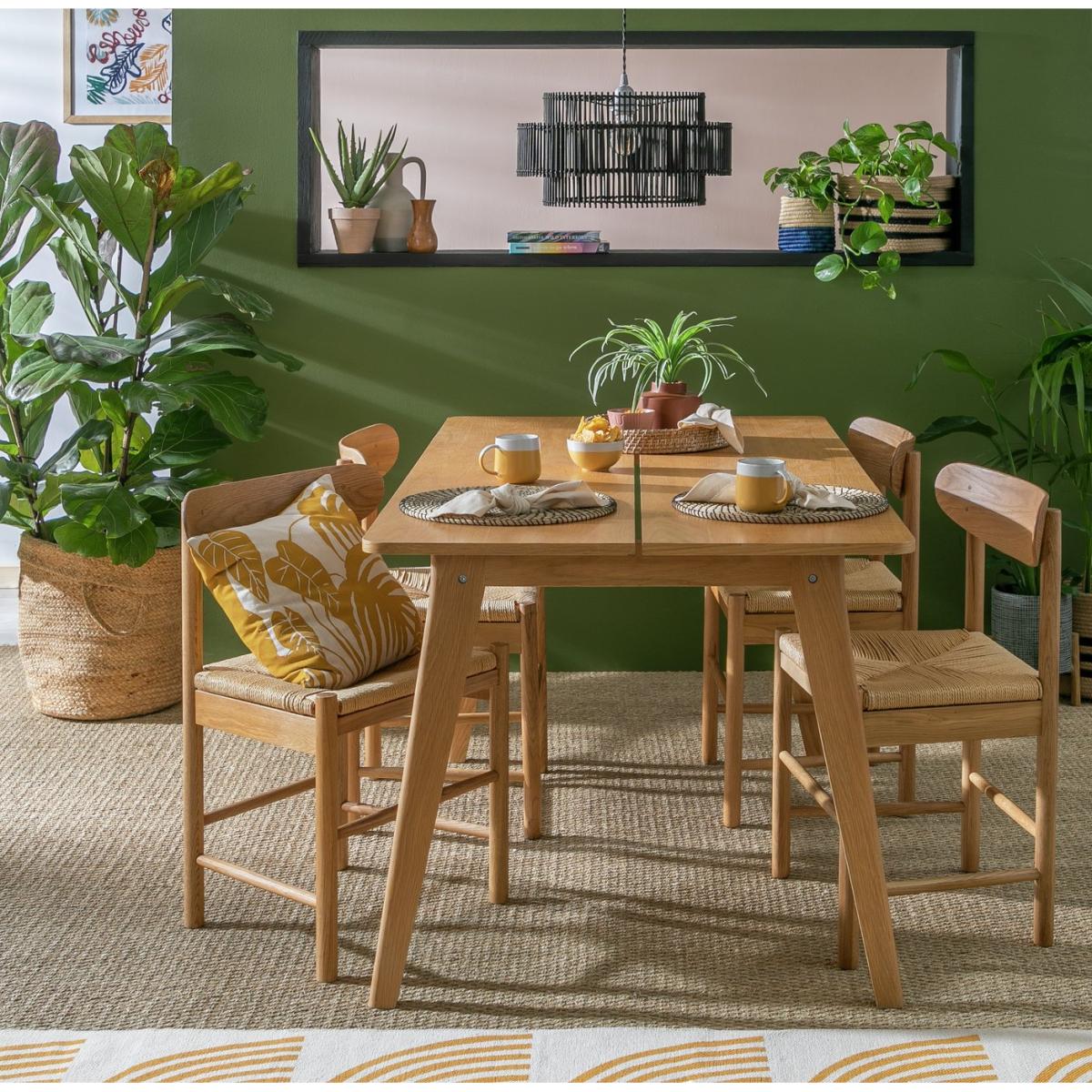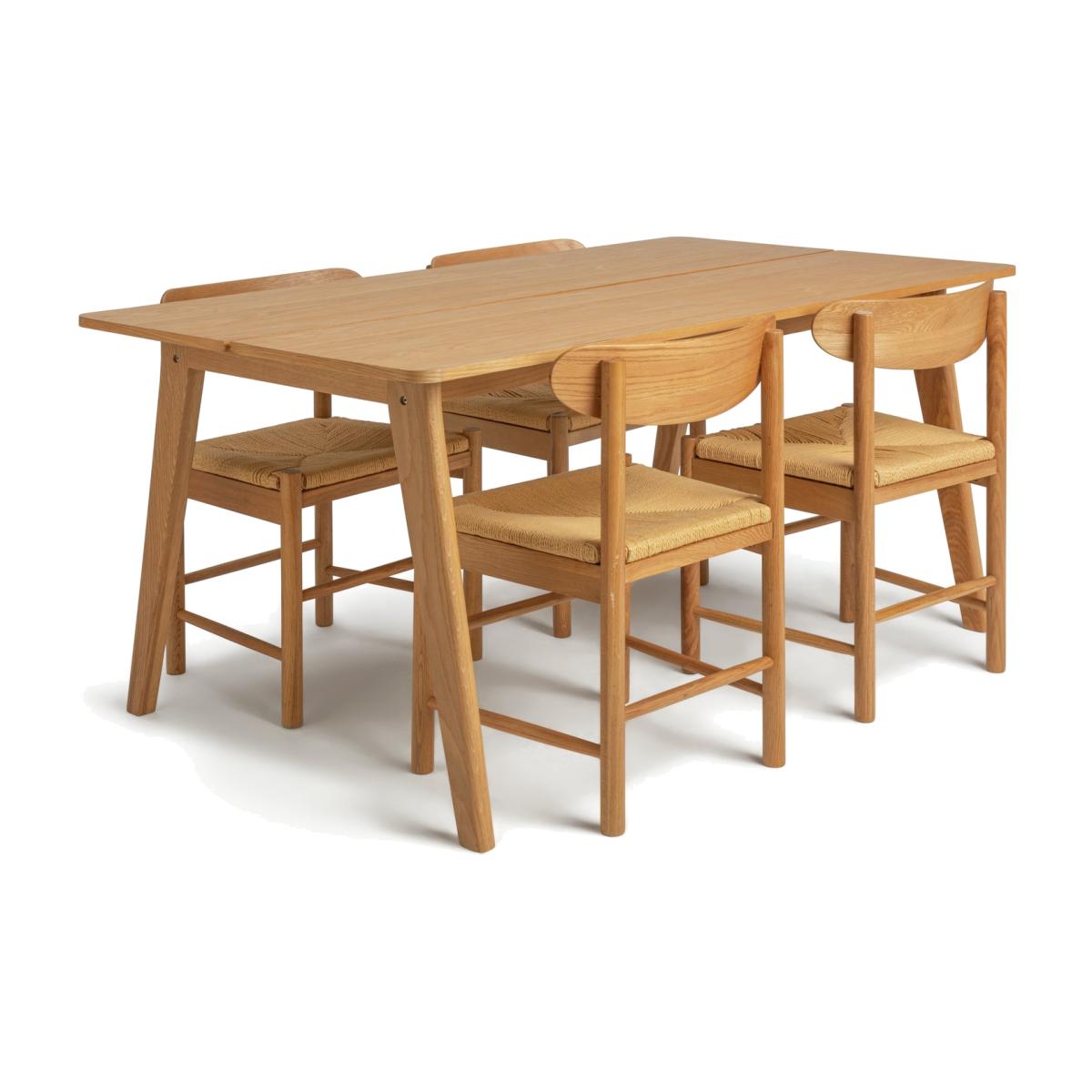 Classic country dining. Our 4 seater dining table and chairs set is made for a relaxing breakfast, lunch and dinner. The smart table has clean, simple lines and gently tapered legs. With a wood veneered top, it's modern, yet with a comfortably traditional feel. And speaking of comfort. The 4 light wood dining chairs are crafted from solid oak with a natural woven seat pad. Settling in for seconds? Why not.