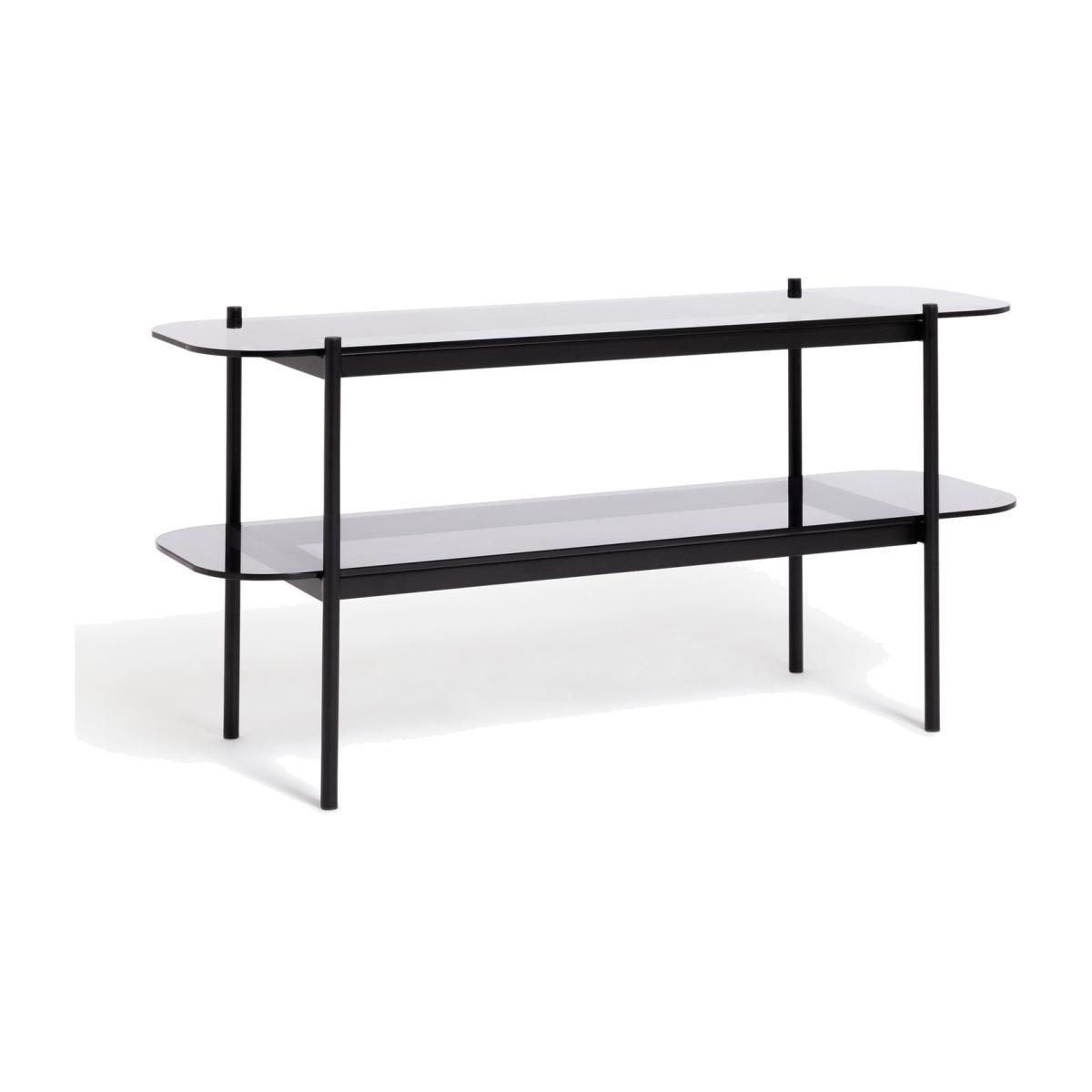 For your viewing pleasure. Smarten up your entertainment area with our Neo shelving unit. Two shelves of black tempered glass sit atop matte black metal tube legs for a sleek, modern look. The perfect size for compact spaces, yet big enough to sit your flat screen TV on top. And its clean lines and dark silhouette fit in perfectly with any interiors design style. The units can also be multipurposed and also be used as Tv units.
