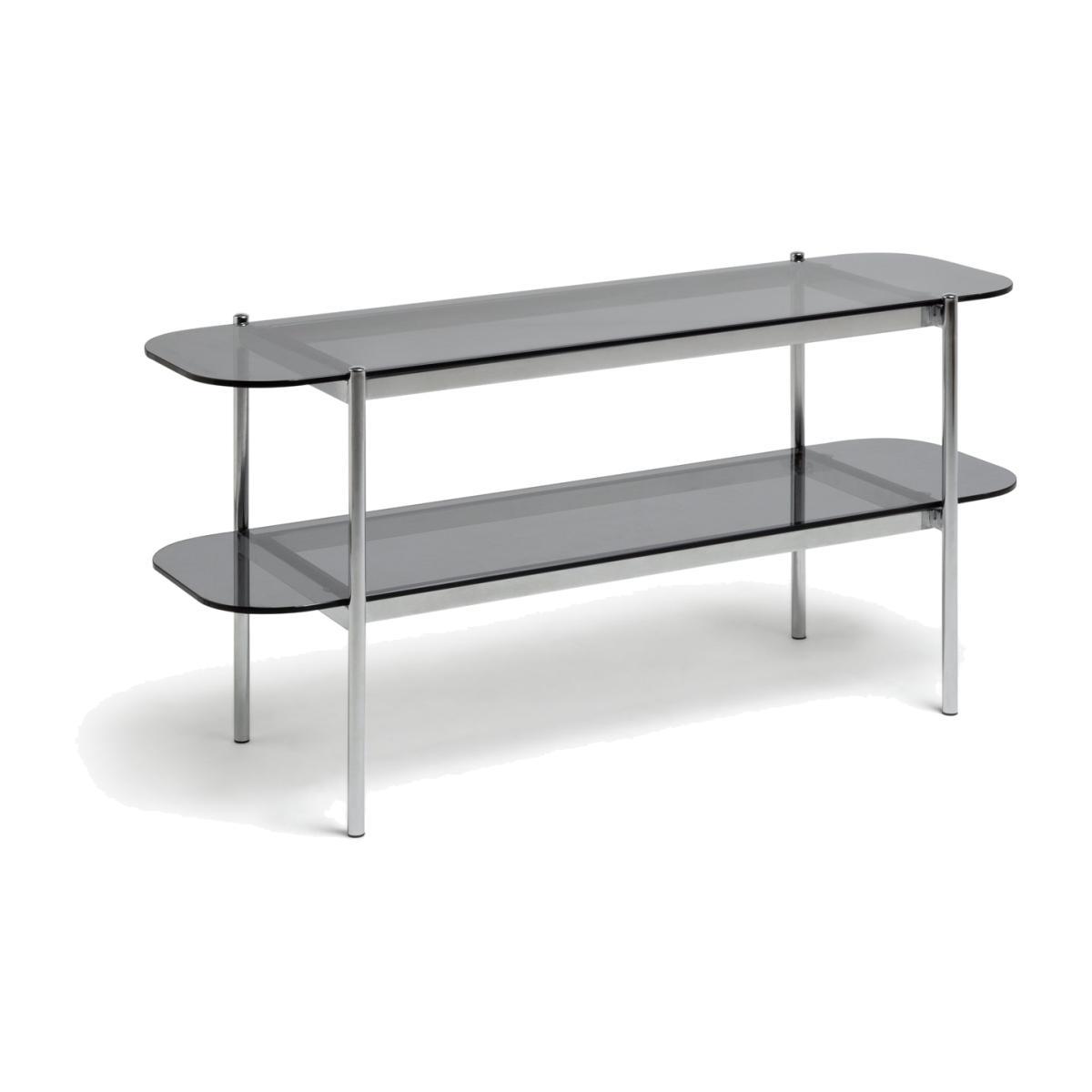 For your viewing pleasure. Smarten up your entertainment area with our Neo shelving unit. Two shelves of black tempered glass sit atop chrome tube legs for a sleek, modern look. The perfect size for compact spaces, yet big enough to sit your flat screen TV on top. And its clean lines and metallic look fit in perfectly with any interiors design style. The units can also be multipurposed and also be used as TV units. Tidy up. The bottom shelf is perfect for resting digital boxes or gaming consoles, freeing up precious floor space. And the open back provides easy cable access. Create a stylish display with candles, books or small potted plants and transform your lounge. The only problem now will be deciding what to watch. Part of the Neo collection. Made from metal and tempered glass with a glass finish. Collect in store today. Size H 52, W 110, D 36.5cm. Weight 17.2kg. 2 shelves. 1 media storage section. Largest height of media equipment sections 24cm. Easy cable access. Suitable for screen sizes up to 42in. Maximum weight of TV 75kg. Self-assembly - 2 people recommended.