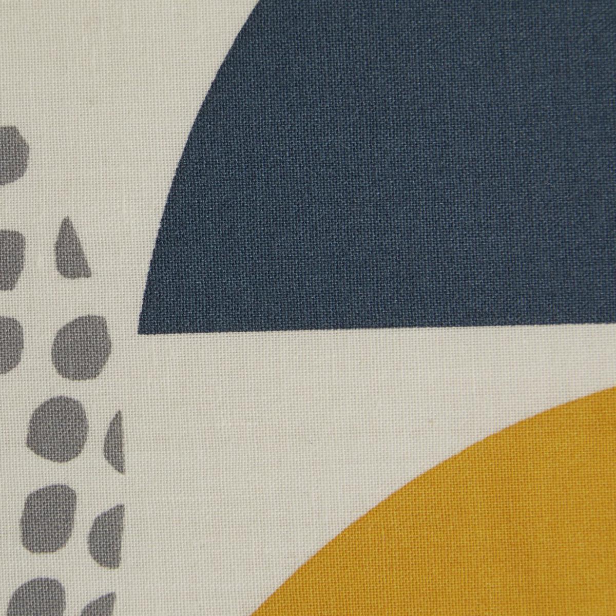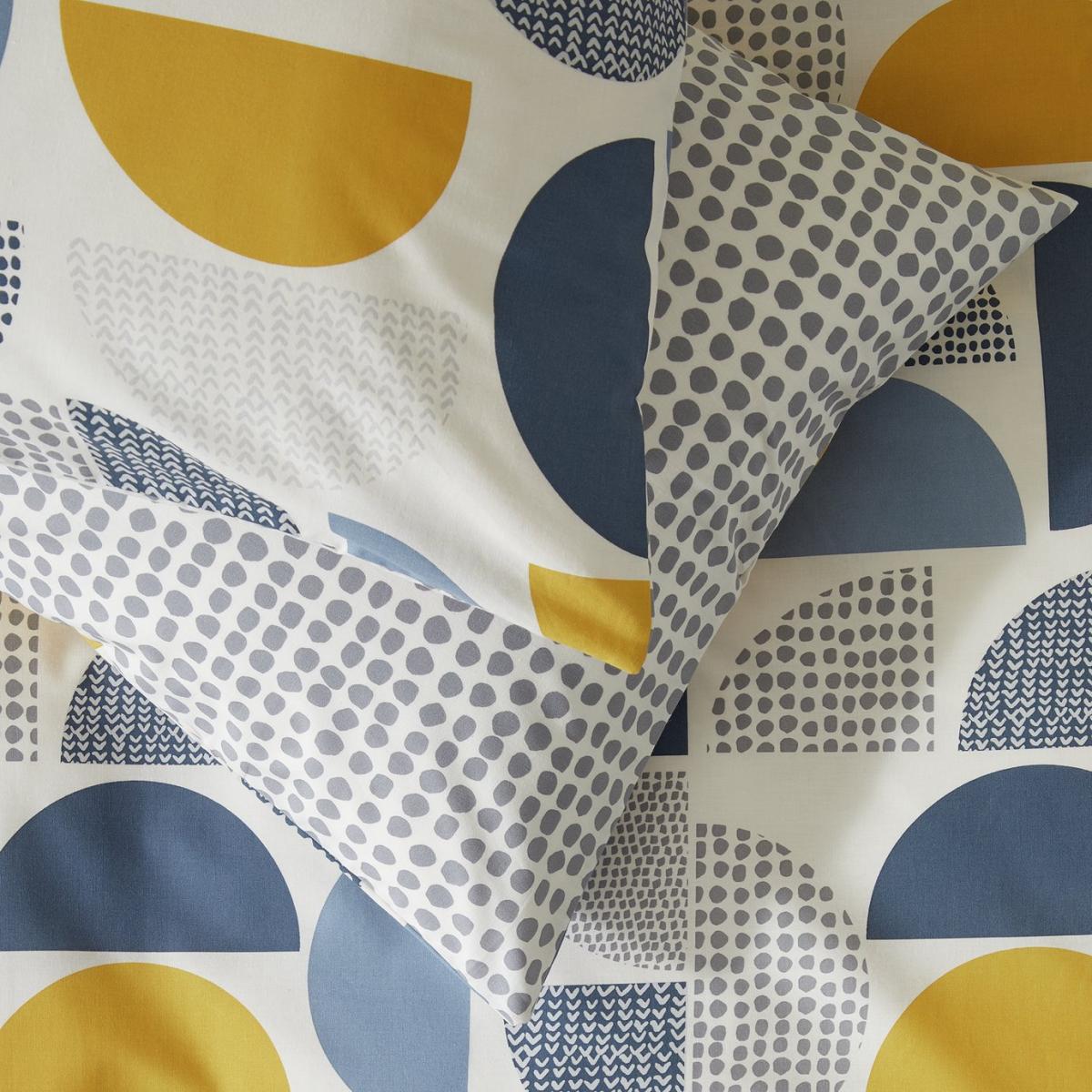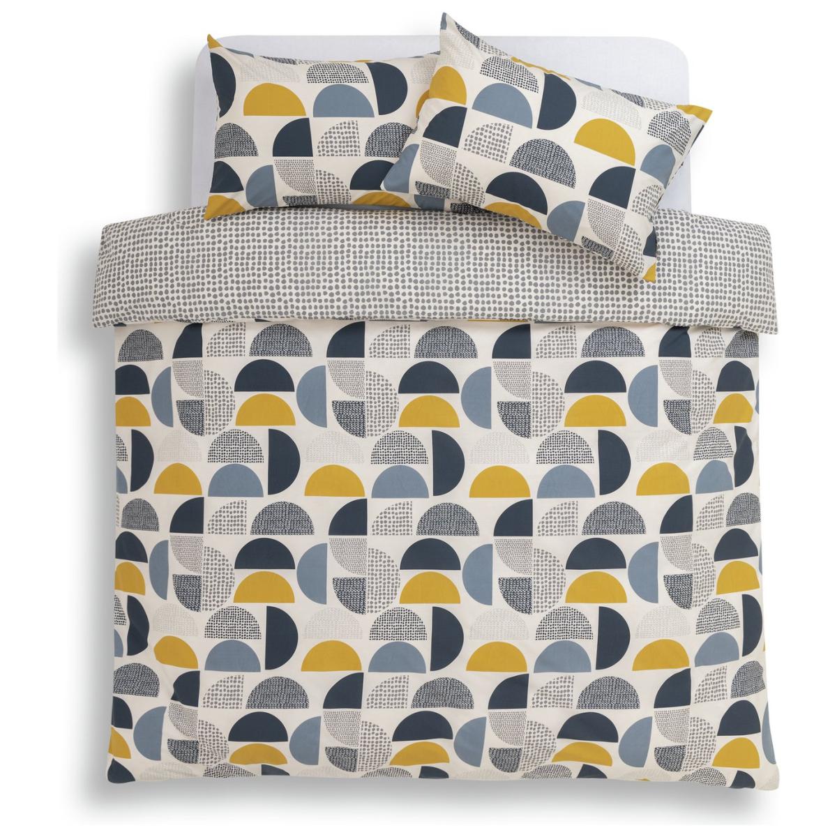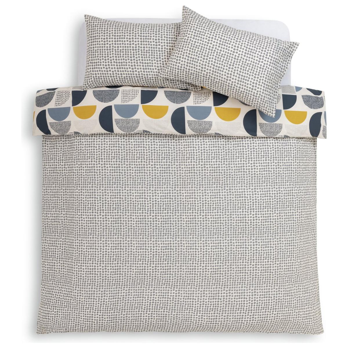 Geo-tastic. Love the way this bedding set picks up on mid-century style. With its bold colours and crescent shapes. It'll certainly bring a bedroom bang up to date with its modern vintage look. And when you've had enough of the bright side, flip it to the grey side. Soothing, muted and calm. Contemporary Colours. This item carries the STANDARD 100 by OEKO-TEX logo, which means you can be certain that every component has been tested for harmful substances and is therefore harmless to human health. Finish: woven. 52% recycled polyester , 48% cotton. 144 thread count. Set includes 1 duvet cover and 2 pillowcases. Bed size: king size. Length 220cm, Width 230cm. Normal confection edging detail. Reversible. Buttons for fastening. Standard pillowcase (s). Pillow case length 75cm, Width 50cm. Reversible pillowcase (s). Machine washable at 40 C. Suitable for tumble drying.