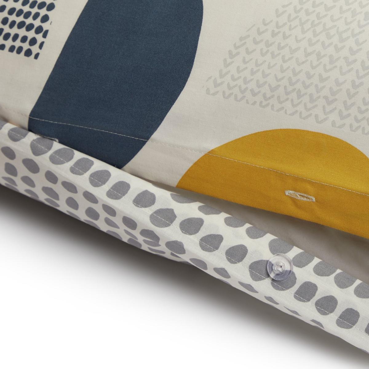 Geo-tastic. Love the way this bedding set picks up on mid-century style. With its bold colours and crescent shapes. It'll certainly bring a bedroom bang up to date with its modern vintage look. And when you've had enough of the bright side, flip it to the grey side. Soothing, muted and calm. Contemporary Colours. This item carries the STANDARD 100 by OEKO-TEX logo, which means you can be certain that every component has been tested for harmful substances and is therefore harmless to human health. Finish: woven. 52% recycled polyester , 48% cotton. 144 thread count. Set includes 1 duvet cover and 2 pillowcases. Bed size: super king. Length 220cm, Width 260cm. Normal confection edging detail. Reversible. Buttons for fastening. Standard pillowcase (s). Pillow case length 75cm, Width 50cm. Reversible pillowcase (s). Machine washable at 40 C. Suitable for tumble drying.