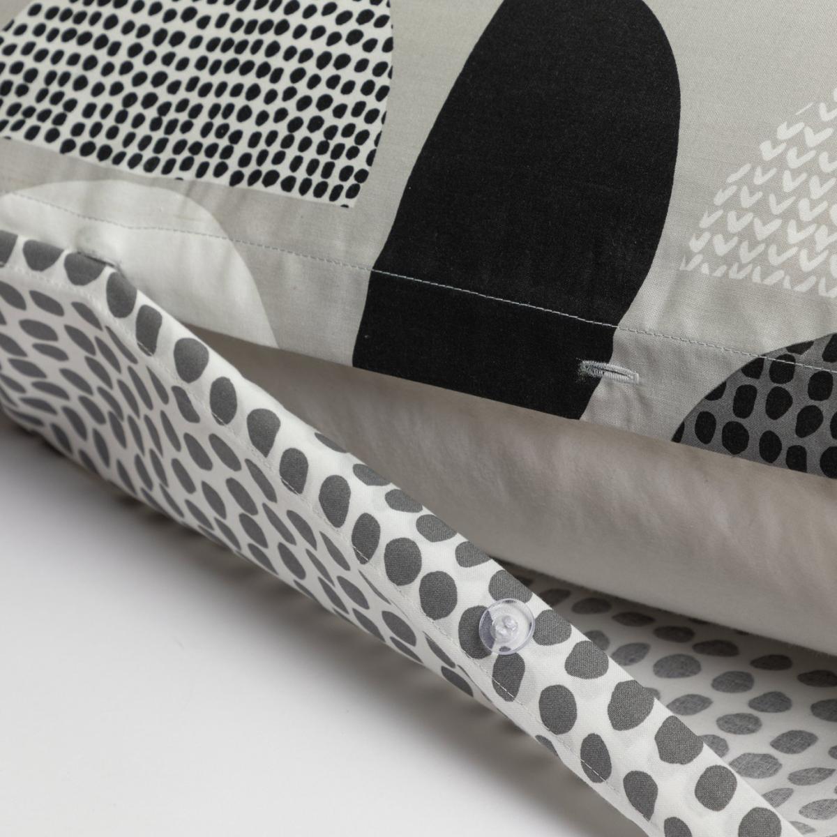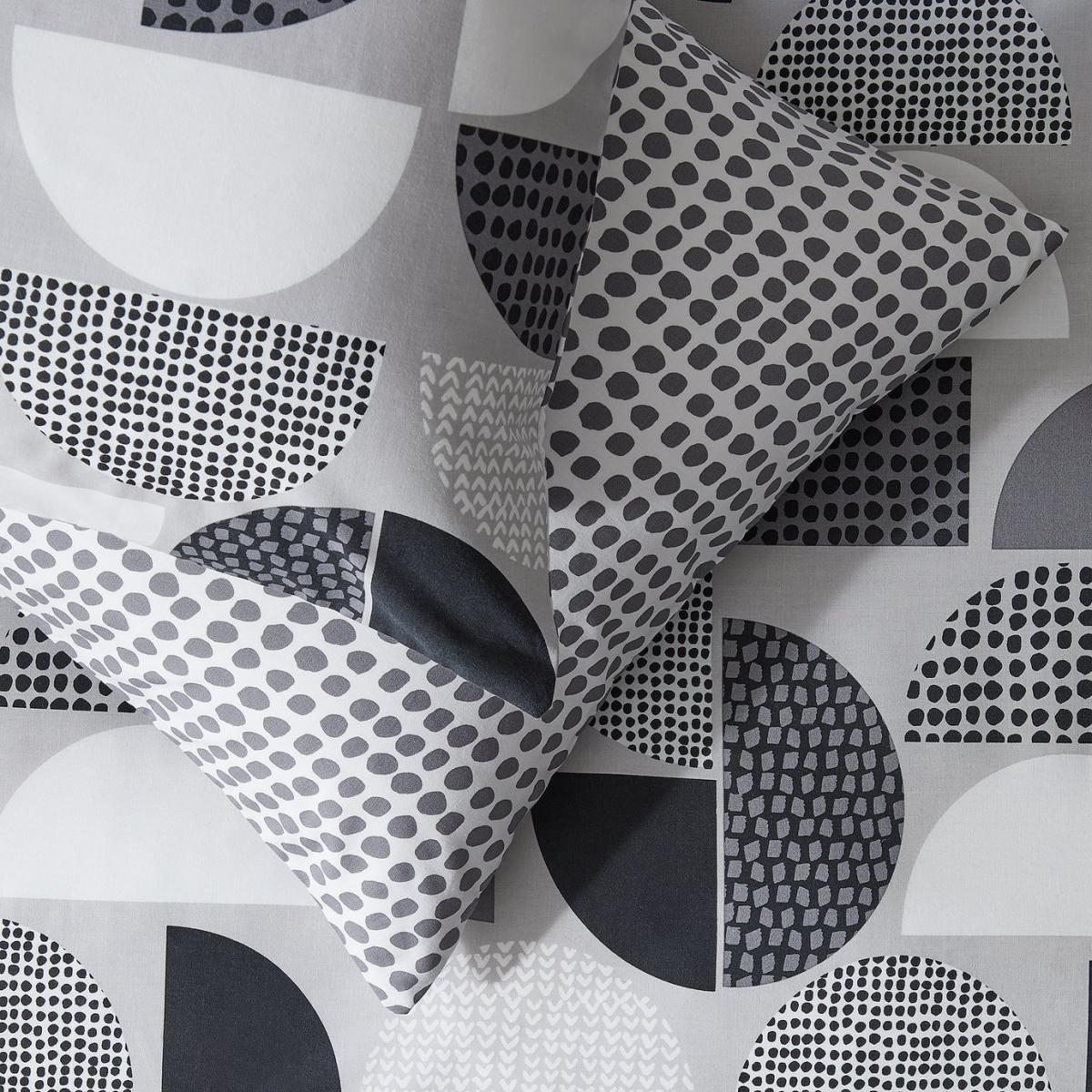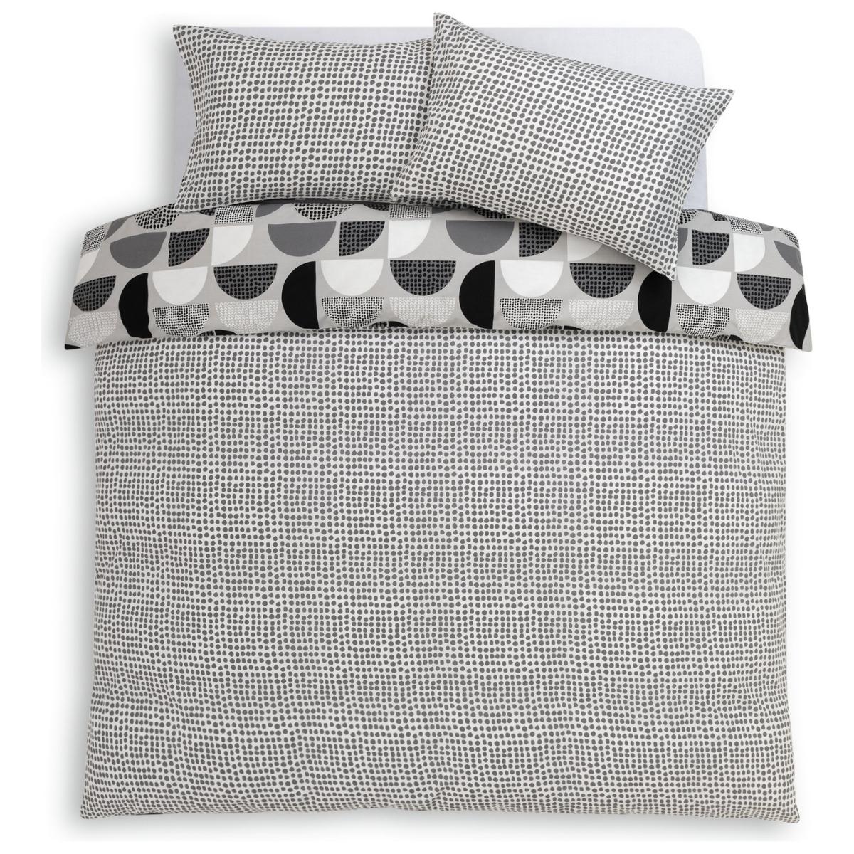 Geo-tastic. Love the way this bedding set picks up on mid-century style. With its bold monochrome and crescent shapes. It'll certainly bring a bedroom bang up to date with its modern vintage look. And when you've had enough of the dramatic side, flip it to the gentle side. Soothing, muted and calm. Contemporary Colours. This item carries the STANDARD 100 by OEKO-TEX logo, which means you can be certain that every component has been tested for harmful substances and is therefore harmless to human health. Finish: woven. 52% recycled polyester , 48% cotton. 144 thread count. Set includes 1 duvet cover and 2 pillowcases. Bed size: double. Length 200cm, Width 200cm. Normal confection edging detail. Reversible. Buttons for fastening. Standard pillowcase (s). Pillow case length 75cm, Width 50cm. Reversible pillowcase (s). Machine washable at 40 C. Suitable for tumble drying.