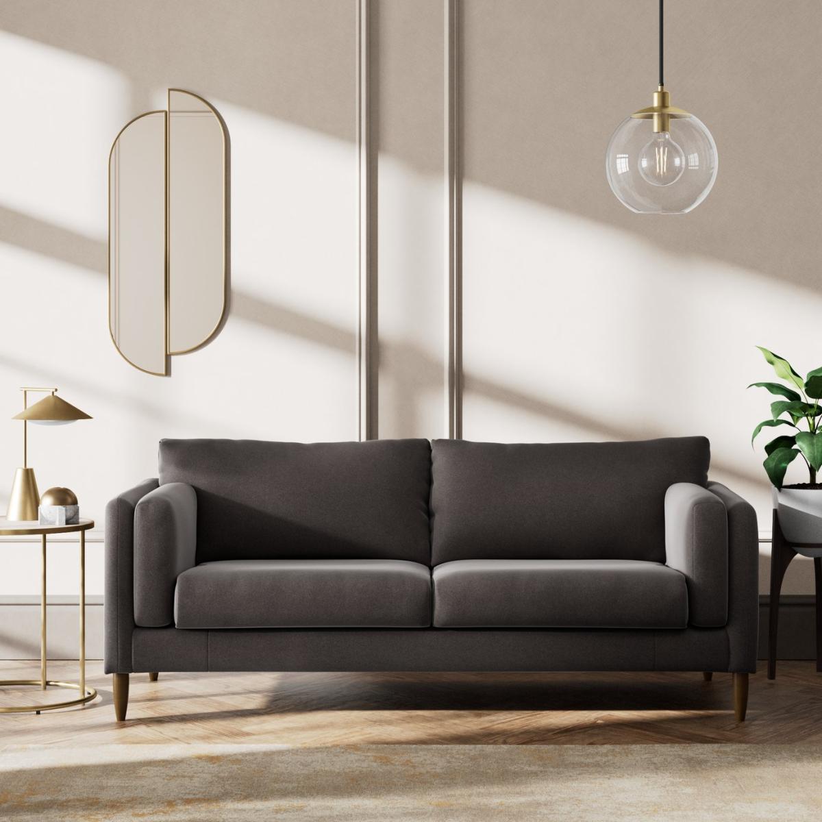 When it's made for you, you know you'll love it. The Newington is a contemporary 3-seater sofa with excellent credentials. It combines a modern linear design with plenty of cushioned comfort. There's even a smart pair of slim side bolsters to nestle against. Upholstered in rich velvet, The Newington has a luxe look. While wooden turned legs add the finishing touch. Offering relaxed comfort, the Newington's reversible seat cushions use high density foam core wrapped in soft fibre wadding to create the perfect balance of support, durability and recovery. Hand made to order in the UK, the Newington uses quality materials and traditional techniques for furniture that's unique to you. Available in a choice of sizes and fabrics including Aquaclean technology protection built into the yarn, which is easy to clean with just water. Part of the Newington collection. Material: Made from 100% recycled polyester. Wooden feet - dark wood. Removable seats with foam fibre wrap filling. Removable cushion(s) with foam fibre wrap filling. Free fabric swatch available on this line. Dimensions: Size H82, W195, D88cm. Floor to seat height: 47cm. Depth of seat: 55cm. Height of seat back: 40cm. Width of seating area between arms: 154cm. Height of arm rest: 68cm. Weight: 48kg. Packaged dimensions: Package size H57, W200, D93cm. General information: FSC certified meaning the materials used for this product are responsibly sourced. We do more than deliver your product, we unpack, set it up and take away the packaging. Manufactured in the UK using components sourced globally. Professional clean only. Plump cushions regularly to maintain shape. Manufacturer's 15 year frame guarantee.